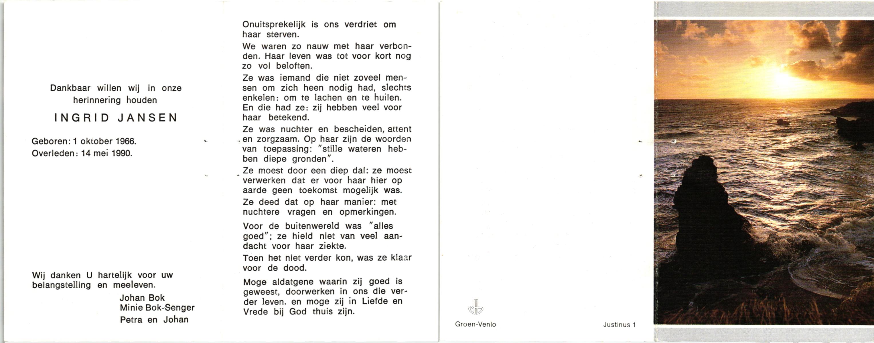 JANSEN, , Ingrid, geboren op 1-10-1966, overleden op 14-5-1990 op 23-jarige leeftijd.