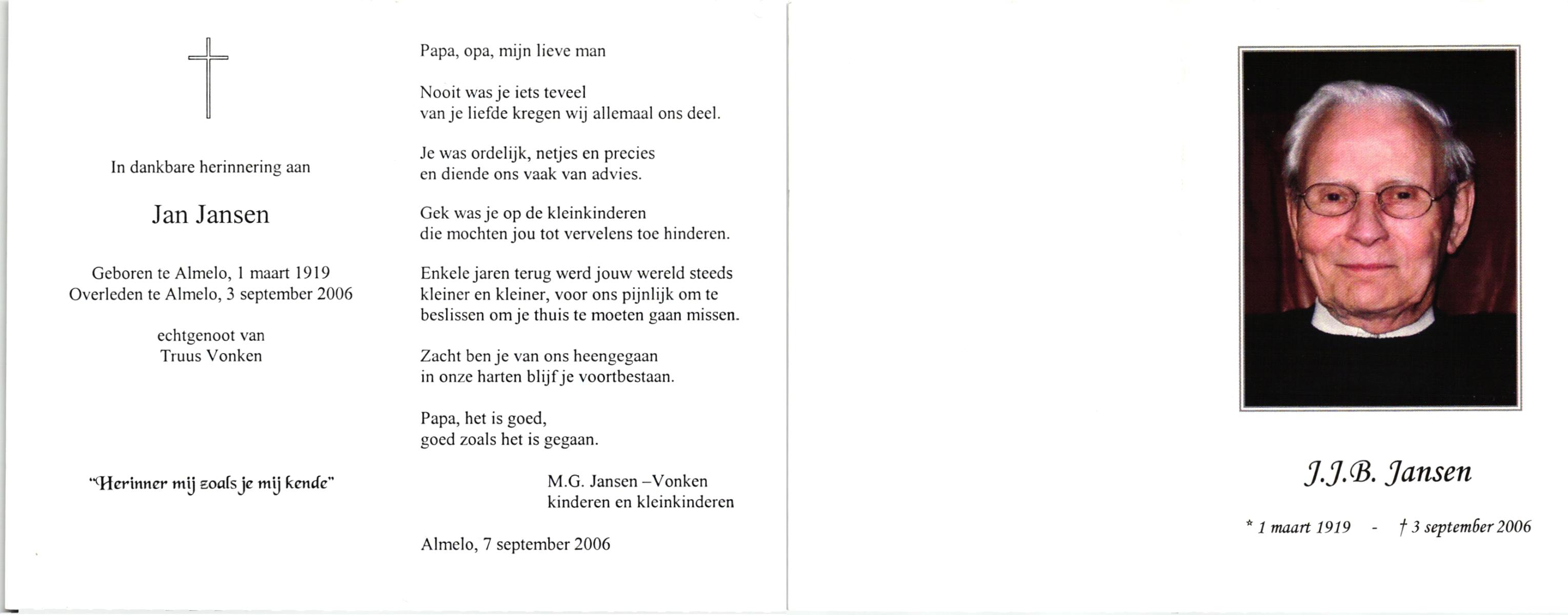 JANSEN, , J.J.B. (Jan), geboren op 1-3-1919 te Almelo, overleden op 3-9-2006 te Almelo op 87-jarige leeftijd.