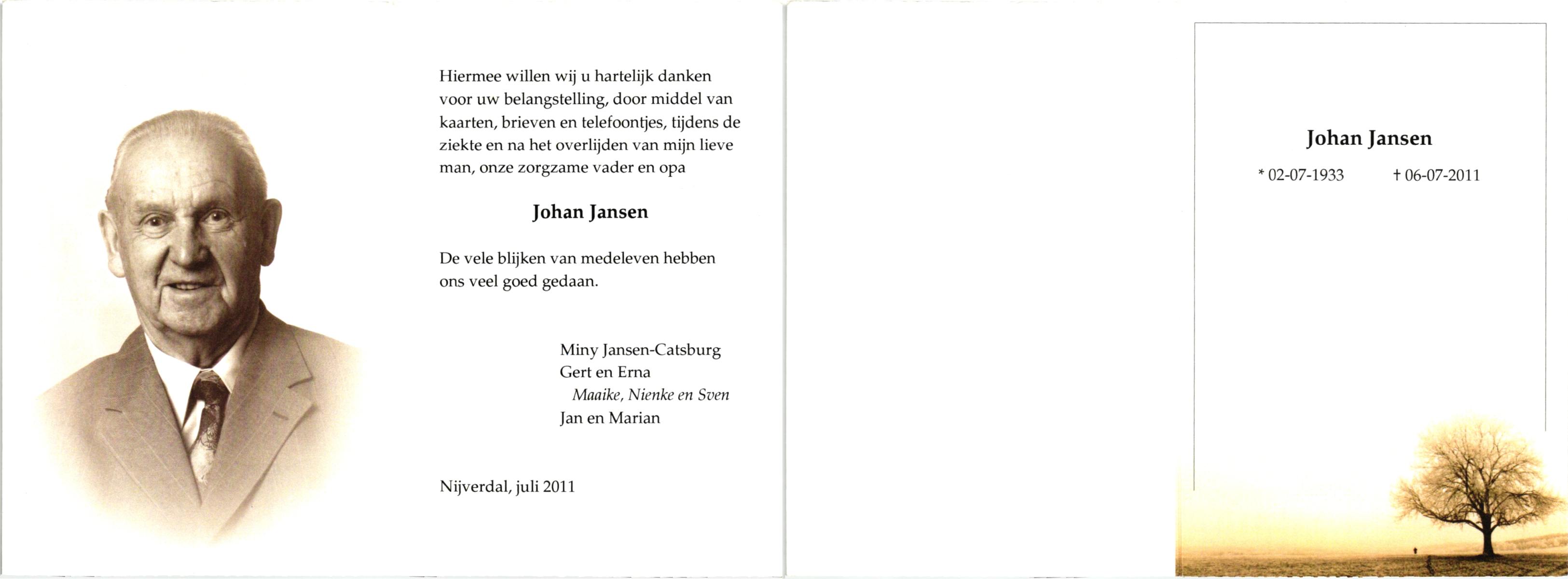 JANSEN, , Johan, geboren op 2-7-1933, overleden op 6-7-2011 te Hellendoorn, Nijverdal op 78-jarige leeftijd.