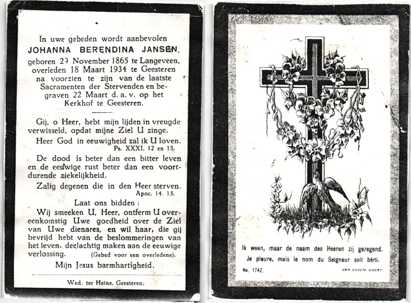 JANSEN, , Johanna Berendina, geboren op 23-11-1865 te Langeveen, overleden op 18-3-1934 te Geesteren op 68-jarige leeftijd, begraven op 22-3-1934 te Geesteren.