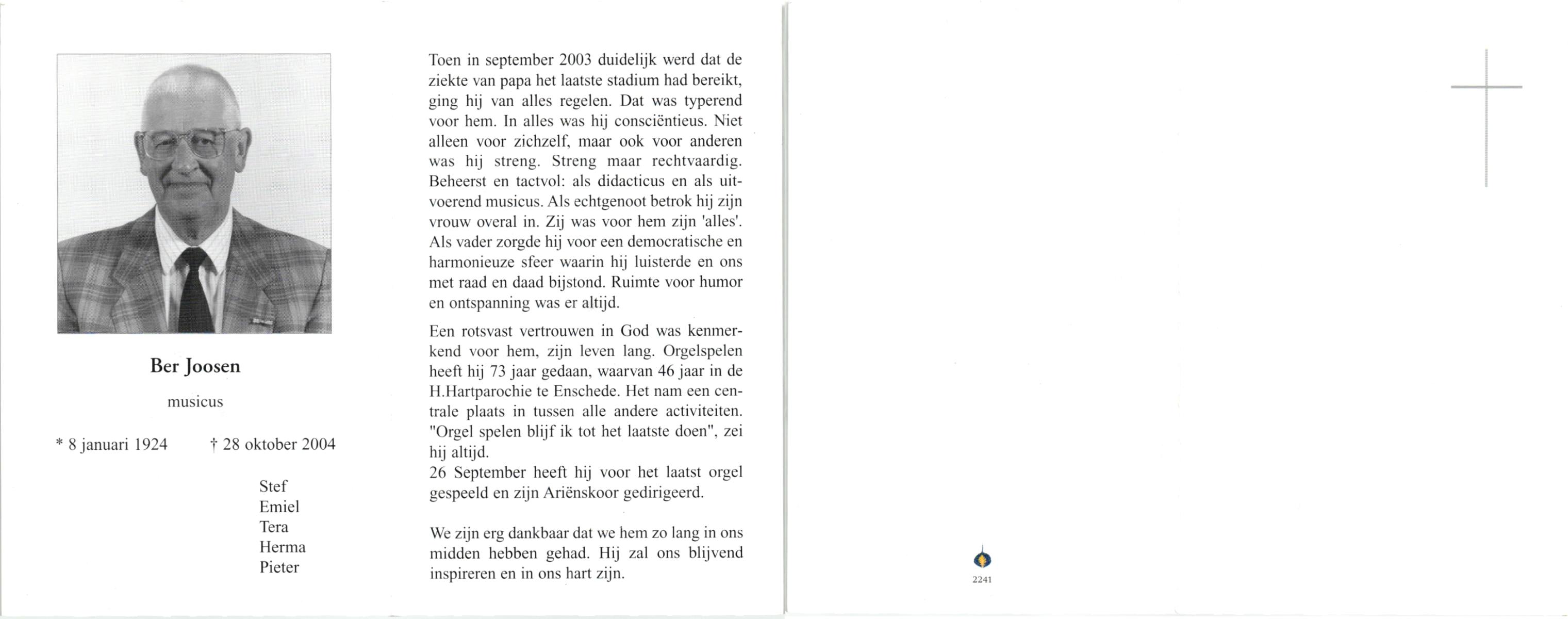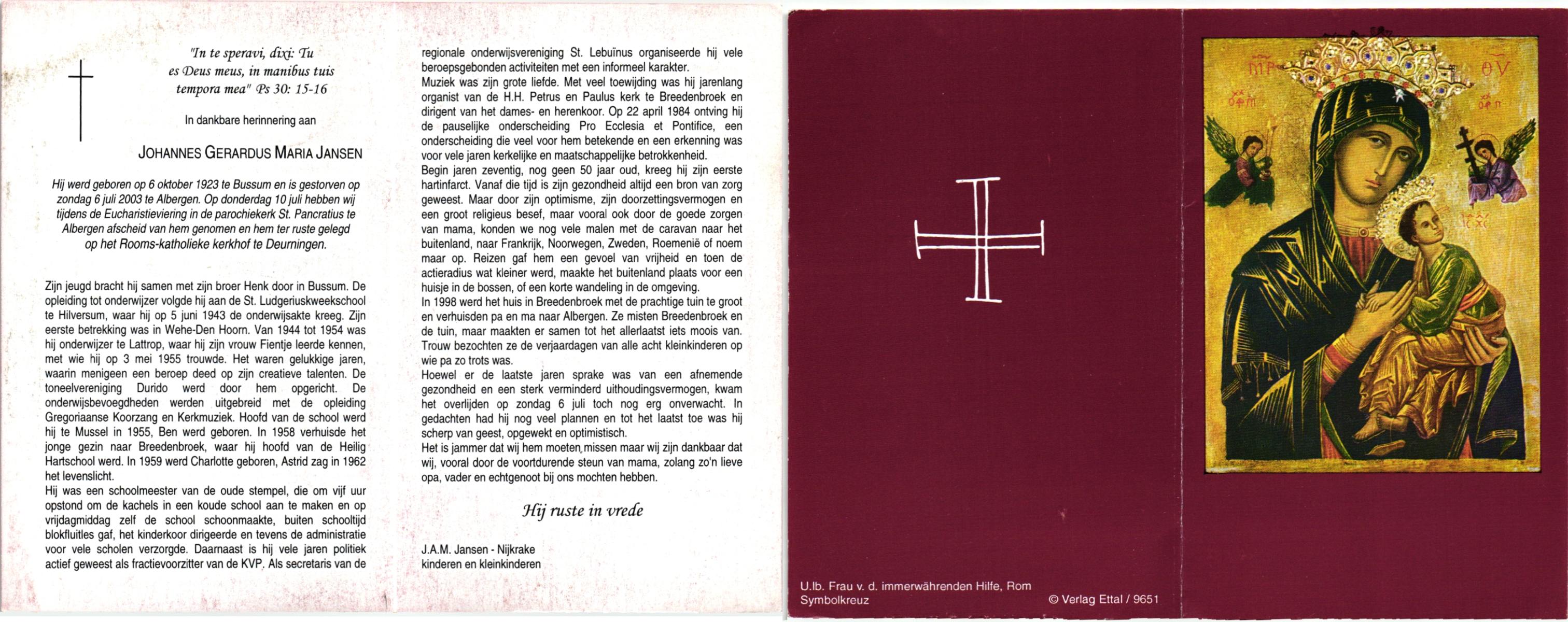 JANSEN, , Johannes Gerardus Maria, geboren op 6-10-1923 te Bussum, overleden op 6-7-2003 te Albergen op 79-jarige leeftijd, begraven op 10-7-2003 te Deurningen.