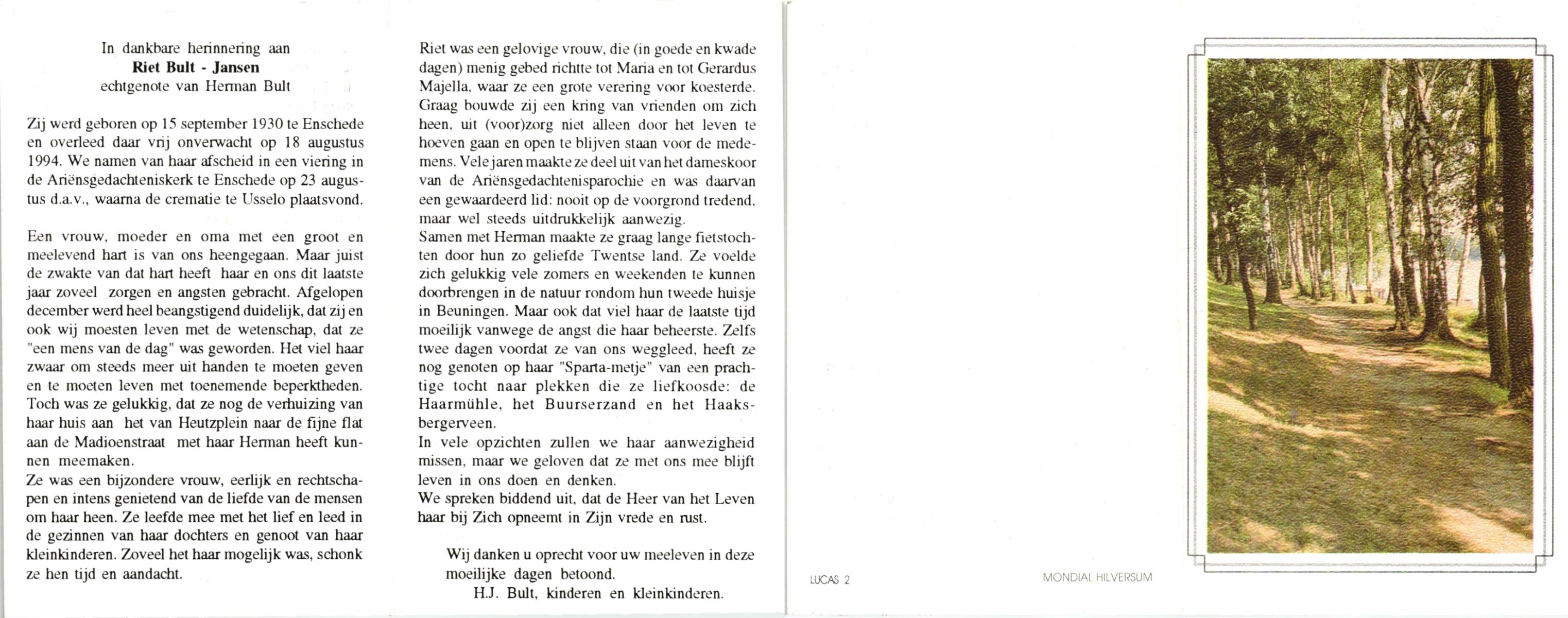 JANSEN, , Riet, geboren op 15-9-1930 te Enschede, overleden op 18-8-1994 te Enschede op 63-jarige leeftijd, gecremeerd op 23-8-1994 te Usselo.