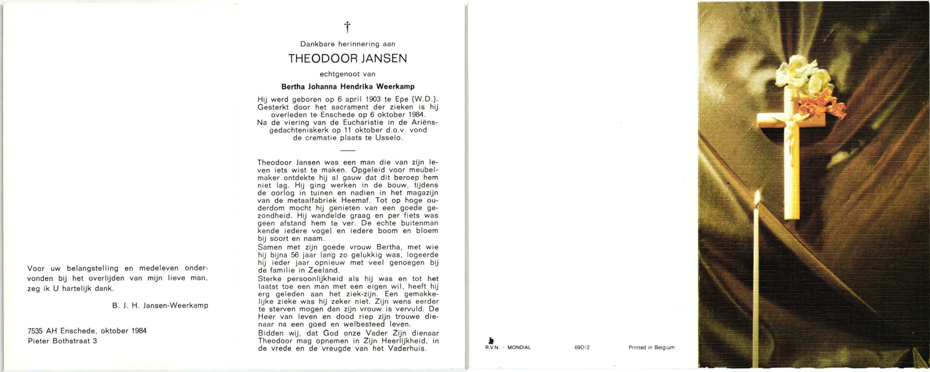 JANSEN, , Theodoor, geboren op 6-4-1903 te Epe, overleden op 6-10-1984 te Enschede op 81-jarige leeftijd, gecremeerd op 11-10-1984 te Usselo.