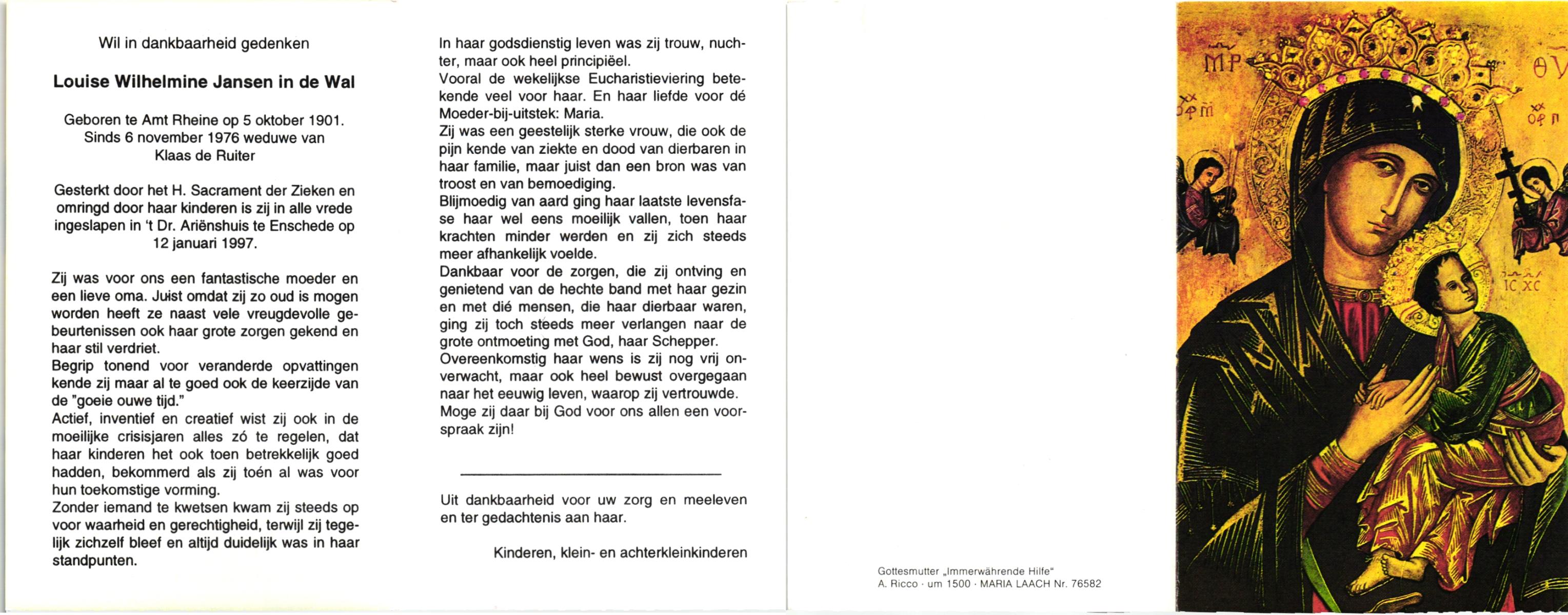 JANSEN, Wilhelmina Berendina, geboren op 12-8-1901 te Oldenzaal, overleden op 16-9-1981 te Denekamp op 80-jarige leeftijd, begraven op 21-9-1981 te Denekamp.