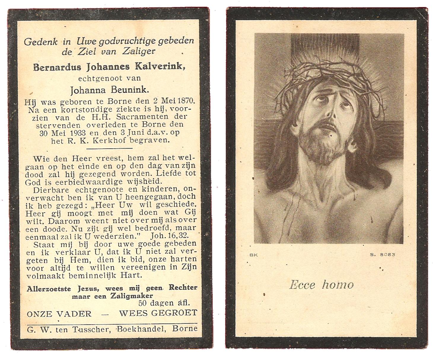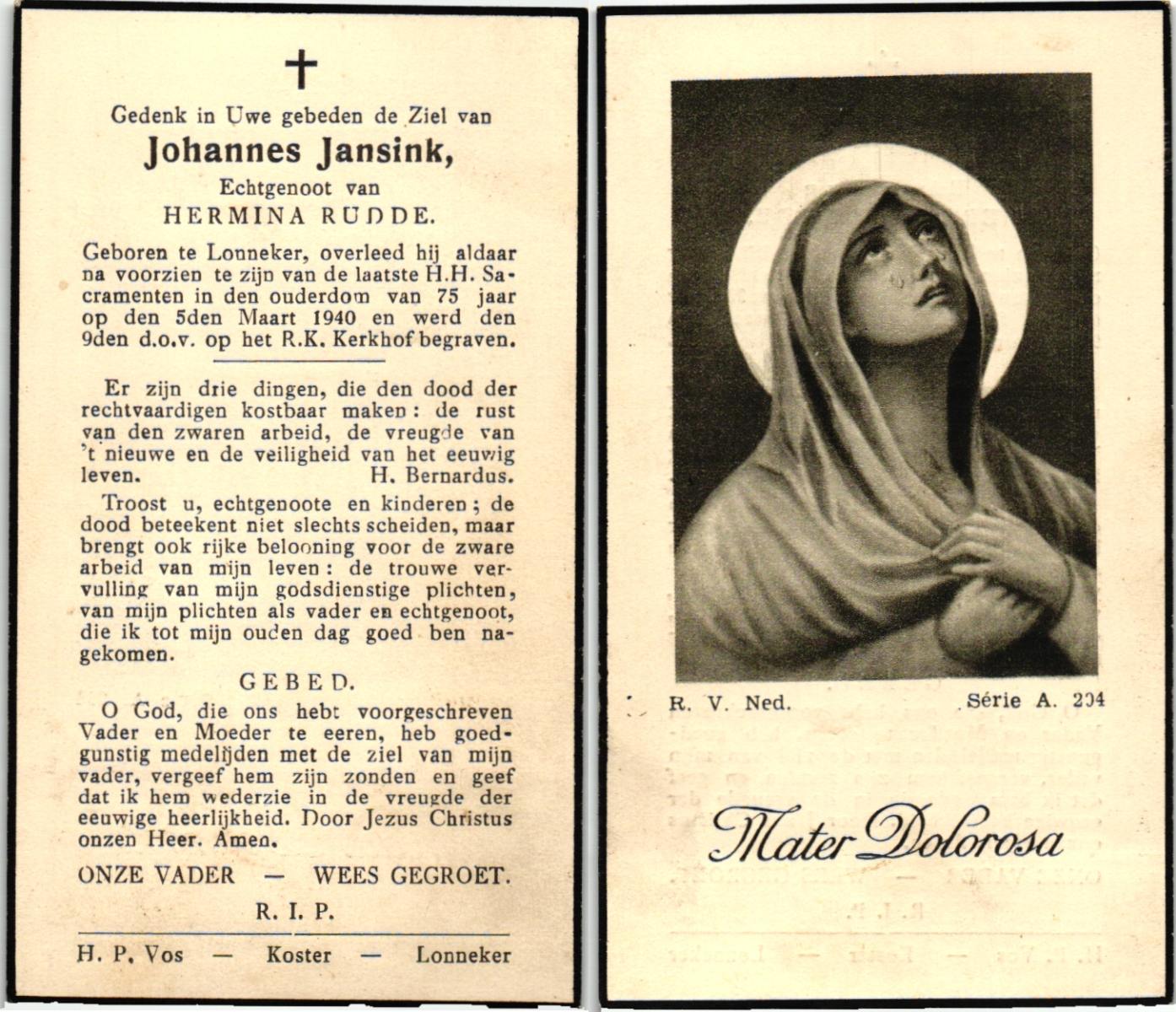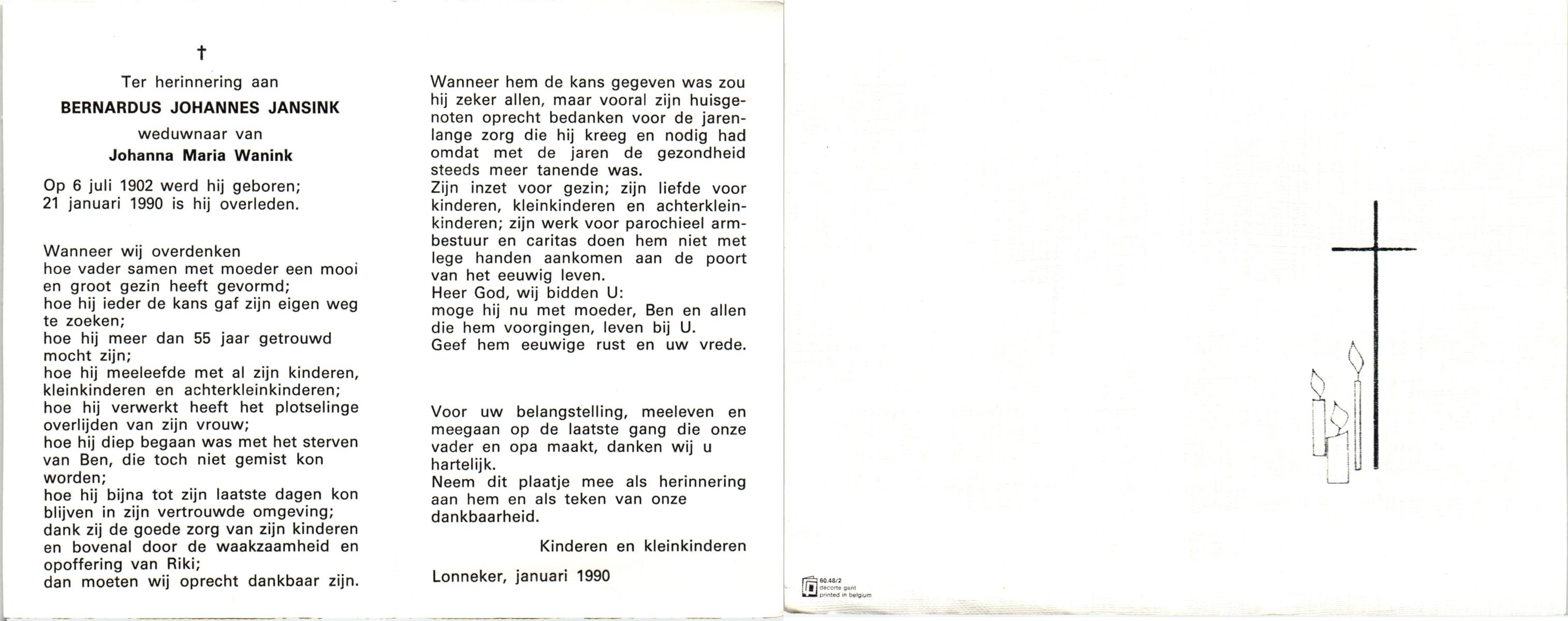 JANSINK, Bernardus Hermannus, geboren op 12-07-1884 te Losser, overleden op 18-10-1974 te Overdinkel op 90-jarige leeftijd, begraven op 22-10-1974 te Overdinkel.