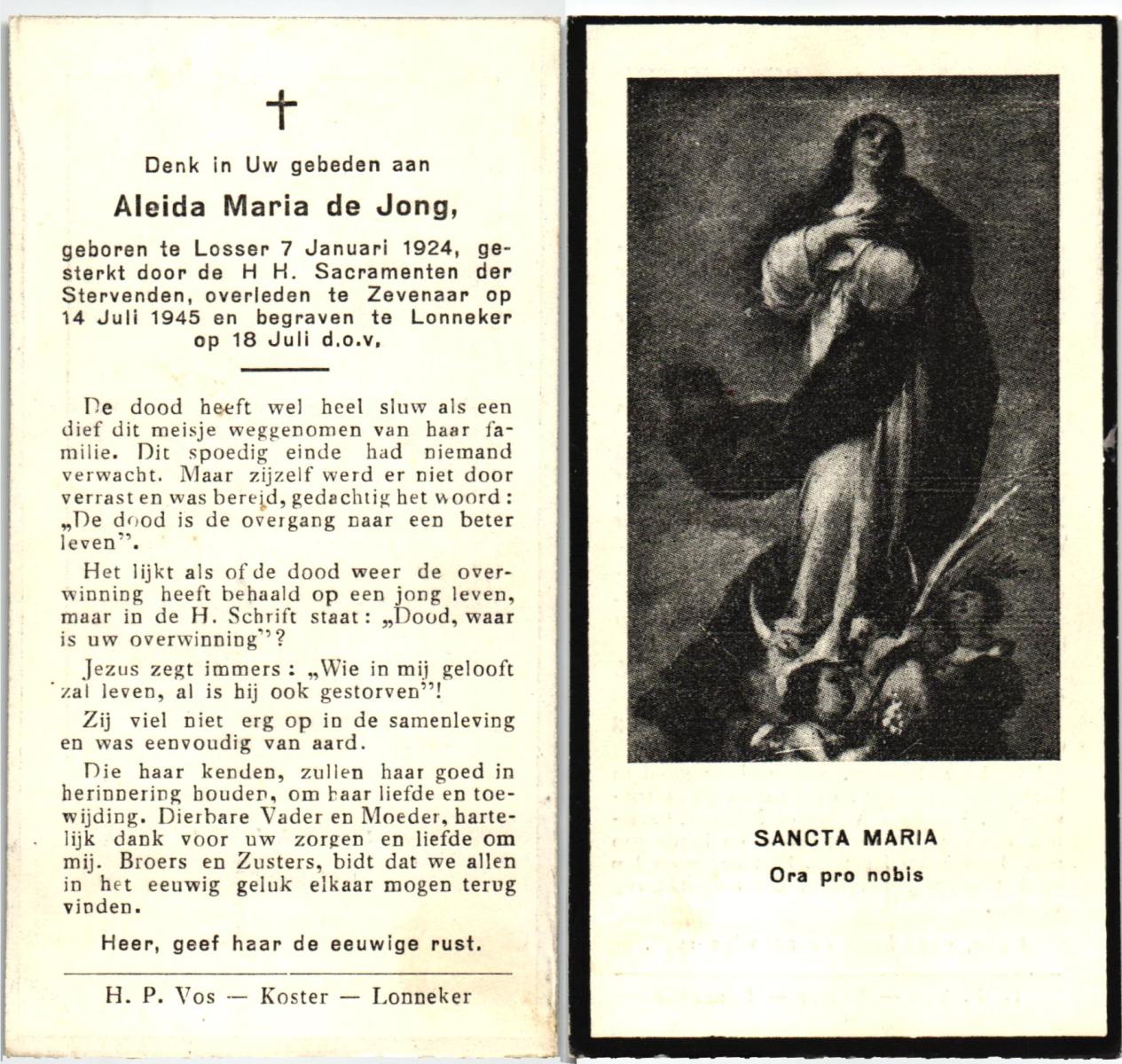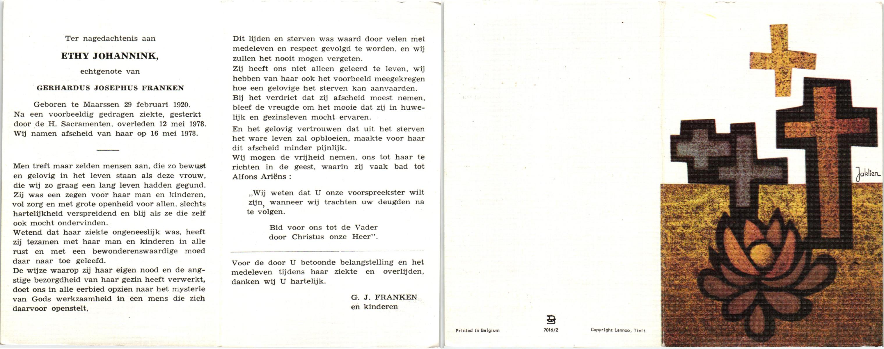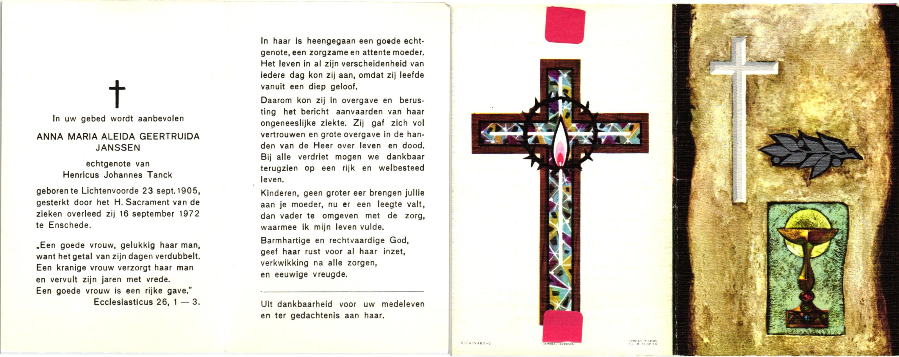 JANSSEN, Aldegonda Hubertina, geboren op 10-1-1905 te Beegden (L), overleden op 7-11-1977 te Enschede op 72-jarige leeftijd, begraven op 11-11-1977 te Enschede.