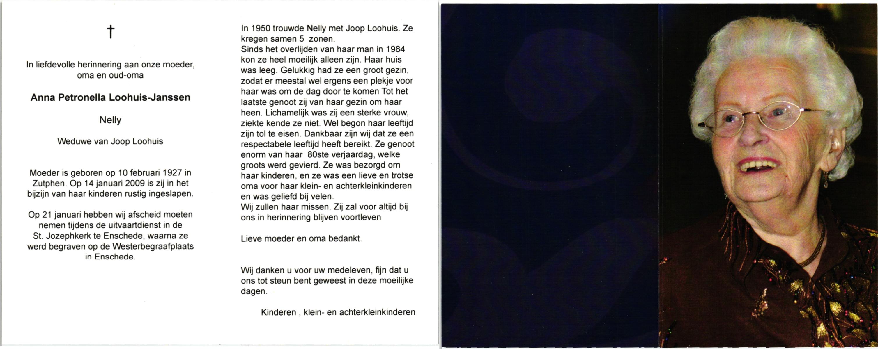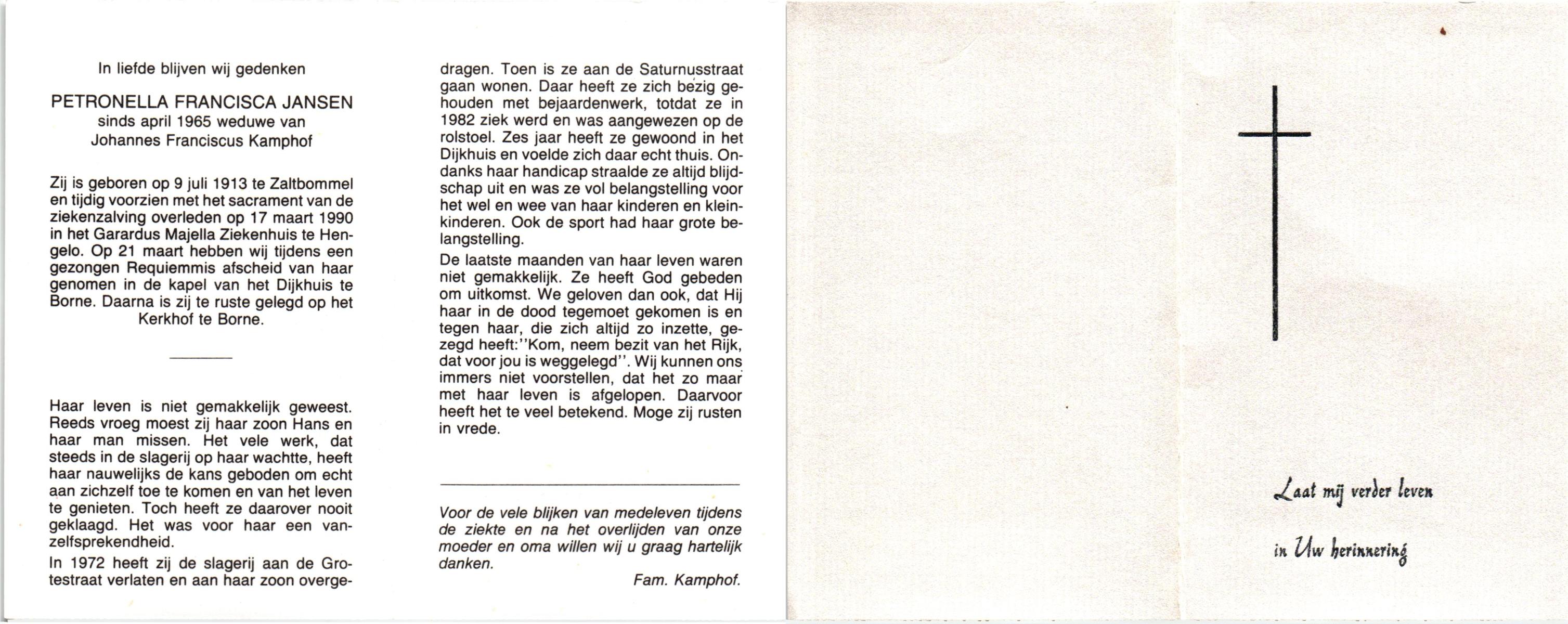JANSEN, Petronella Francisca, geboren op 9-7-1913 te Zaltbommel, overleden op 17-3-1990 te Hengelo, ziekenhuis op 76-jarige leeftijd, begraven op 21-3-1990 te Borne.