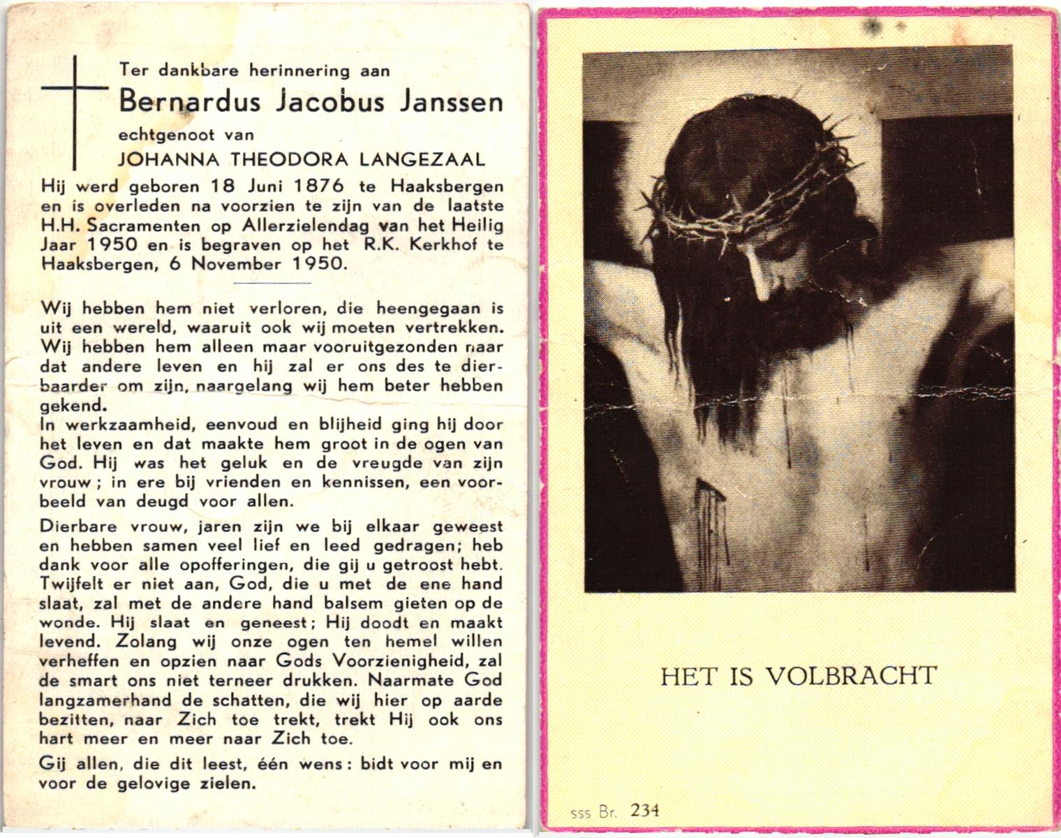 JANSSEN, Johannes Antonius, geboren op 09-03-1854 te Haaksbergen, overleden op 20-8-1937 te Haaksbergen op 83-jarige leeftijd, begraven op 24-8-1937 te Haaksbergen.