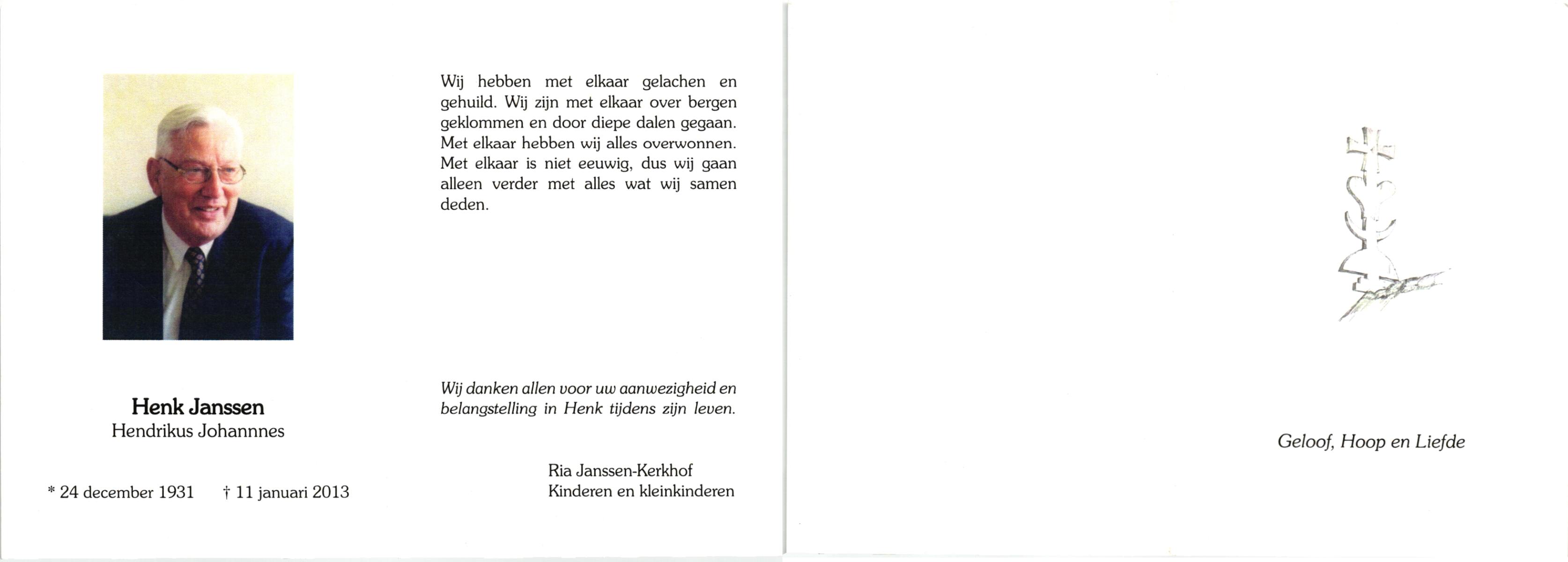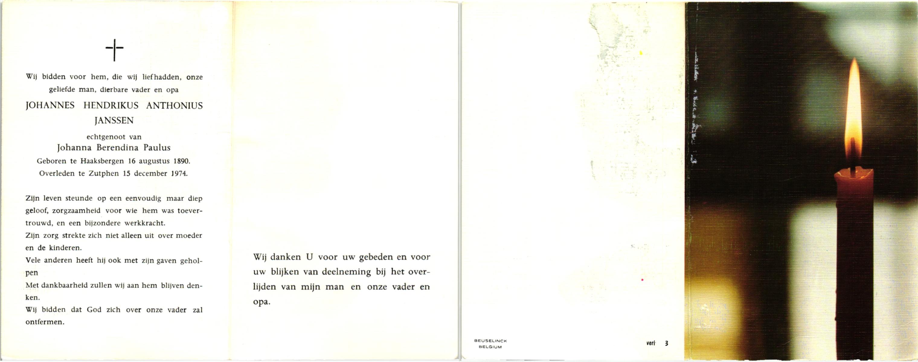 JANSSEN, Johannes Hendrikus, geboren op 15-4-1908 te Gronau (Dld.), overleden op 15-10-1990 te Enschede op 82-jarige leeftijd, gecremeerd op 19-10-1990 te Usselo.