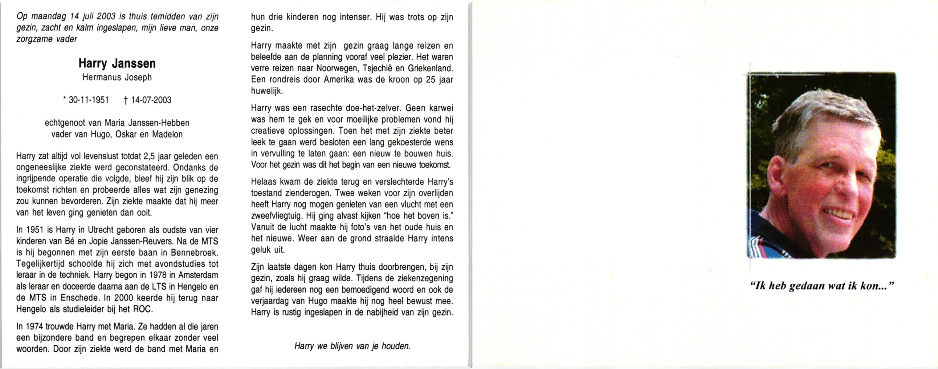 JANSSEN, Harrie, geboren op 26-2-1930 te Venray, overleden op 25-6-2001 te Venray op 71-jarige leeftijd, begraven op 29-6-2001 te Veulen.