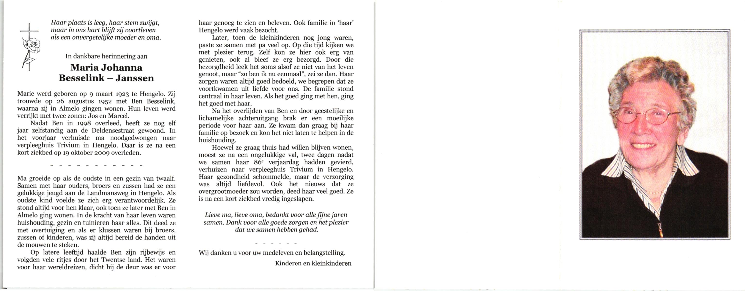 JANSEN, Maria Johanna Hendrika, geboren op 19-03-1896 te Groenlo, overleden op 26-9-1989 te Haaksbergen op 93-jarige leeftijd, begraven op 30-9-1989 te Haaksbergen.