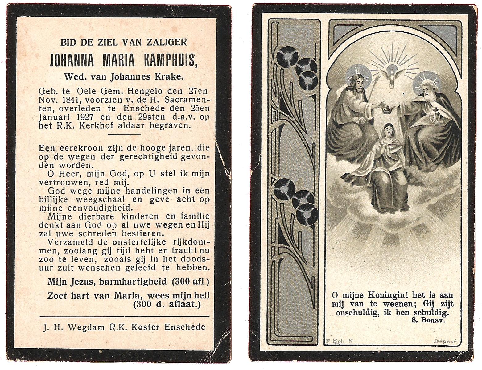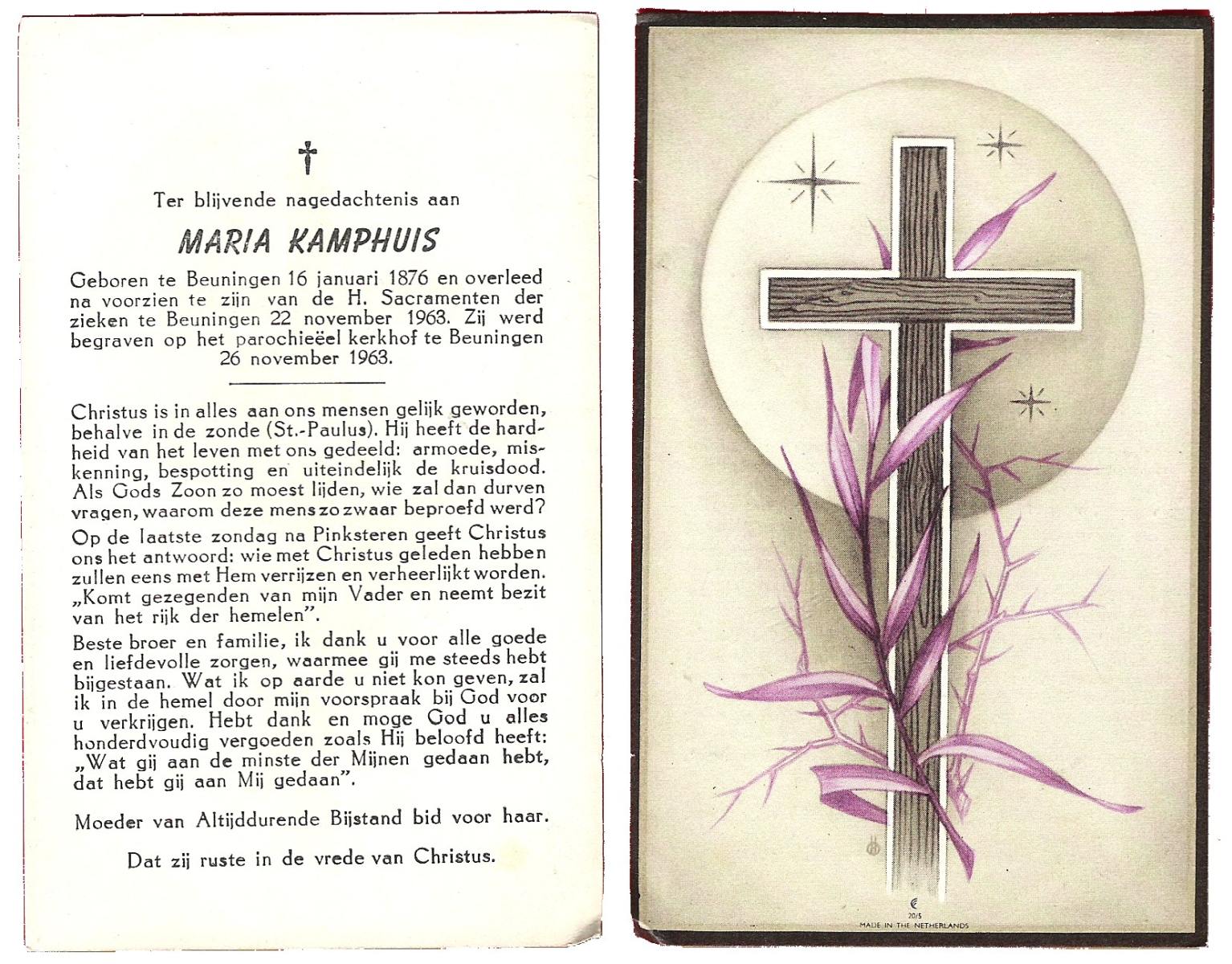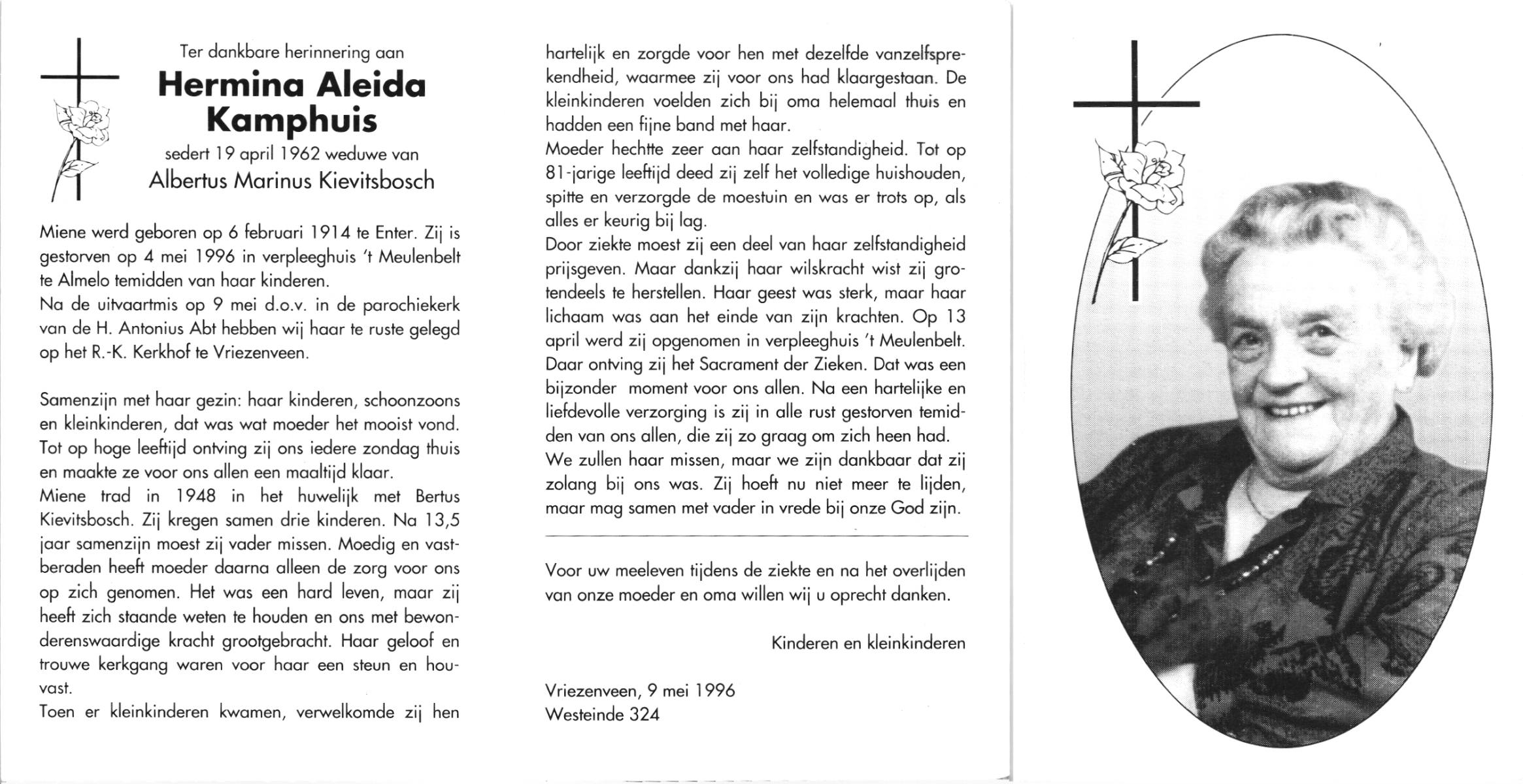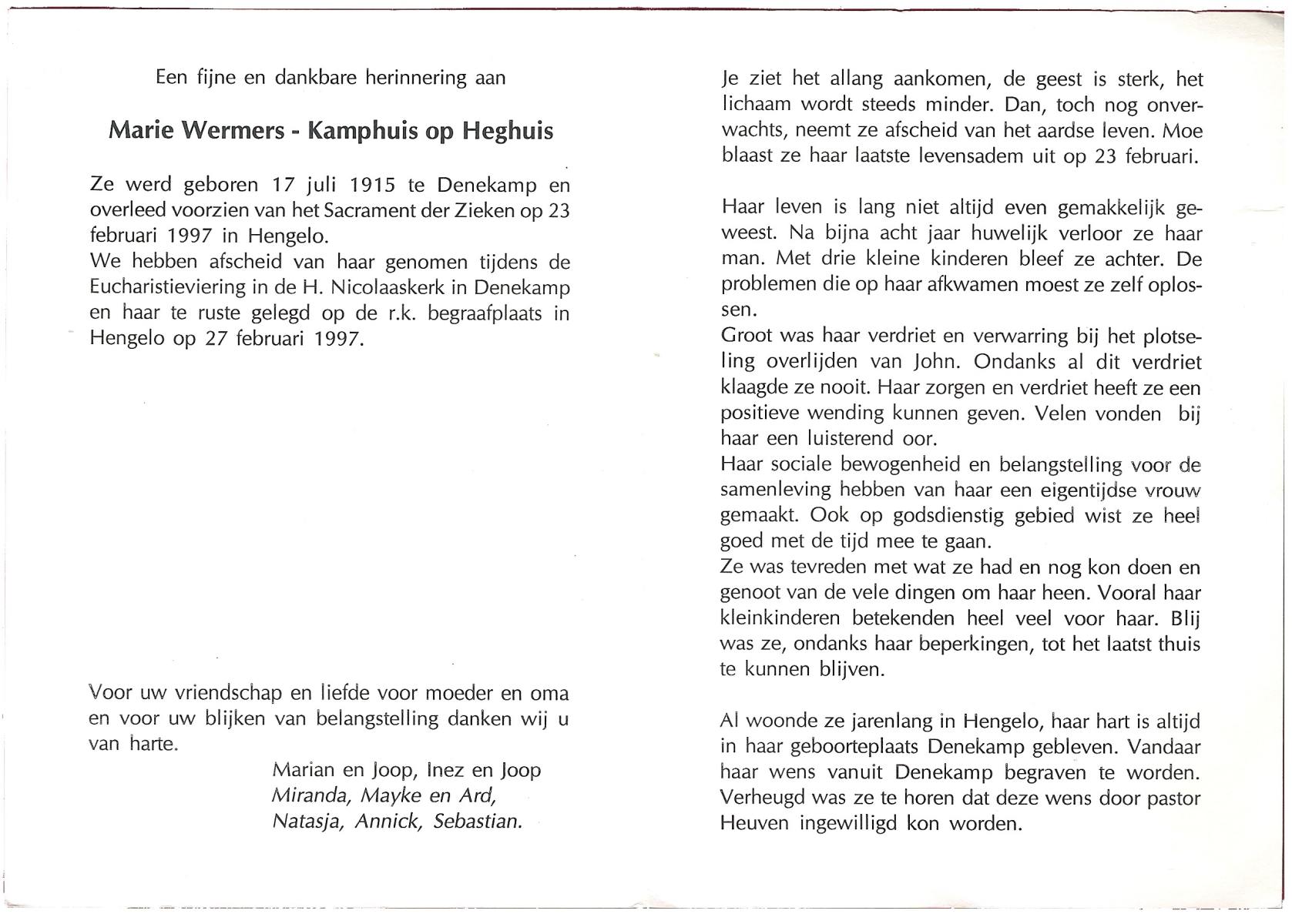 KAMPHUIS op HEGHUIS, Marie, geboren op 17-7-1915 te Denekamp, overleden op 23-2-1997 te Hengelo (Ov.) op 81-jarige leeftijd, begraven op 27-2-1997 te Hengelo (Ov.).