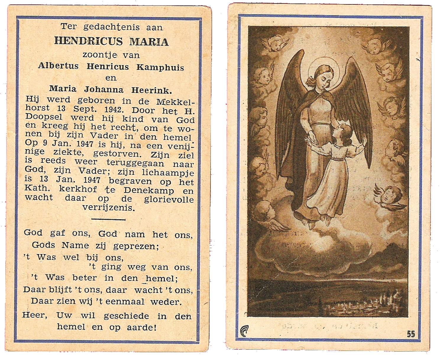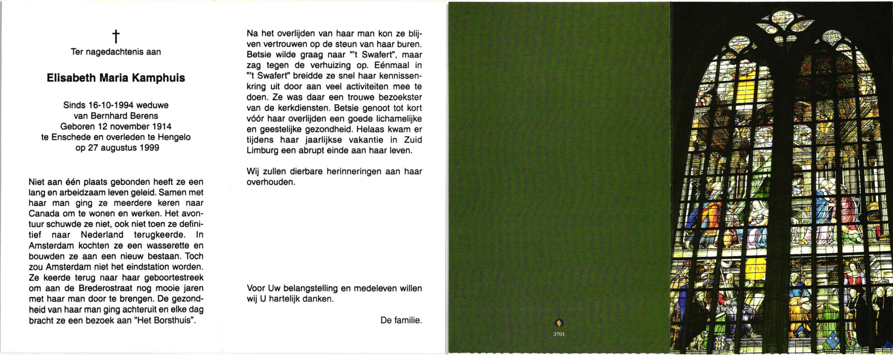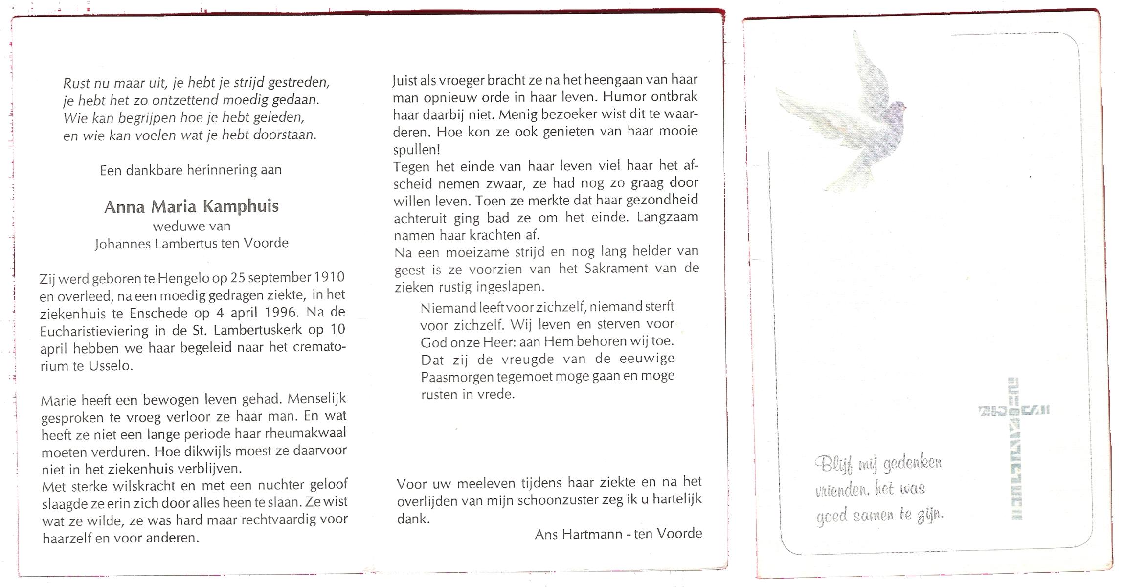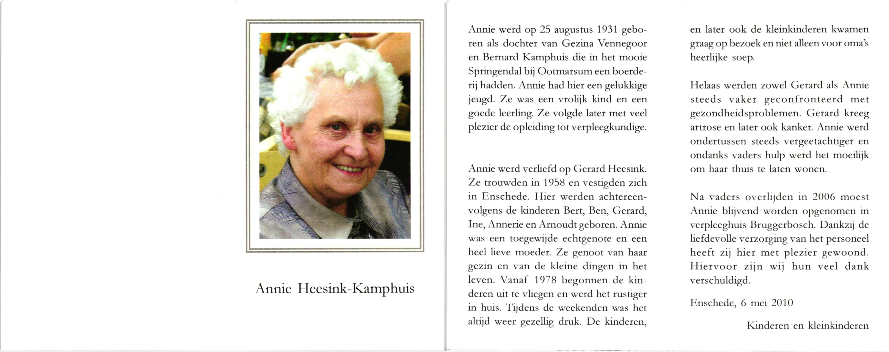 KAMPHUIS op HEGHUIS, Marie, geboren op 17-7-1915 te Denekamp, overleden op 23-2-1997 te Hengelo (Ov.) op 81-jarige leeftijd, begraven op 27-2-1997 te Hengelo (Ov.).