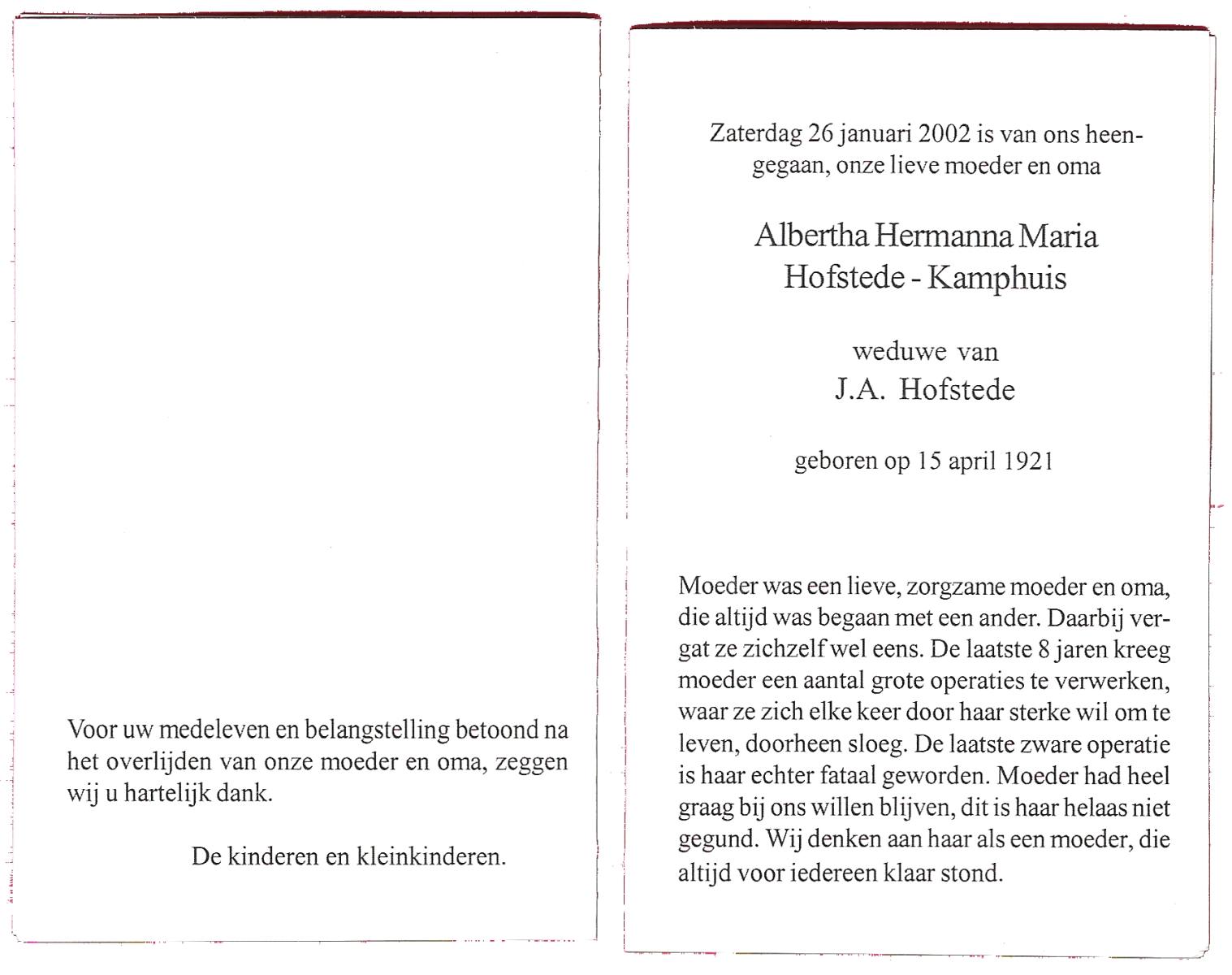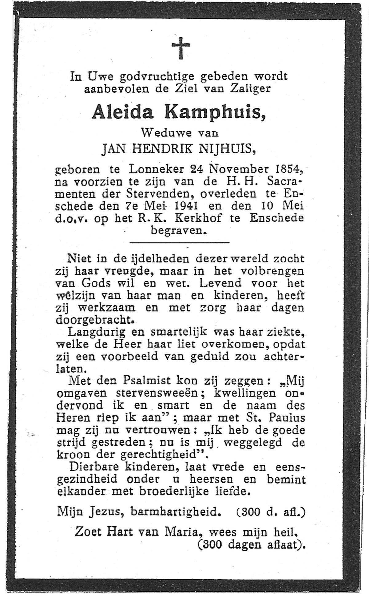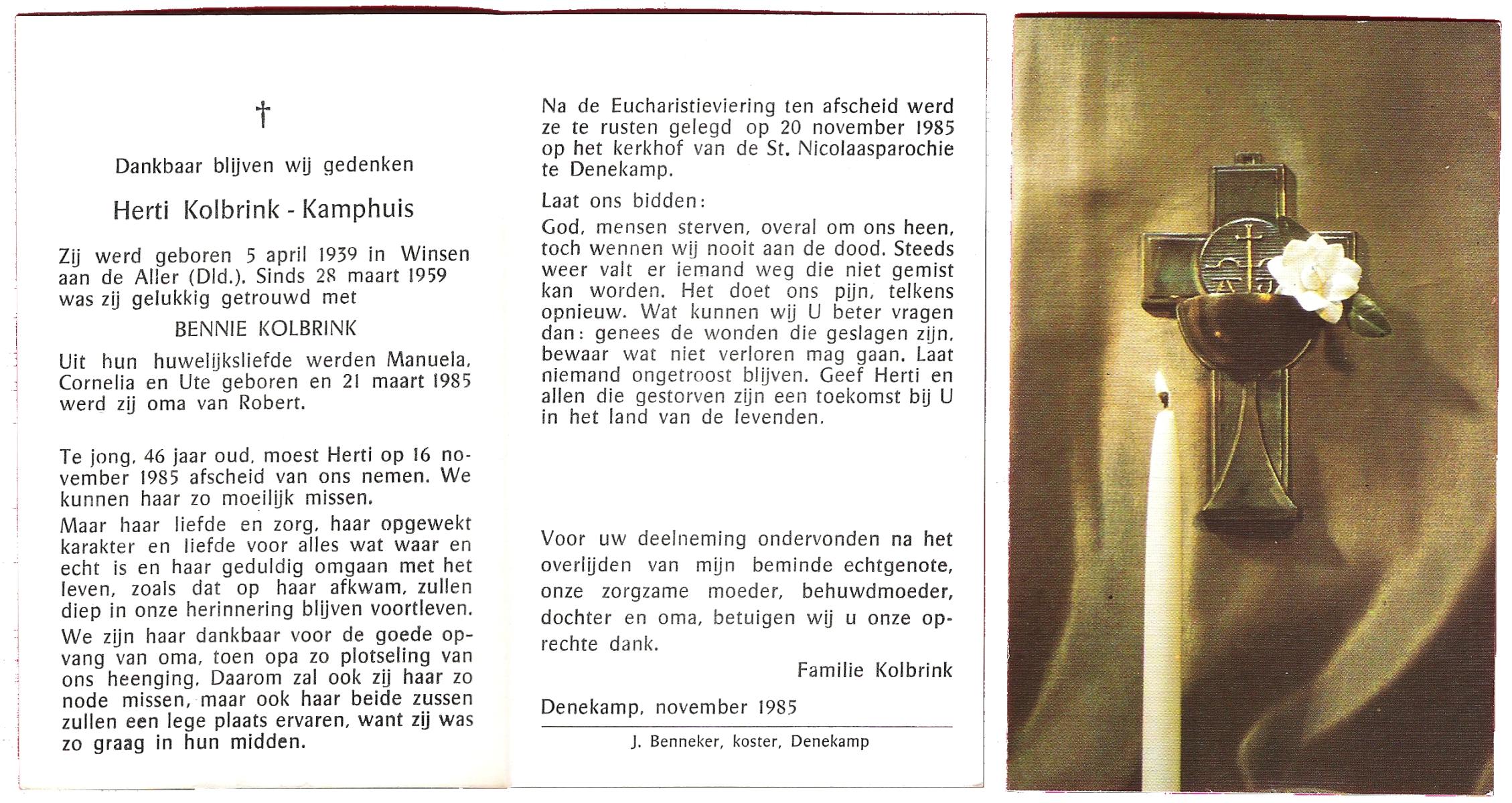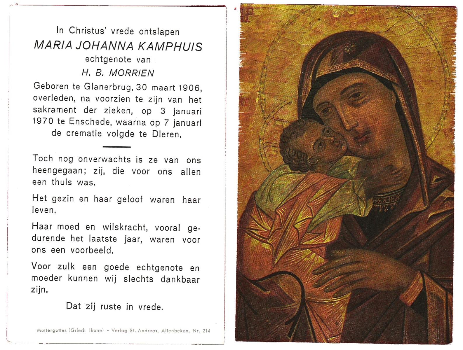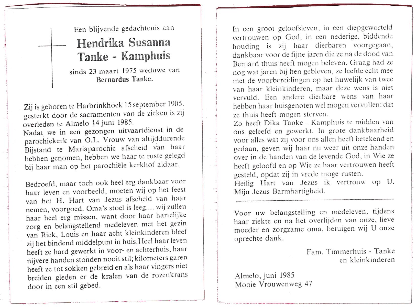KAMPHUIS op HEGHUIS, Marie, geboren op 17-7-1915 te Denekamp, overleden op 23-2-1997 te Hengelo (Ov.) op 81-jarige leeftijd, begraven op 27-2-1997 te Hengelo (Ov.).