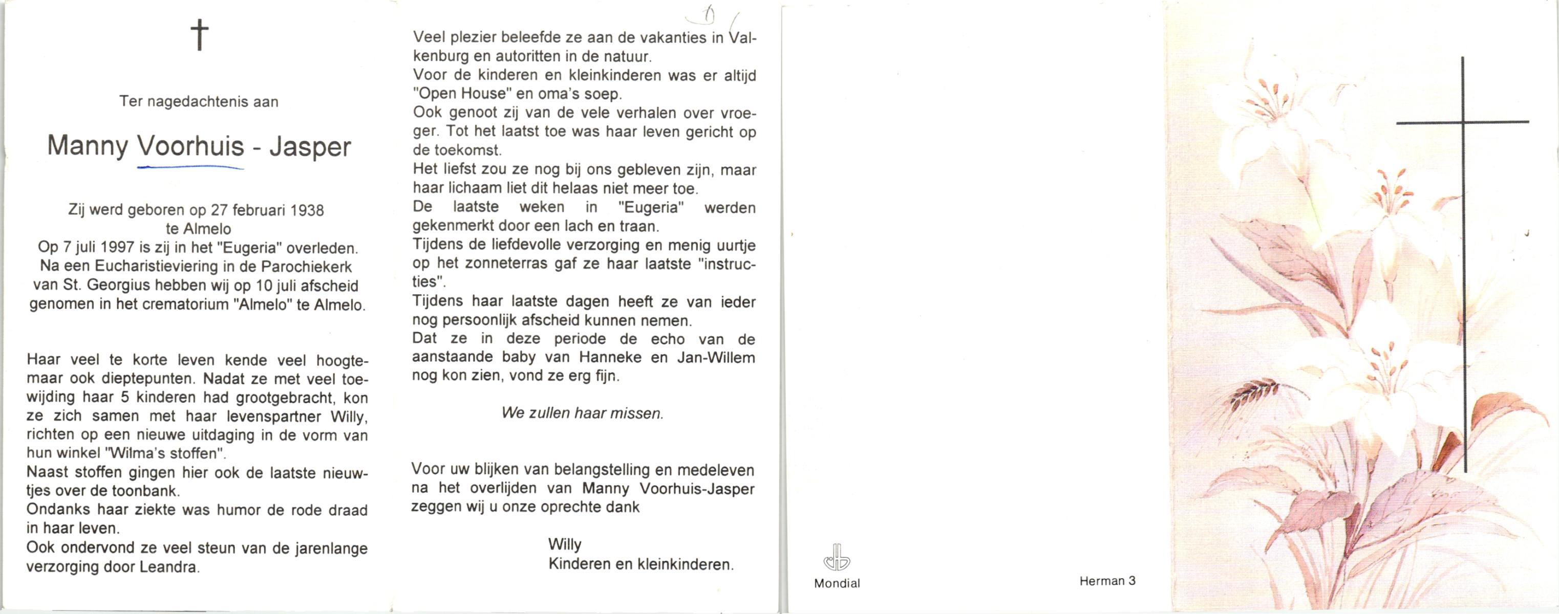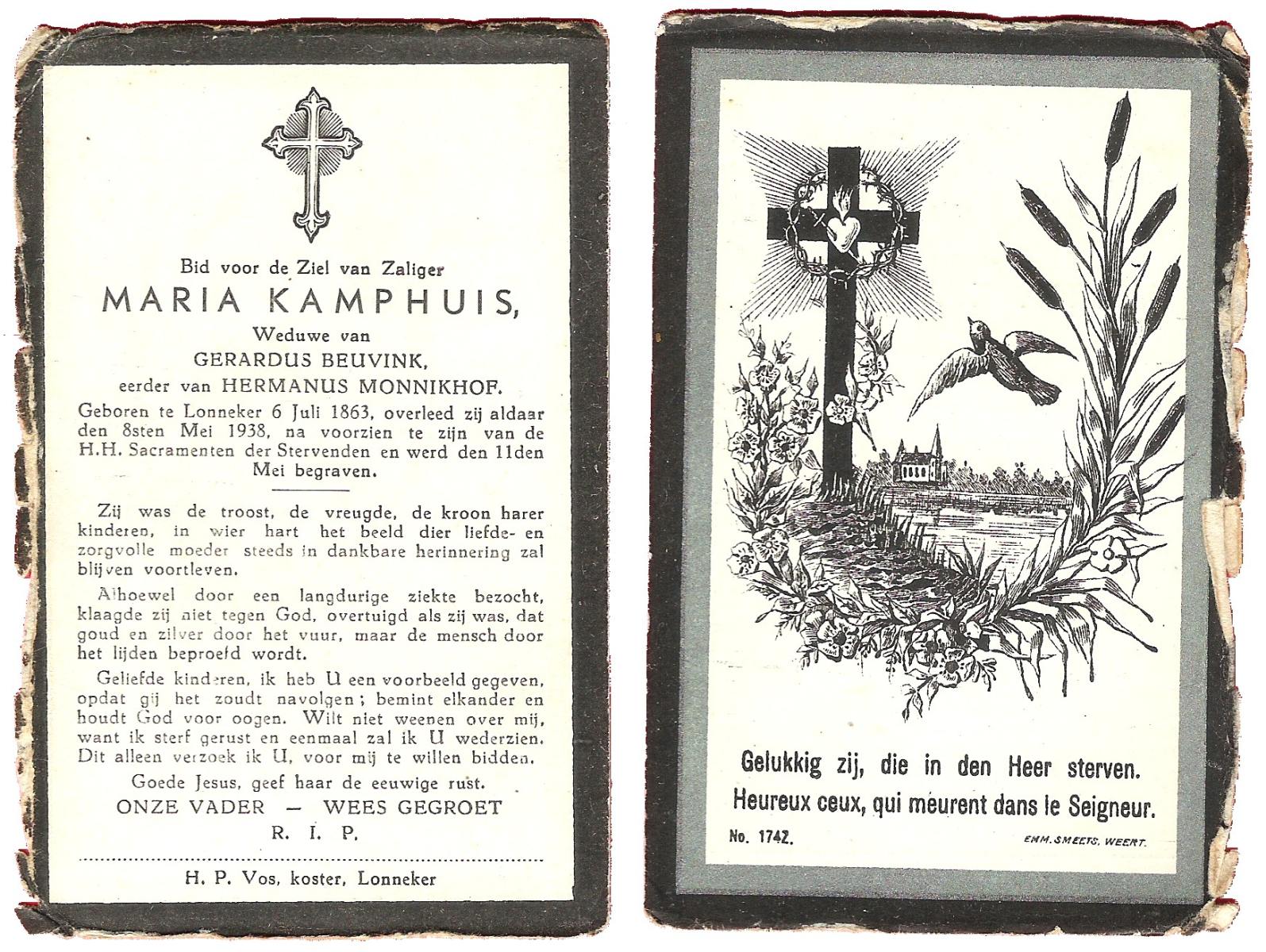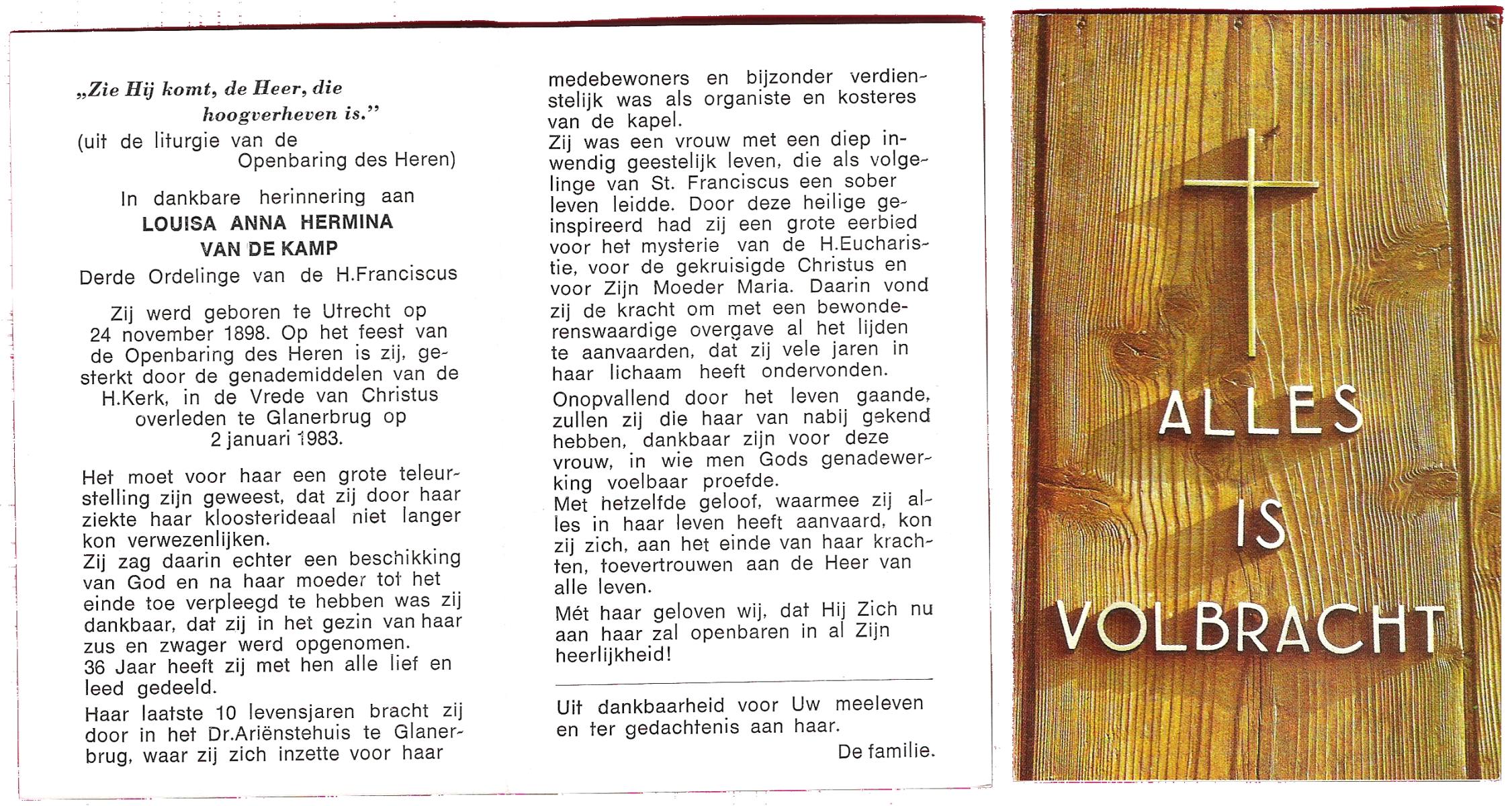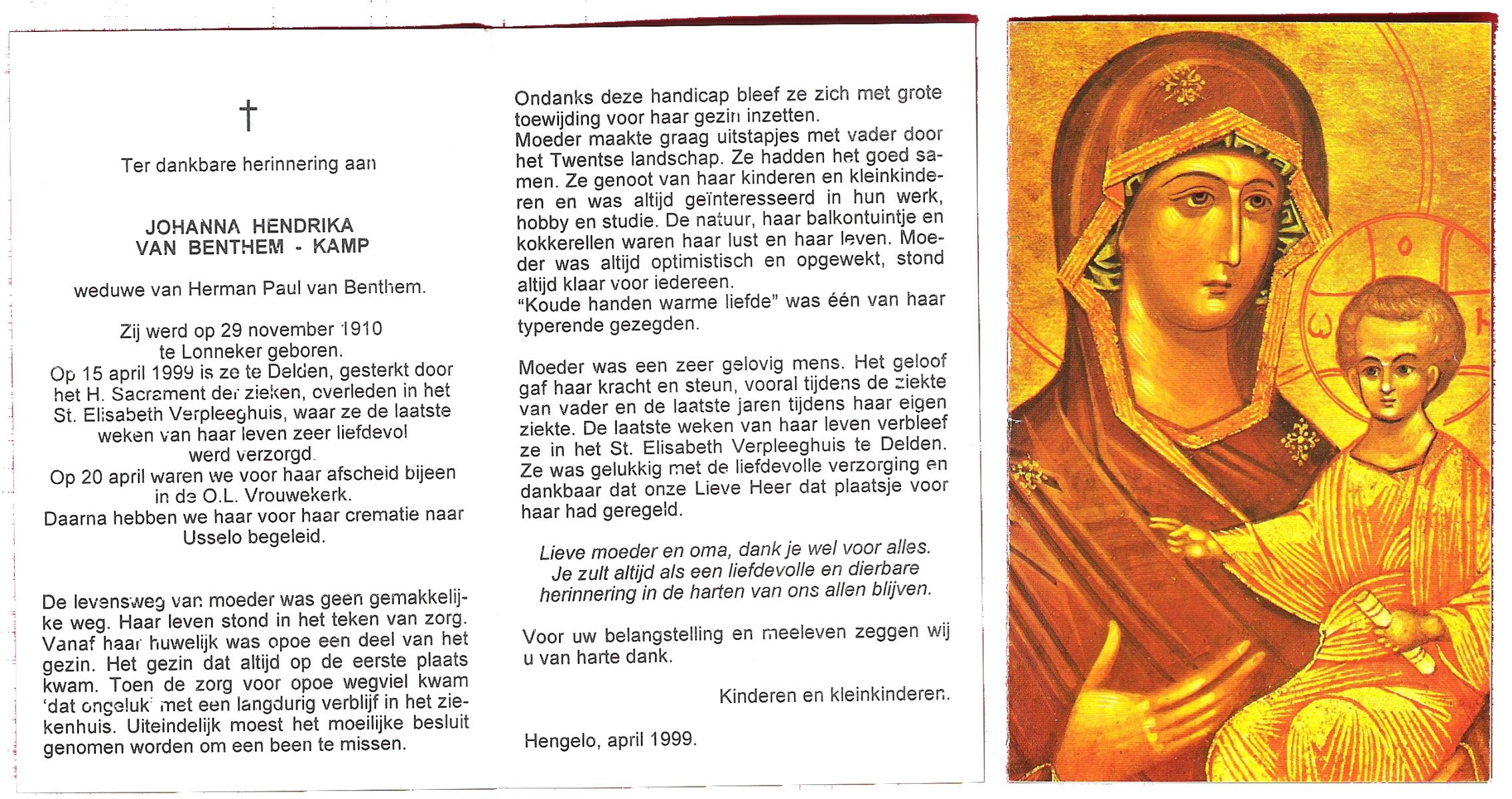 KAMPHUIS op HEGHUIS, Marie, geboren op 17-7-1915 te Denekamp, overleden op 23-2-1997 te Hengelo (Ov.) op 81-jarige leeftijd, begraven op 27-2-1997 te Hengelo (Ov.).