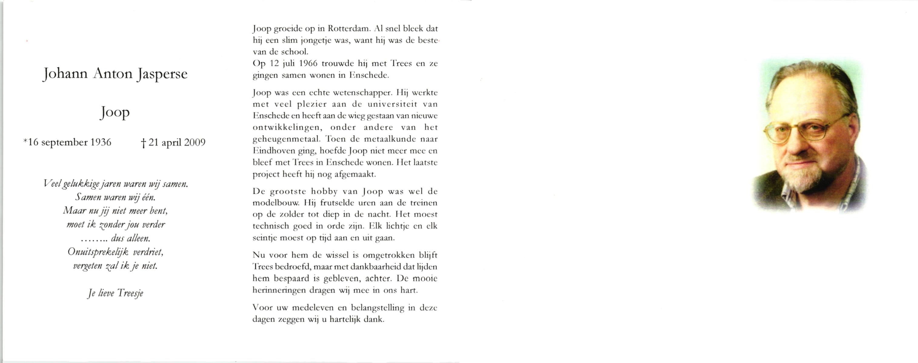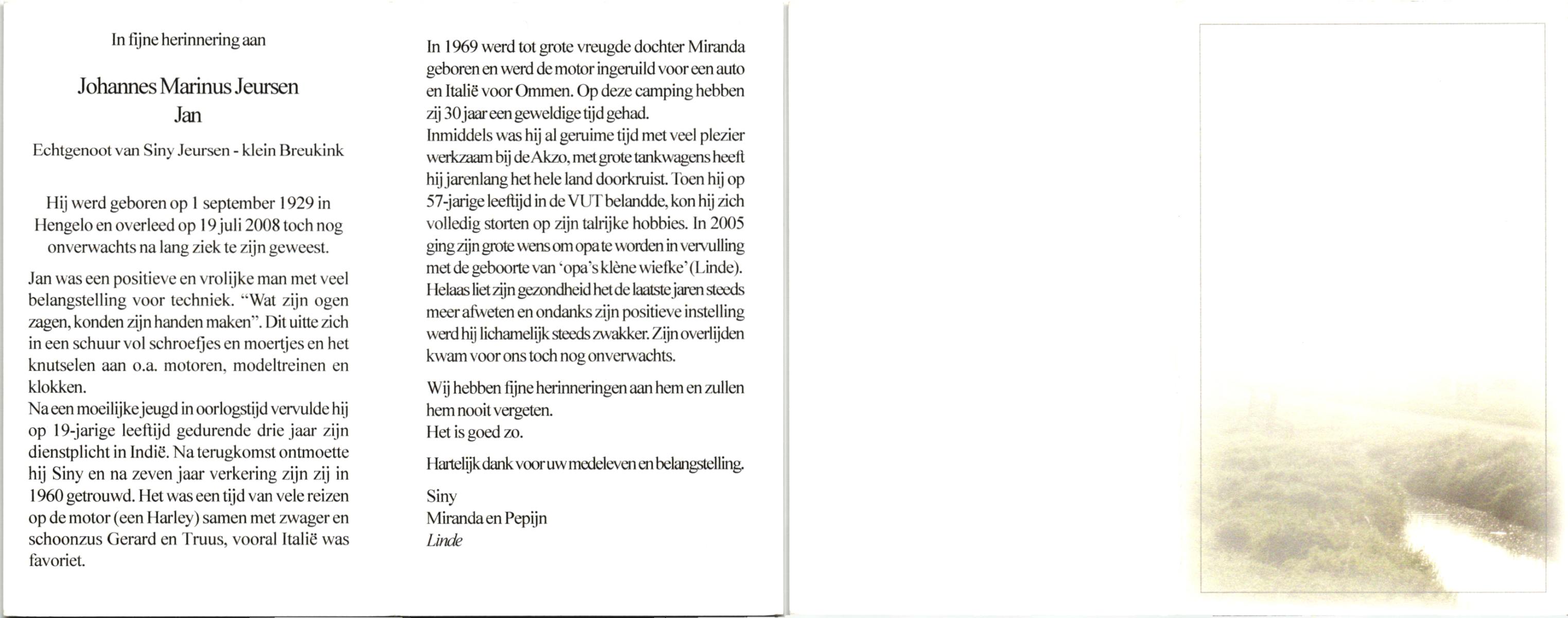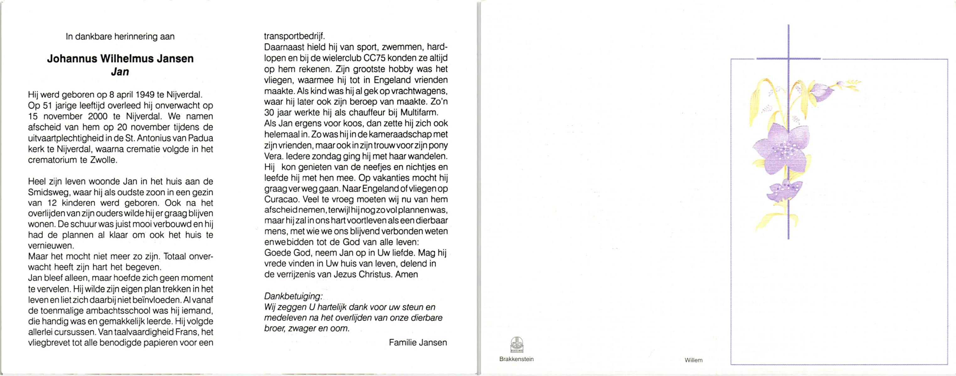 JANSEN, Johannes Wilhelmus (Jan), geboren op 8-4-1949 te Hellendoorn, Nijverdal, overleden op 15-11-2000 te Hellendoorn, Nijverdal op 51-jarige leeftijd, gecremeerd op 20-11-2000 te Zwolle.