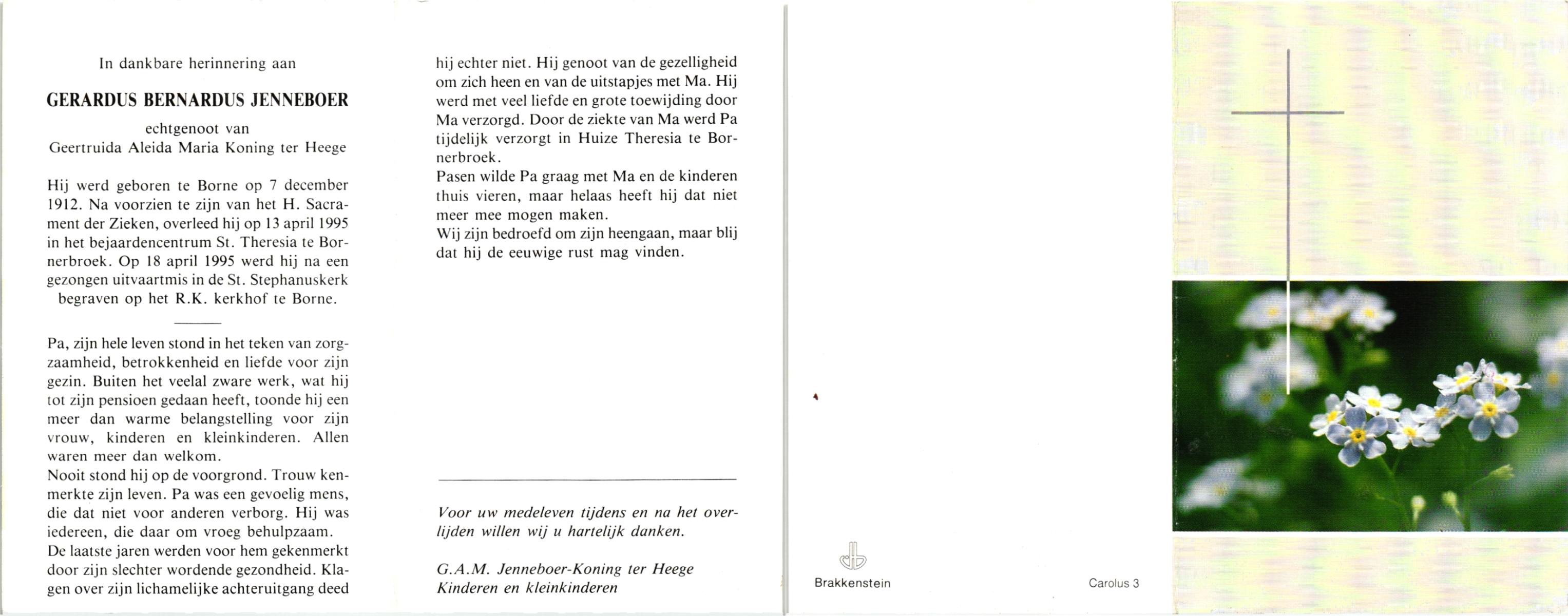 JANSEN, Theodorus Gerardus (Dorus), geboren op 22-11-1914 te Giethem, overleden op 5-1-1995 te Hellendoorn, Nijverdal op 80-jarige leeftijd, begraven op 10-1-1995 te Hellendoorn, Nijverdal.