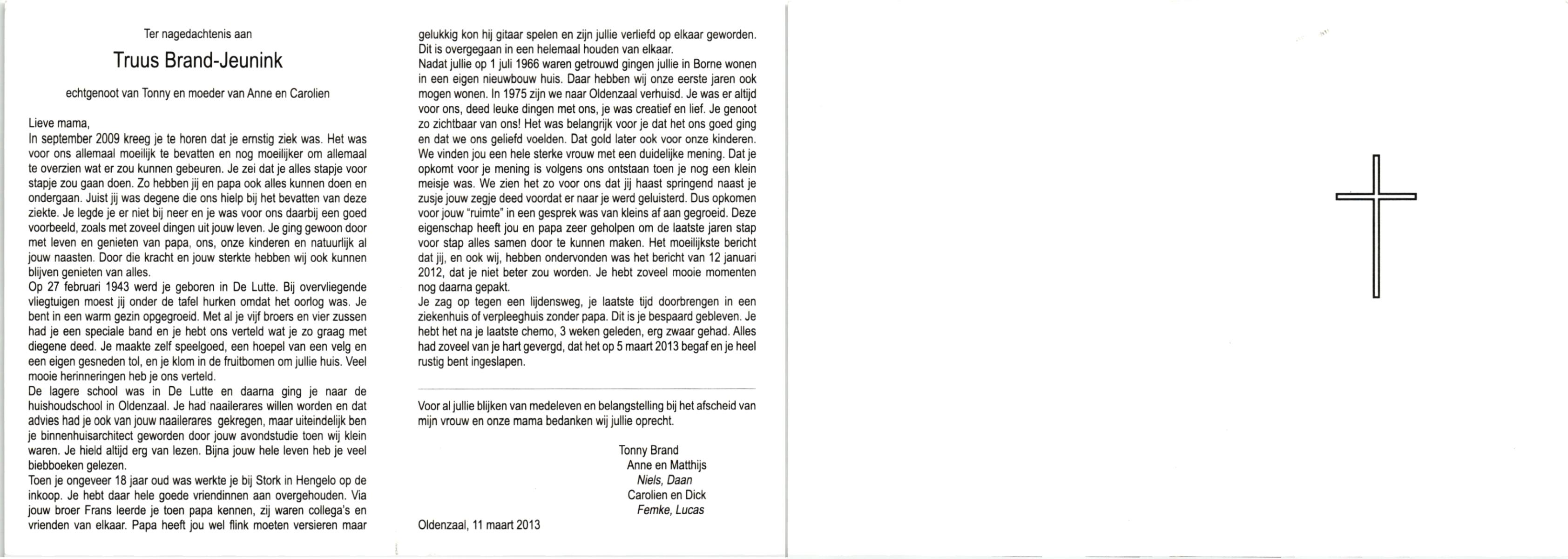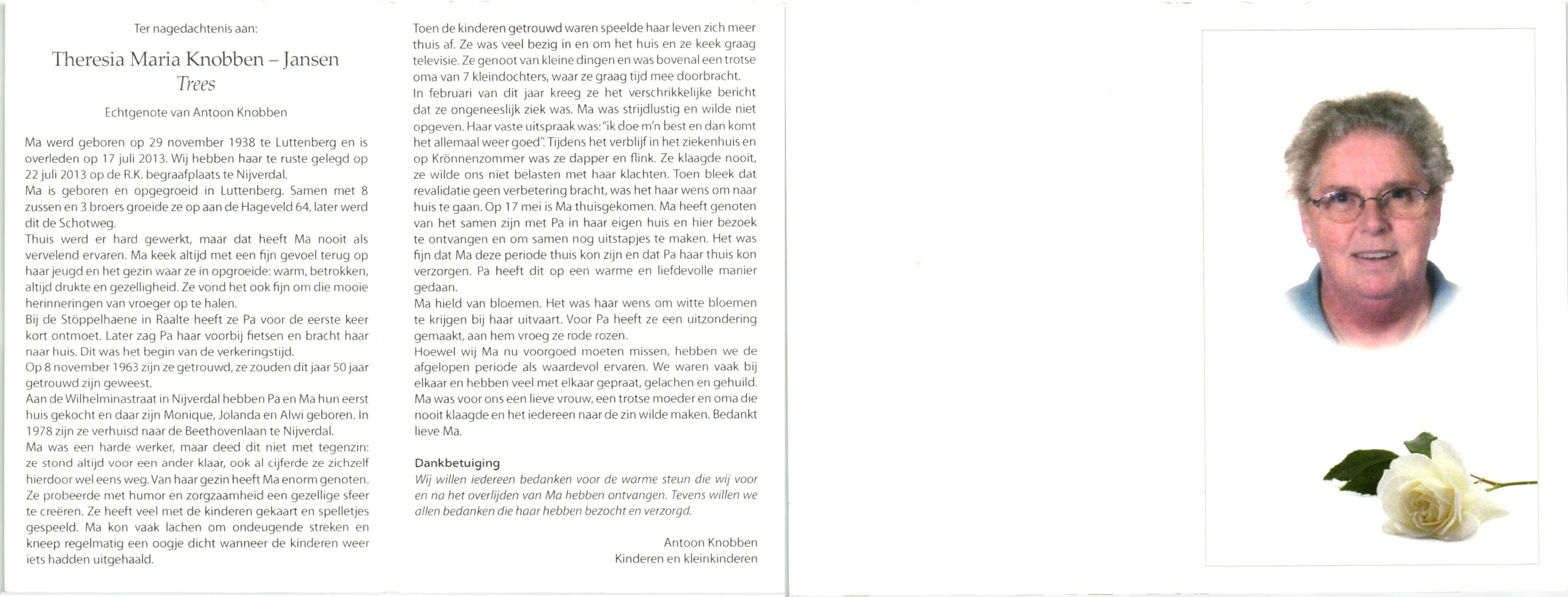 JANSEN, Theresia Maria (Trees), geboren op 29-11-1938 te Raalte, Luttenberg, overleden op 17-7-2013 op 74-jarige leeftijd, begraven op 22-7-2013 te Hellendoorn, Nijverdal, rk.