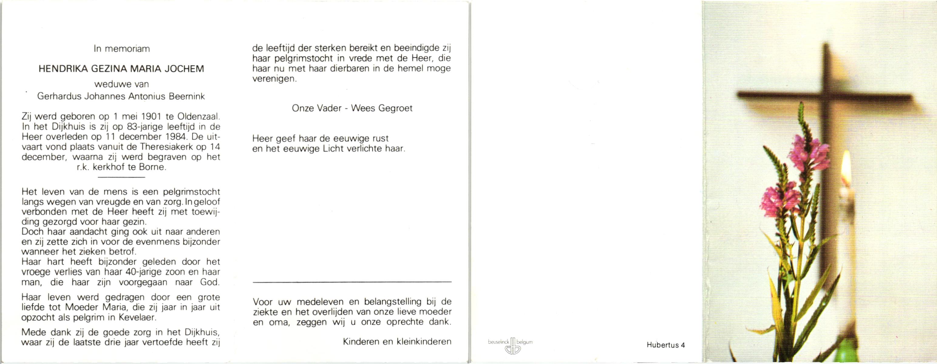 JANSINK, Gezina Hermina, geboren op 10-2-1900 te Losser, overleden op 6-7-1987 op 87-jarige leeftijd, begraven op 11-7-1987 te Losser.