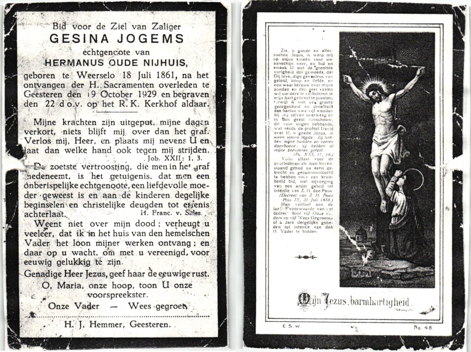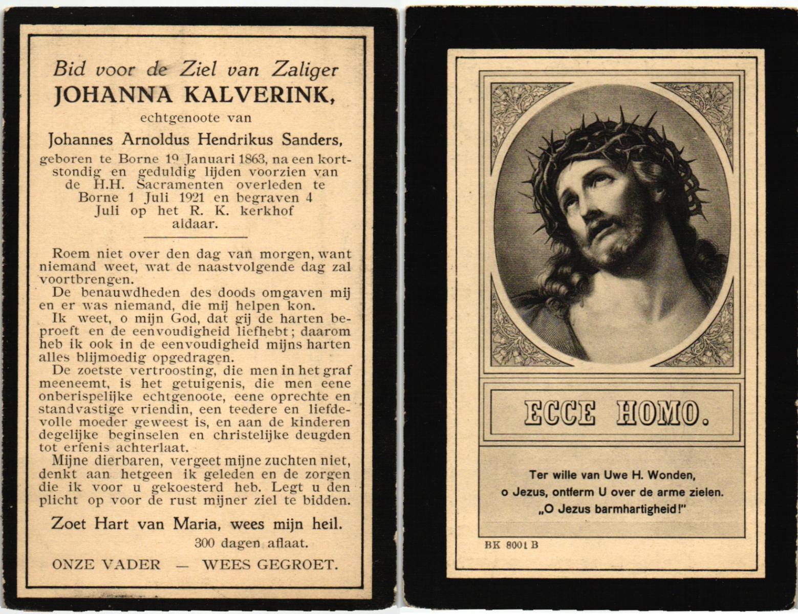 JANSINK, Johanna, geboren op 26-04-1887 te Losser, overleden op 31-1-1974 te Overdinkel op 86-jarige leeftijd, begraven op 5-2-1974 te Overdinkel.