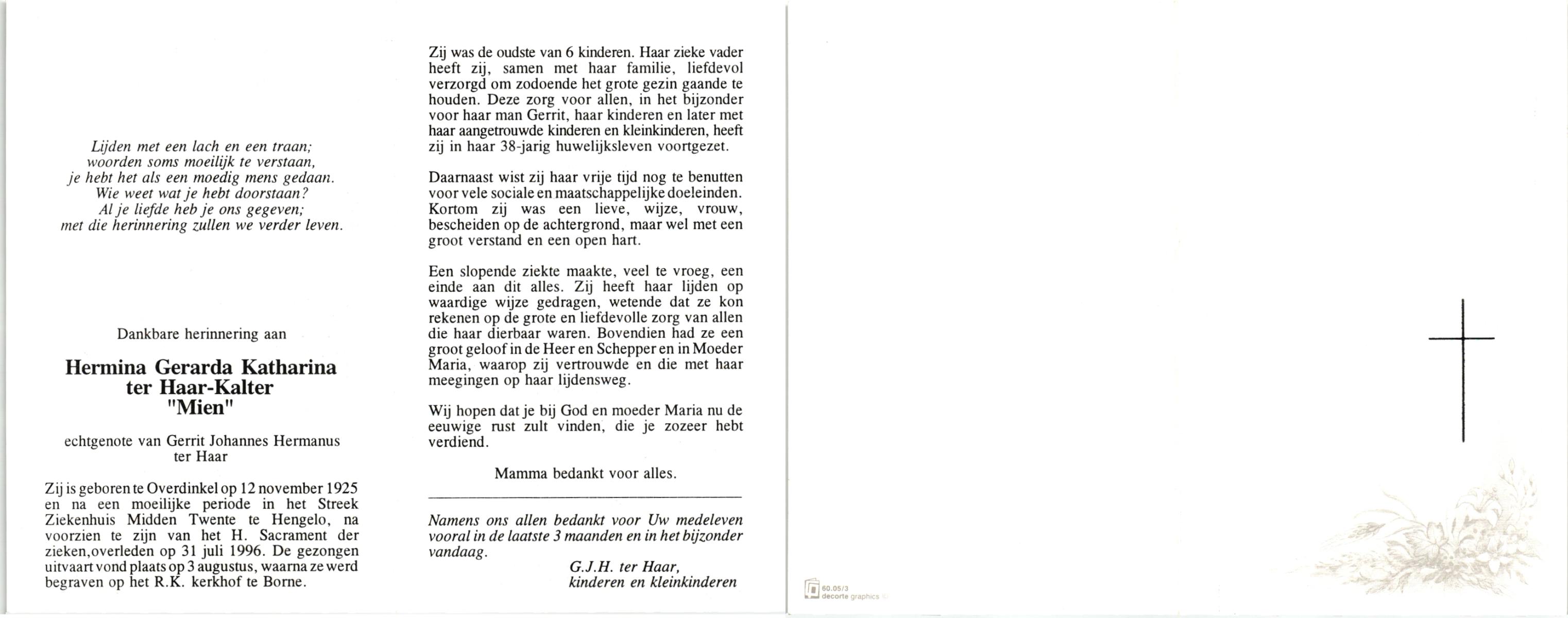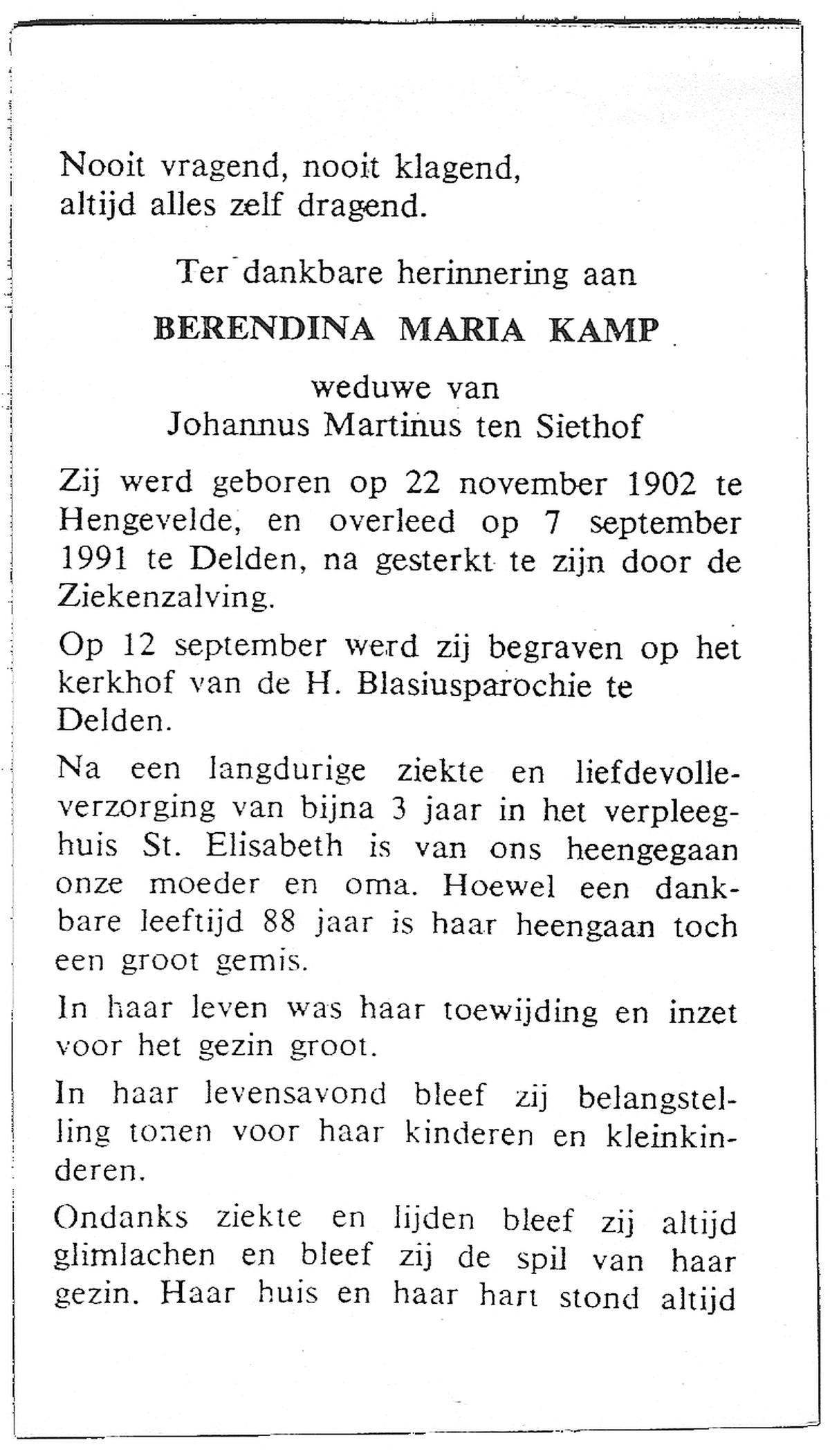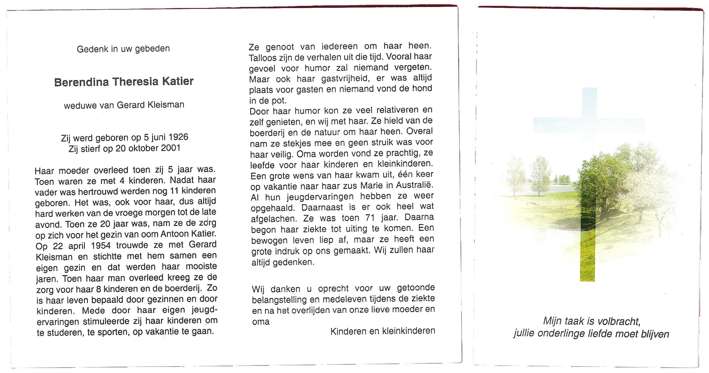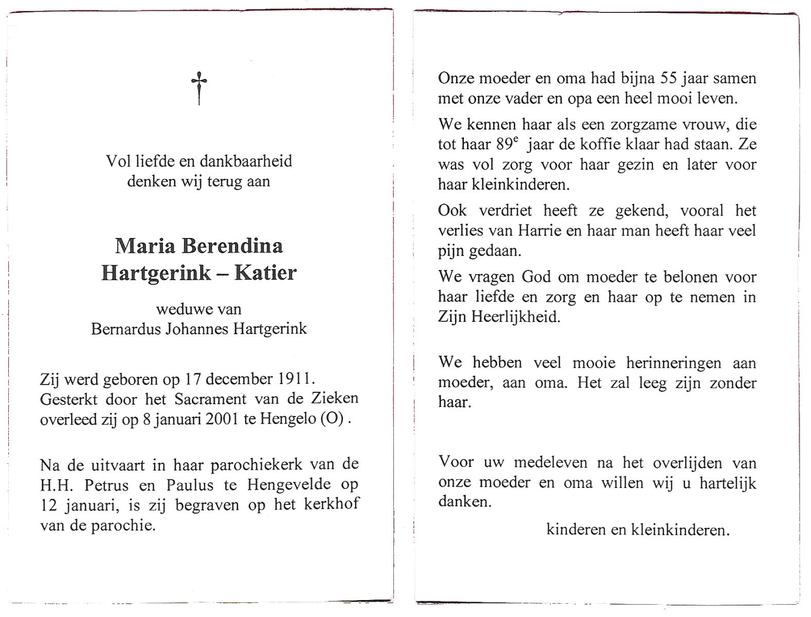 KATIER, Maria Berendina, geboren op 17-12-1911, overleden op 8-1-2001 te Hengelo (Ov.) op 89-jarige leeftijd, begraven op 12-1-2001 te Hengevelde.