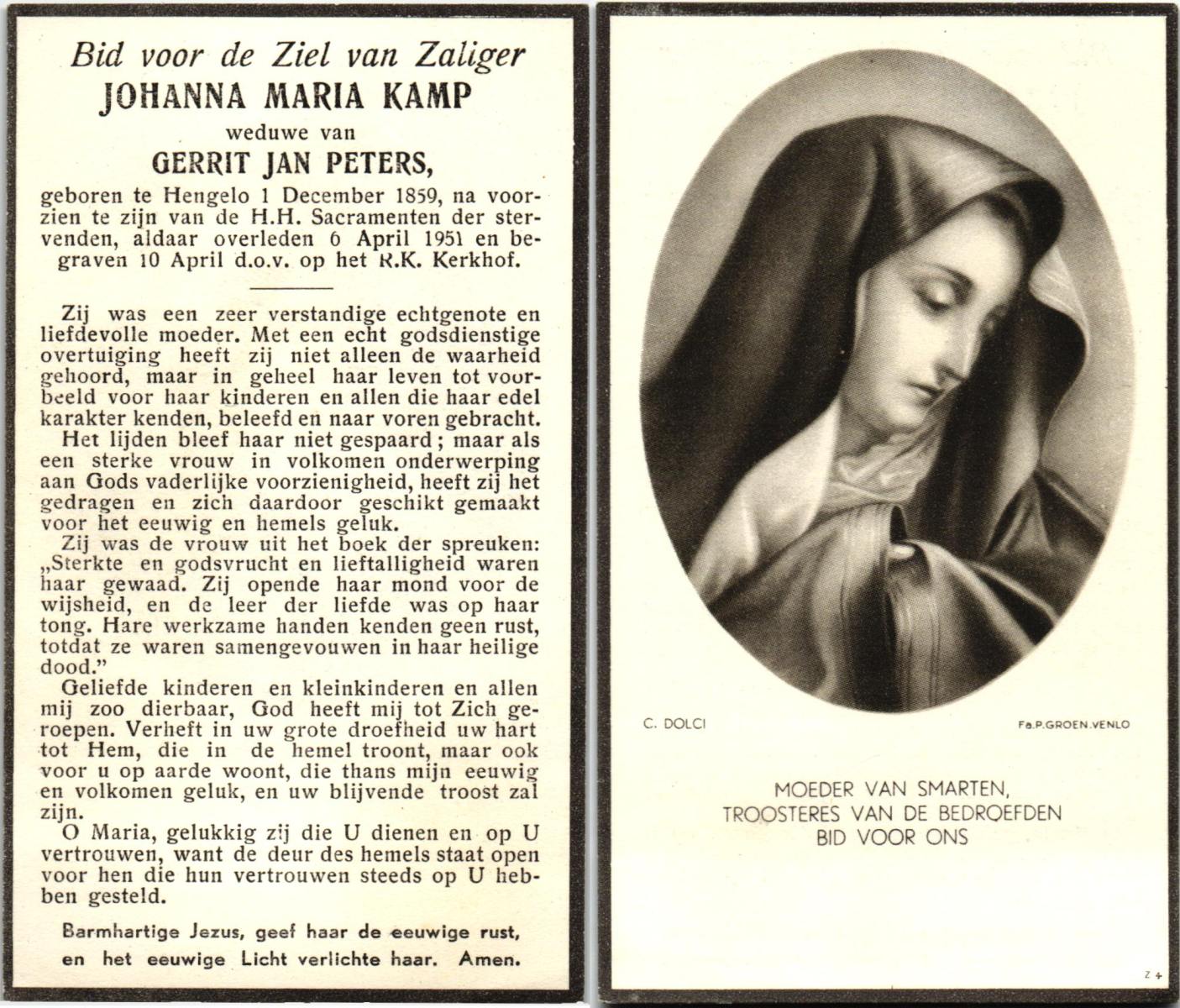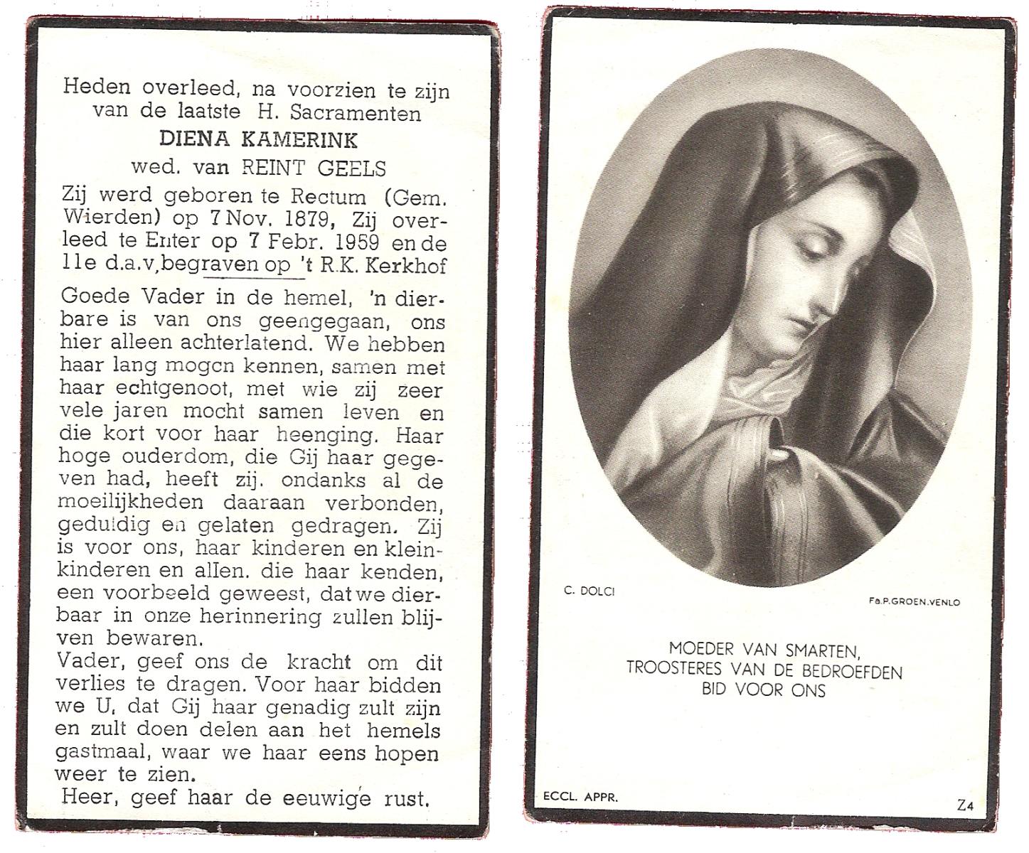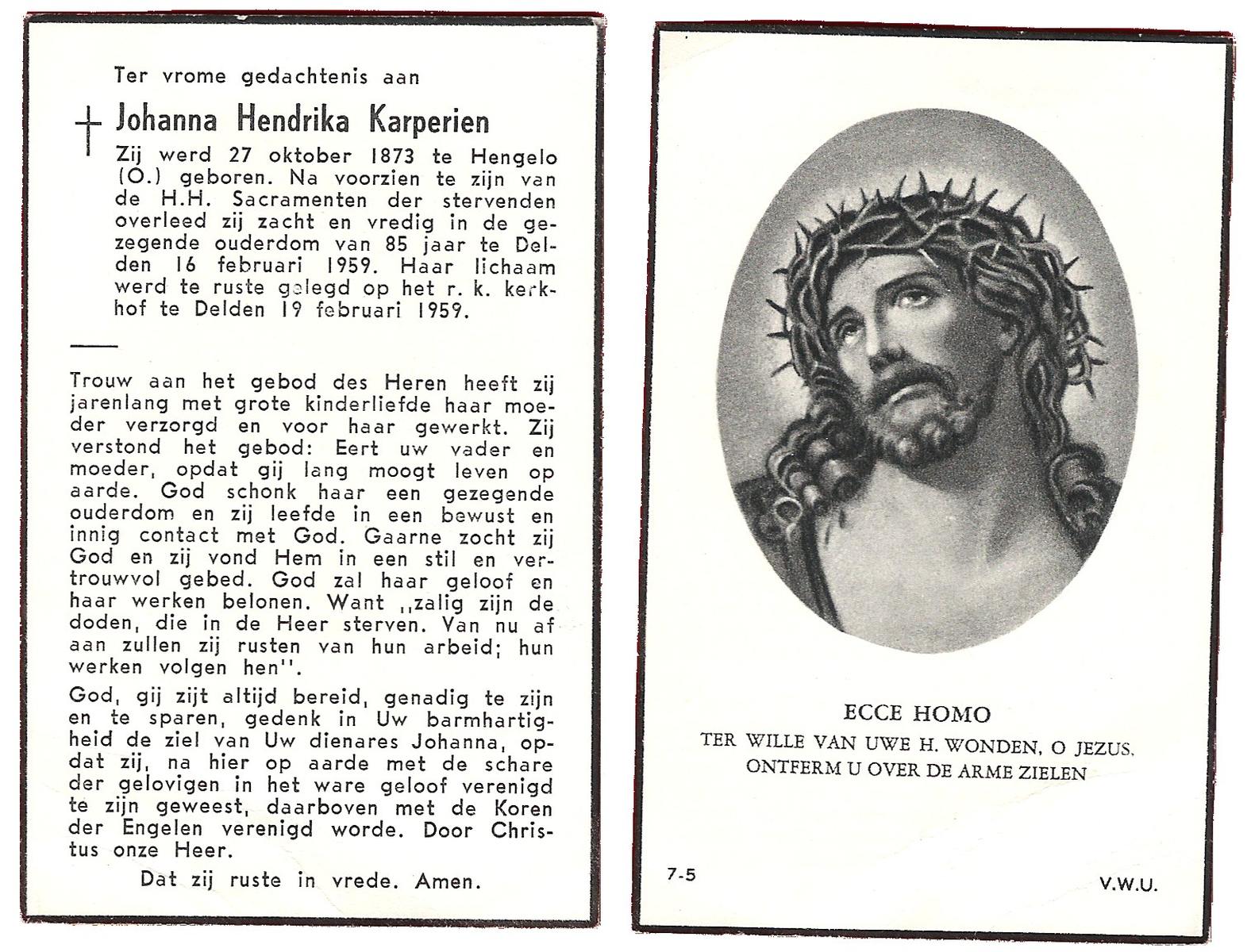 KARPERIEN, Johanna Hendrika, geboren op 27-10-1873 te Hengelo (O), overleden op 16-2-1959 te Delden op 85-jarige leeftijd, begraven op 19-2-1959 te Delden.