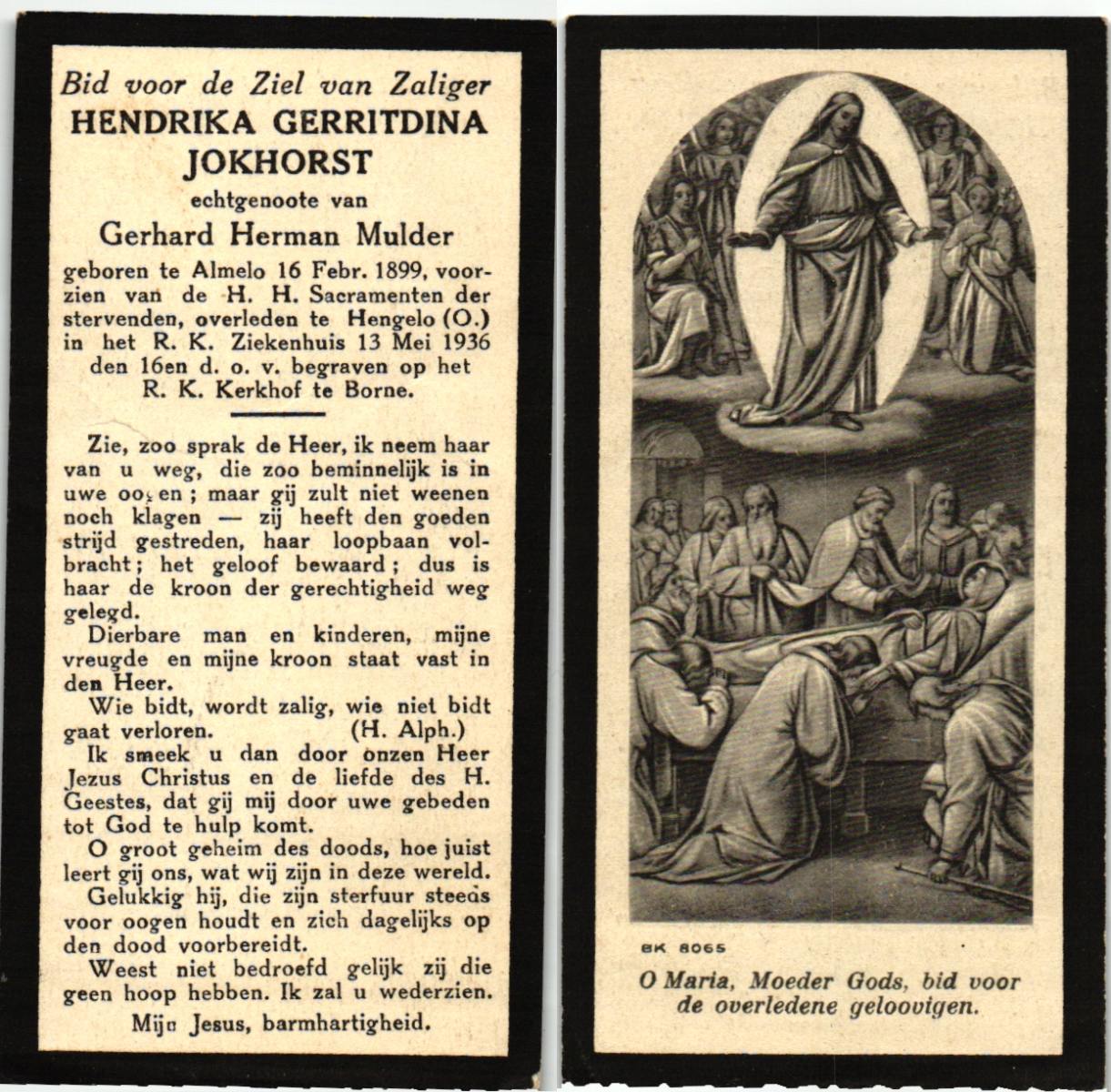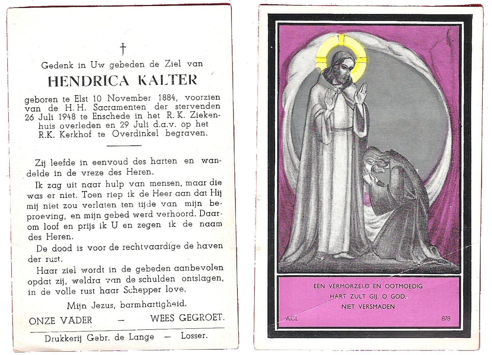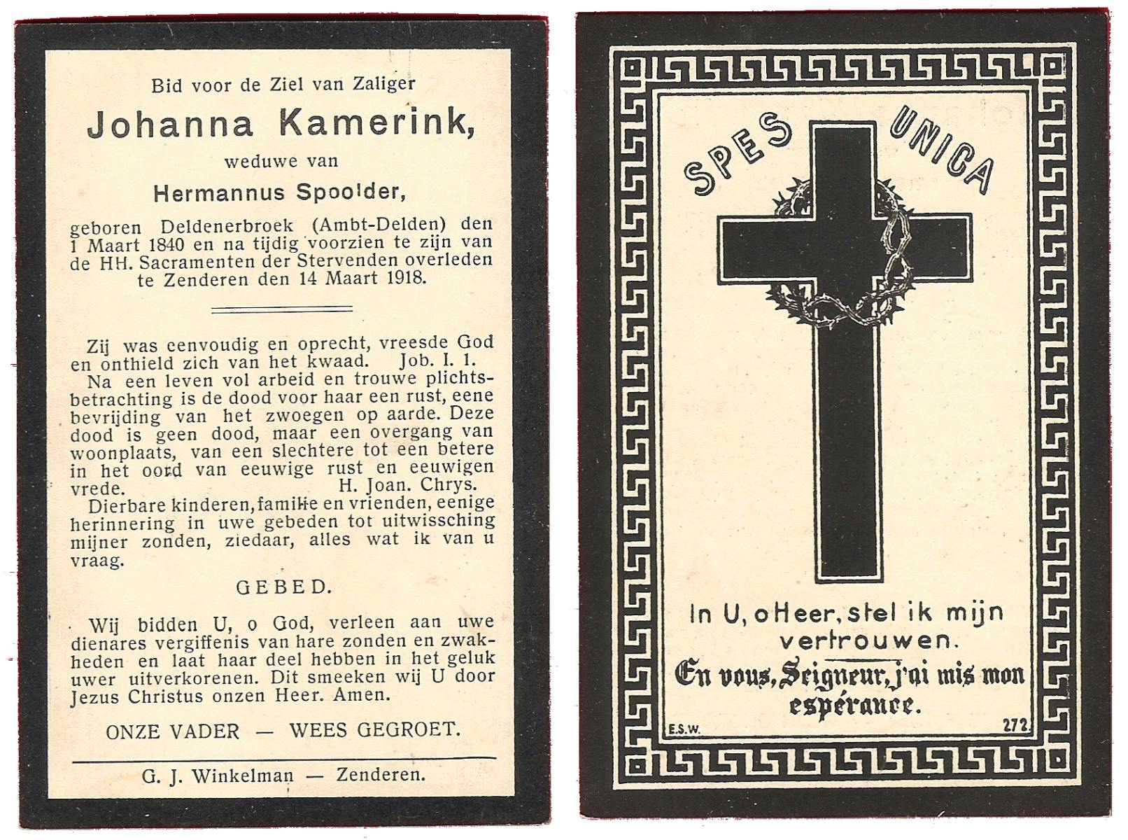 KARPERIEN, Johanna Hendrika, geboren op 27-10-1873 te Hengelo (O), overleden op 16-2-1959 te Delden op 85-jarige leeftijd, begraven op 19-2-1959 te Delden.