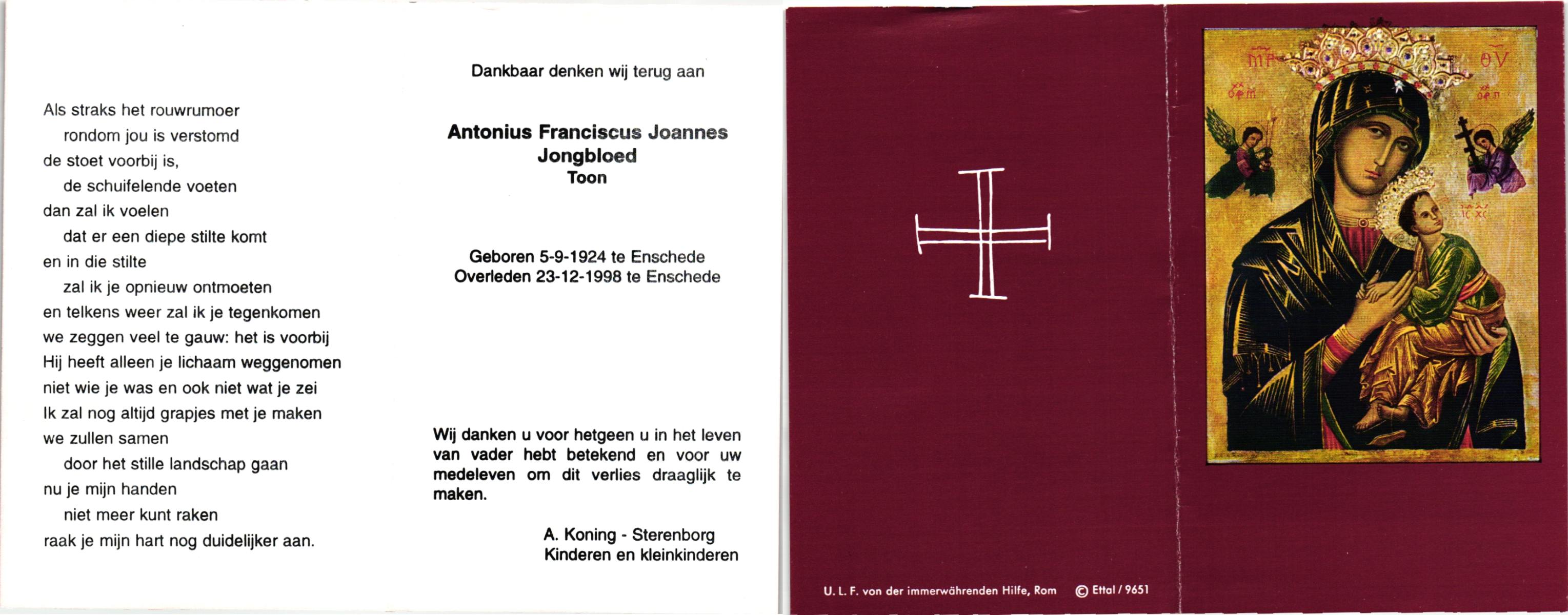 JANSEN, Johannes Franciscus, geboren op 21-11-1908 te Almelo, overleden op 30-11-1992 op 84-jarige leeftijd, gecremeerd te Almelo.