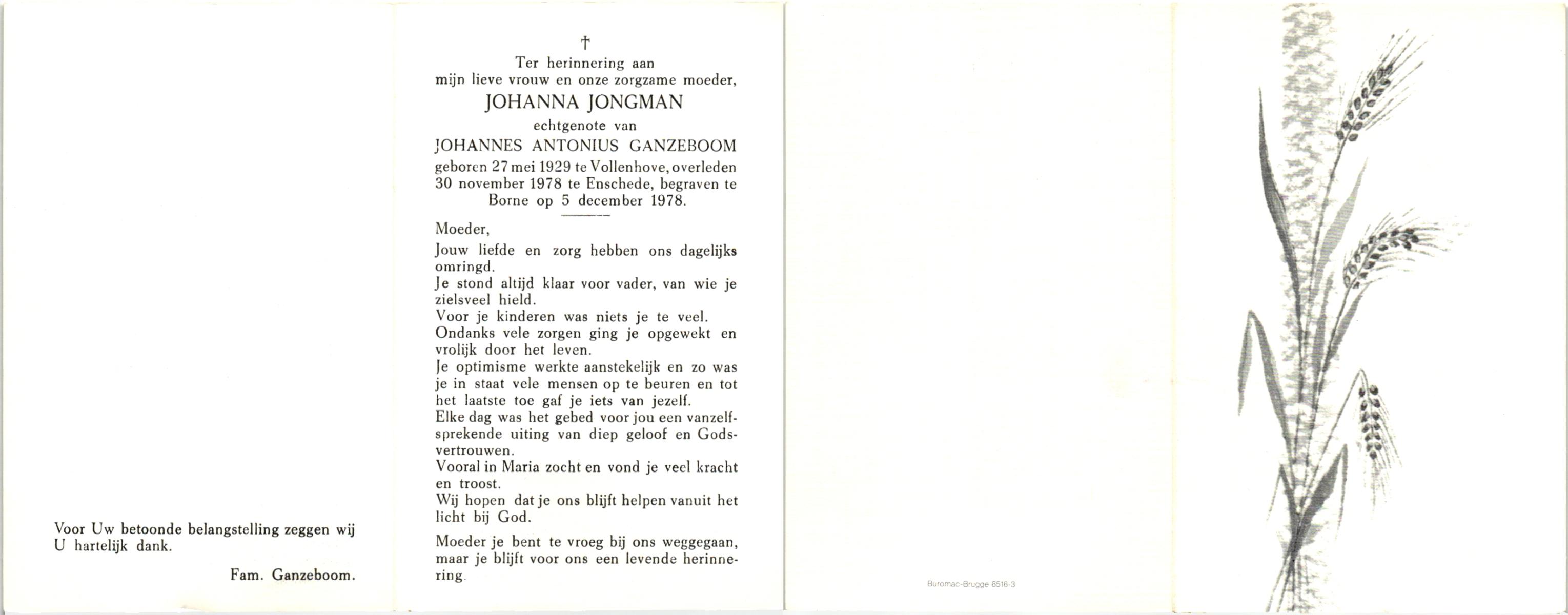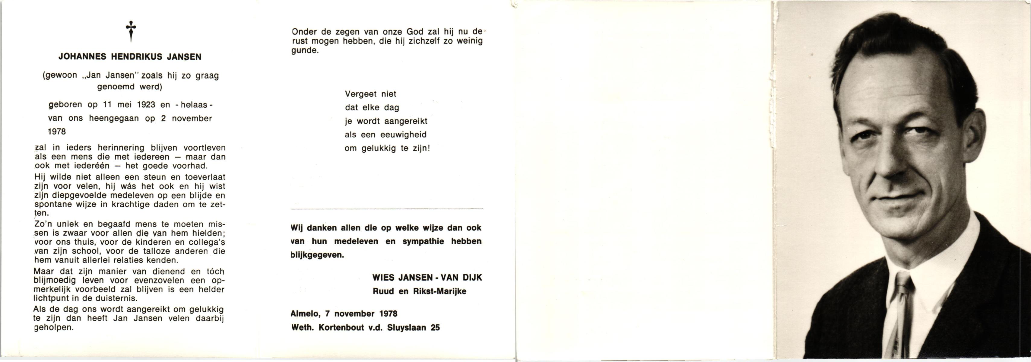 JANSEN, Johannes Hendrikus, geboren op 11-5-1923, overleden op 2-11-1978 te Almelo op 55-jarige leeftijd.