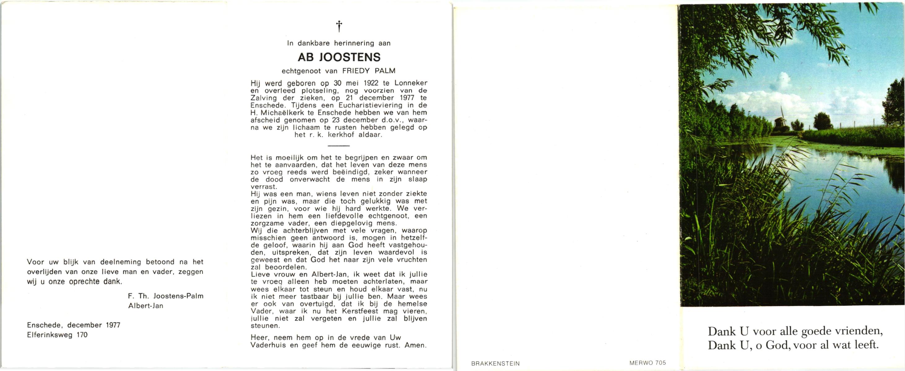 JANSINK, Antonius Johannes, geboren op 9-7-1912 te Lonneker, overleden op 29-9-1977 te Enschede op 65-jarige leeftijd, begraven op 3-10-1977 te Enschede.