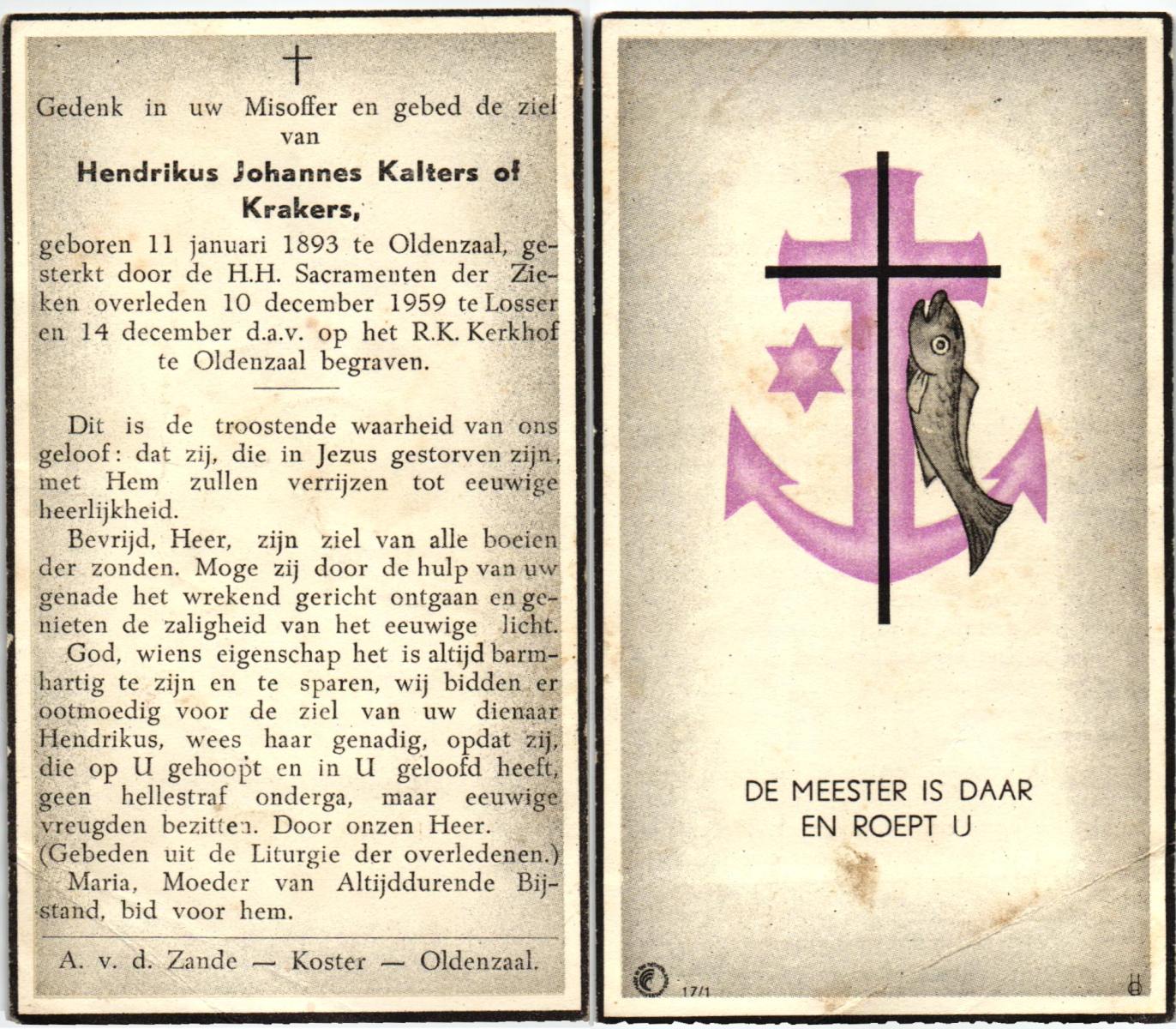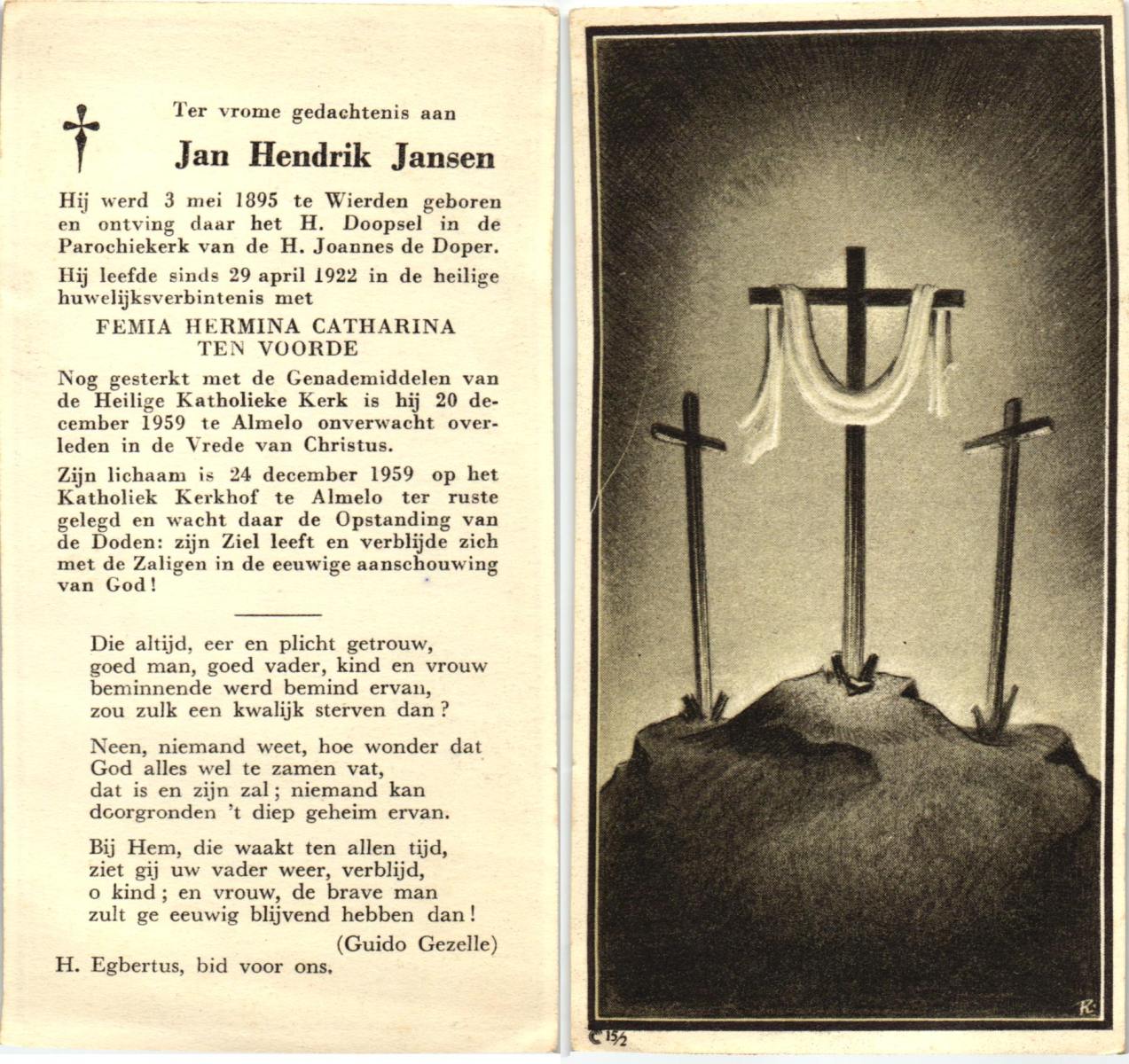 JANSEN, Jan Hendrik, geboren op 03-05-1895 te Wierden, overleden op 20-12-1959 te Almelo op 64-jarige leeftijd, begraven op 24-12-1959 te Almelo.