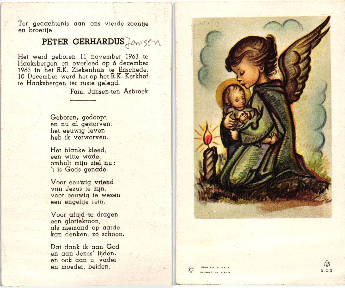 JANSEN, Peter Gerhardus, geboren op 11-11-1963 te Haaksbergen, overleden op 6-12-1963 te Enschede, ziekenhuis op 0-jarige leeftijd, begraven op 10-12-1963 te Haaksbergen.