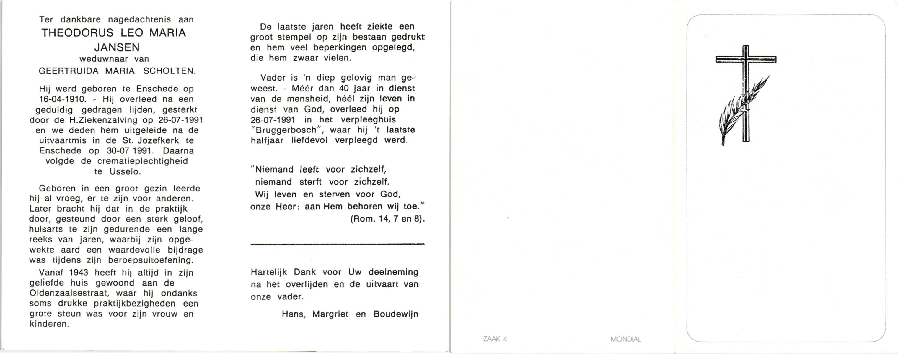 JANSEN, Theodorus Leo Maria, geboren op 16-4-1910 te Enschede, overleden op 26-7-1991 te Enschede op 81-jarige leeftijd, gecremeerd op 30-7-1991 te Usselo.