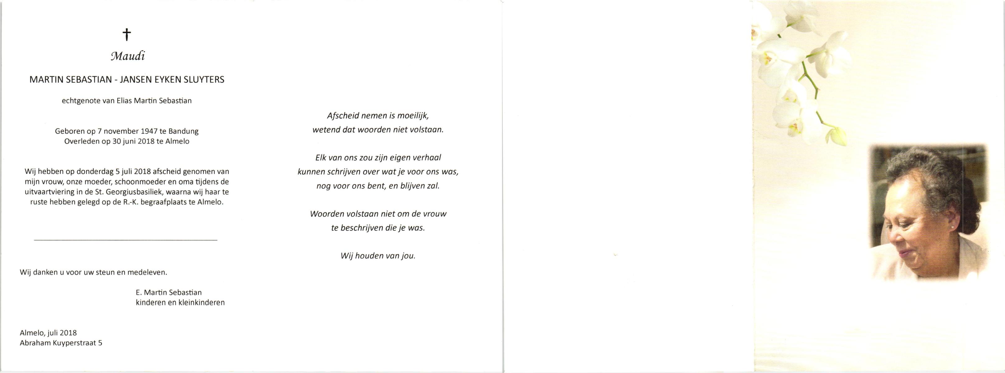 JANSEN EYKEN SLUYTERS, Maudi, geboren op 7-11-1947 te Bandung, Indon., overleden op 30-6-2018 te Almelo op 70-jarige leeftijd, begraven op 5-7-2018 te Almelo.