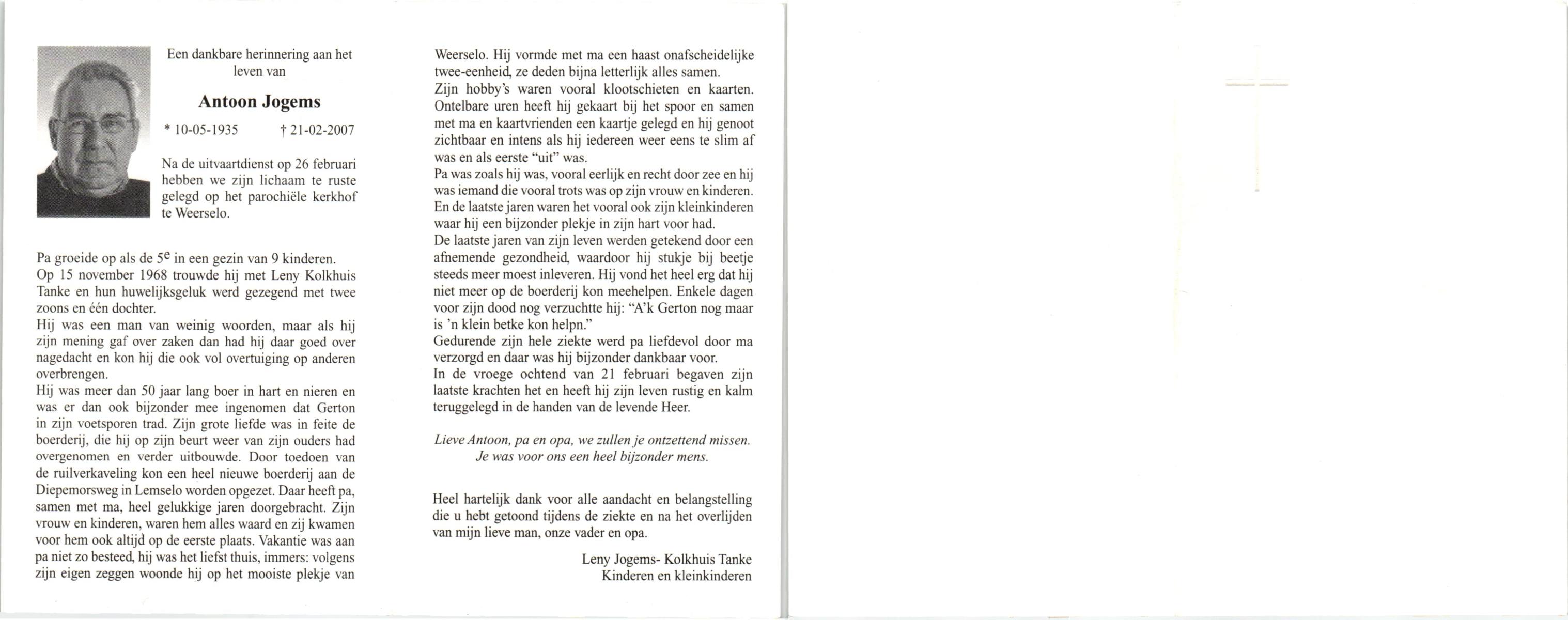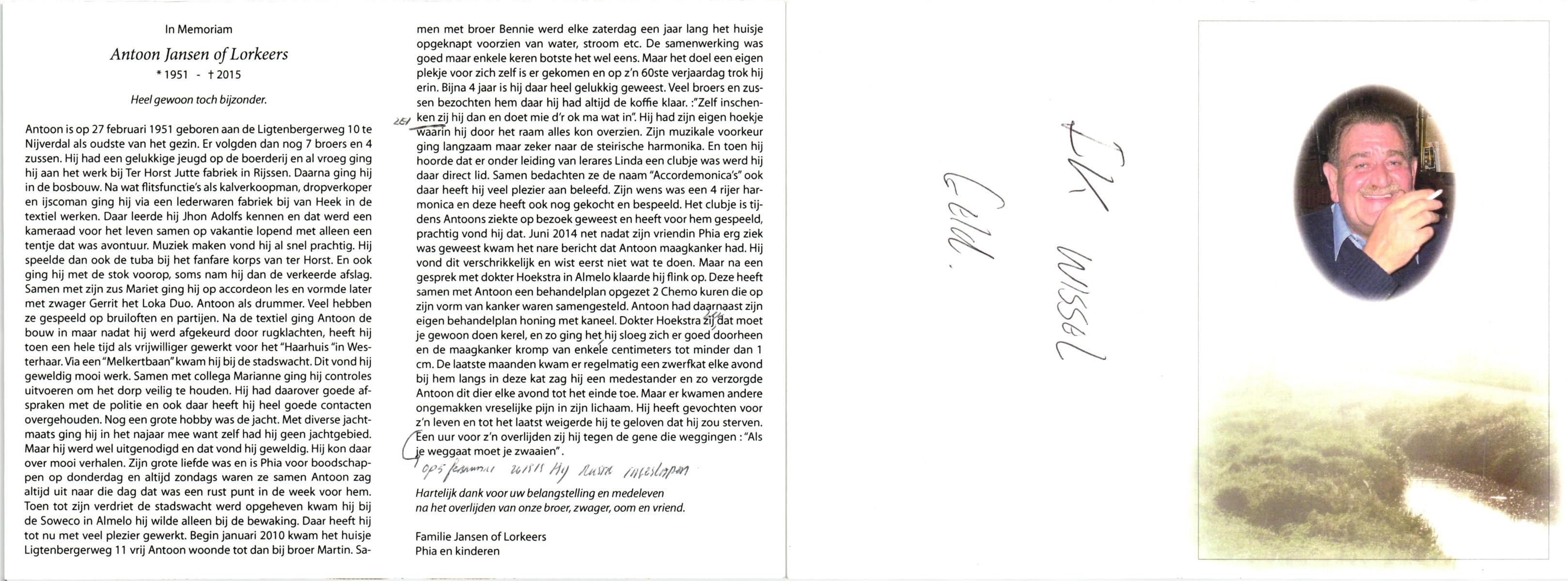 JANSEN of LORKEERS, Antoon, geboren op 27-2-1951 te Hellendoorn, Nijverdal, overleden op 5-2-2015 op 63-jarige leeftijd.