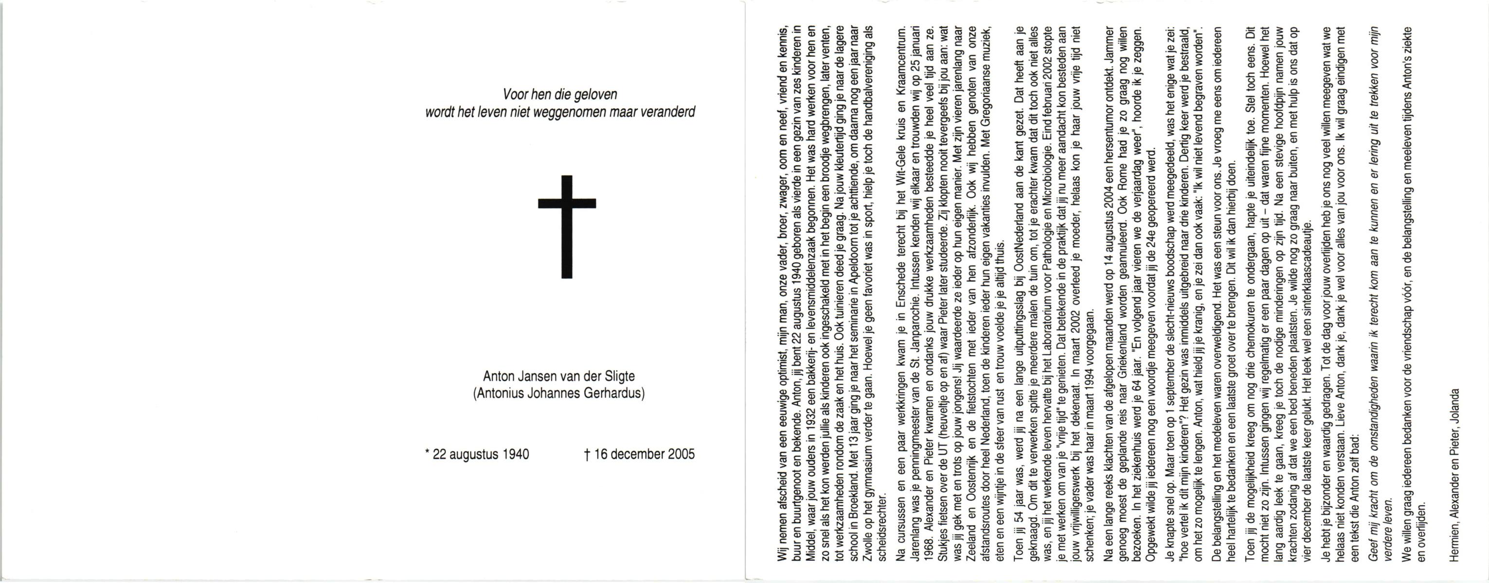 JANSEN van de SLIGTE, Anton, geboren op 22-8-1940 te Raalte, Middel, overleden op 16-12-2005 te Enschede op 65-jarige leeftijd.
