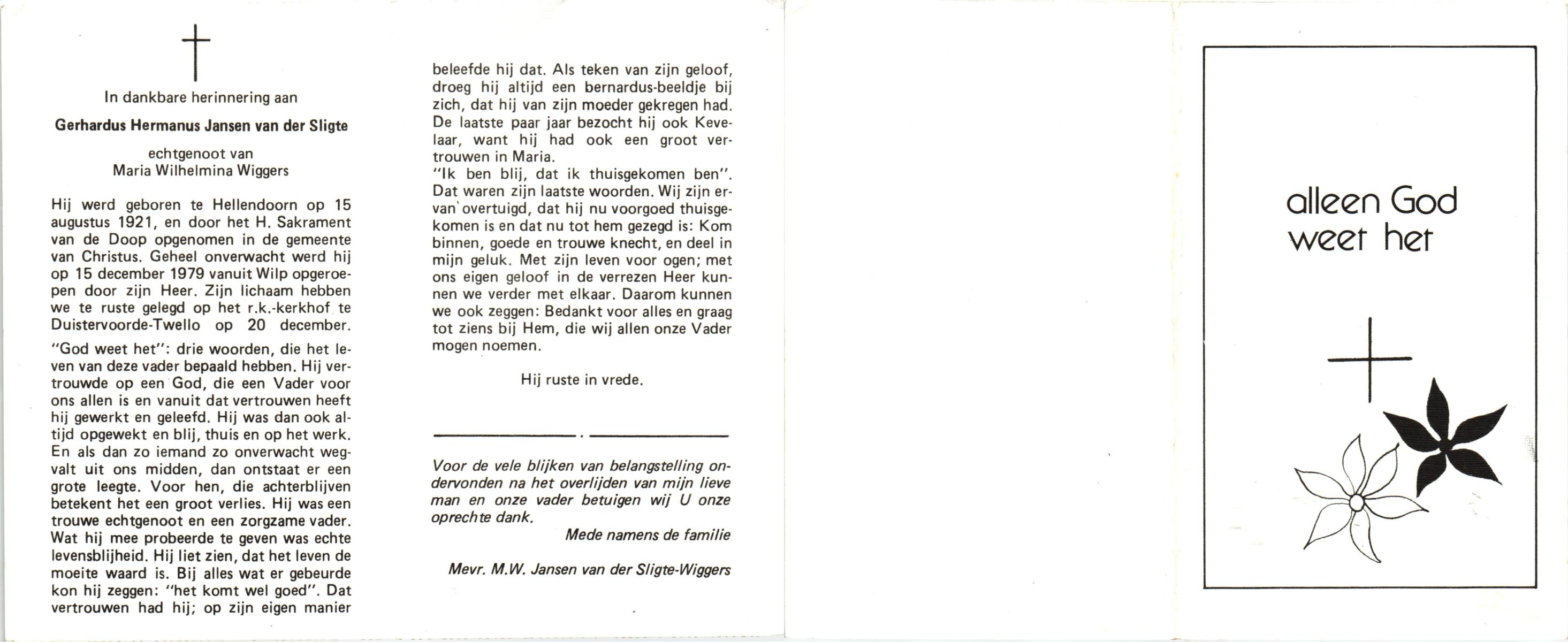 JANSEN van der SLIGTE, Gerhardus Hermanus, geboren op 15-8-1921 te Hellendoorn, overleden op 15-12-1979 te Wilp op 58-jarige leeftijd, begraven op 20-12-1979 te Twello.