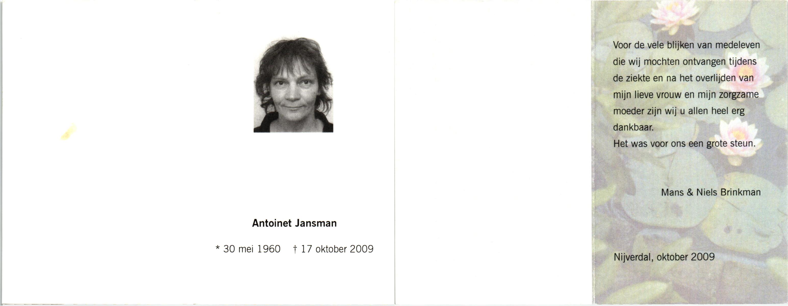 JANSMAN, Antoinet, geboren op 30-5-1960, overleden op 17-10-2009 te Hellendoorn, Nijverdal op 49-jarige leeftijd.
