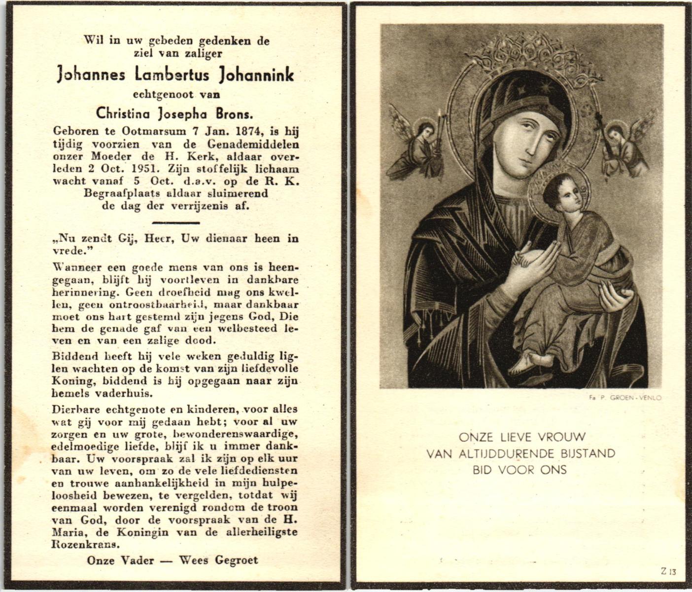 JANSINK, Johannes Lambertus, geboren op 24-03-1898 te Losser, overleden op 7-11-1964 te Losser op 66-jarige leeftijd, begraven op 11-11-1964 te Losser.
