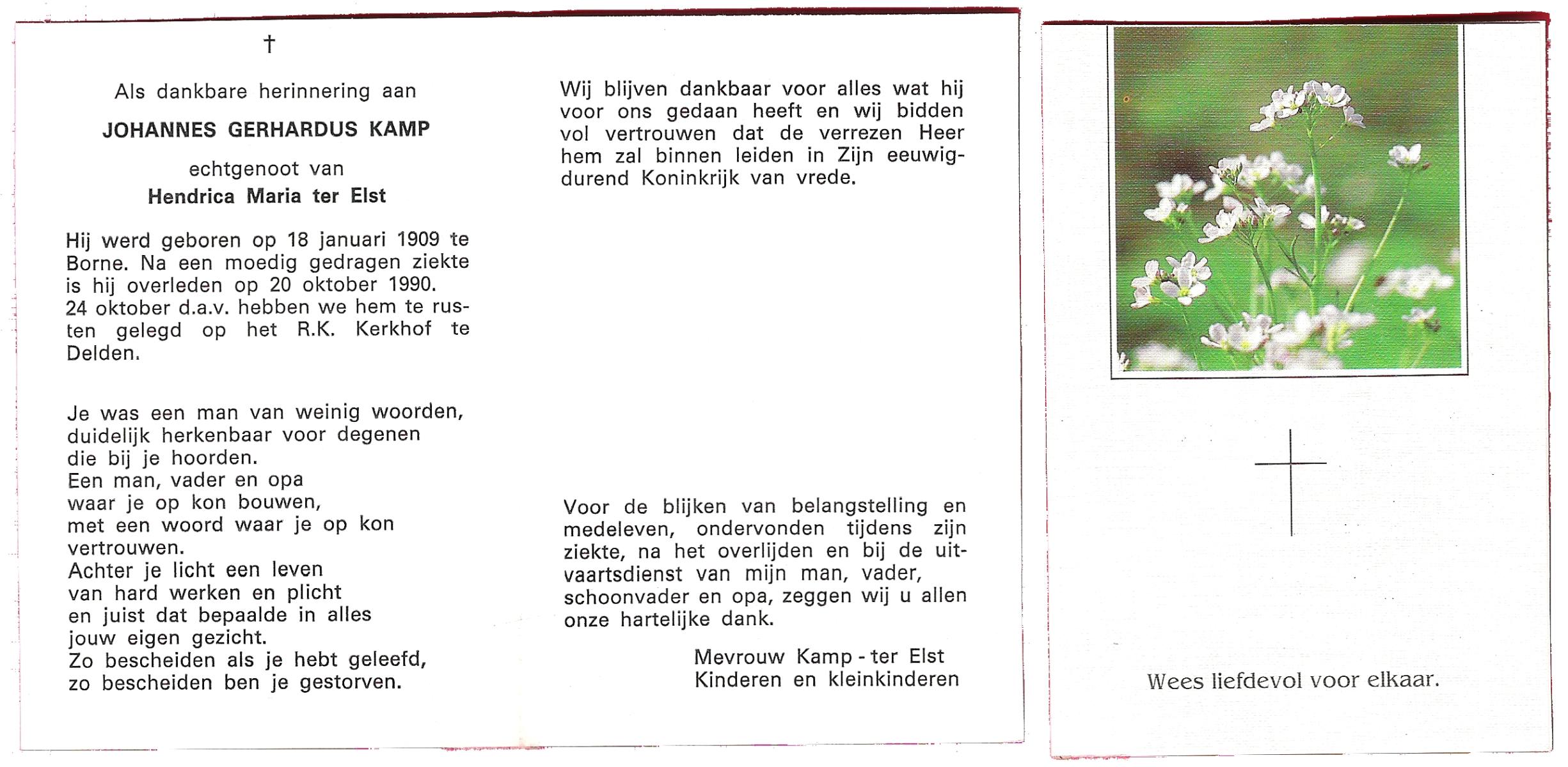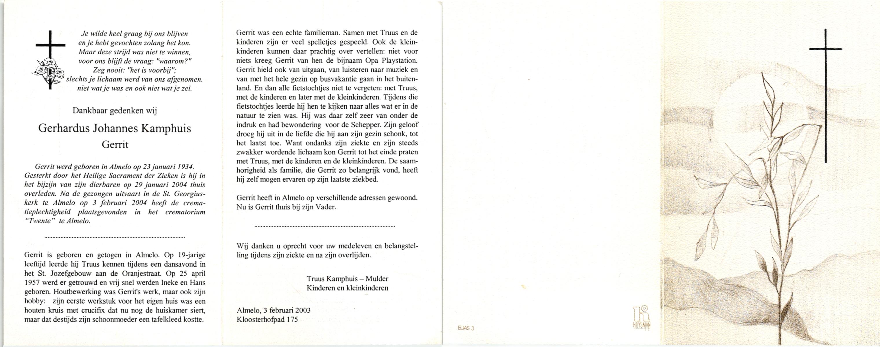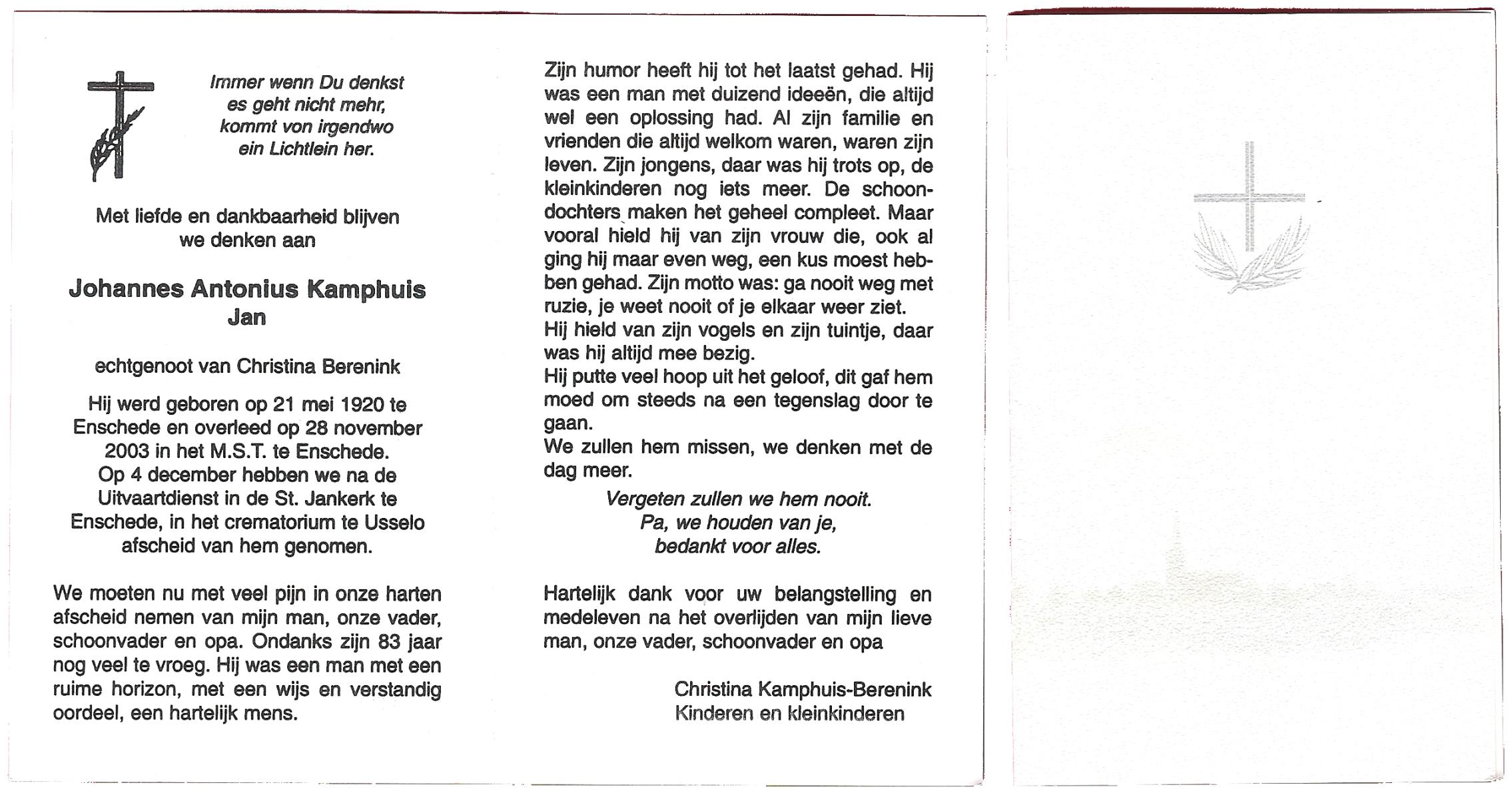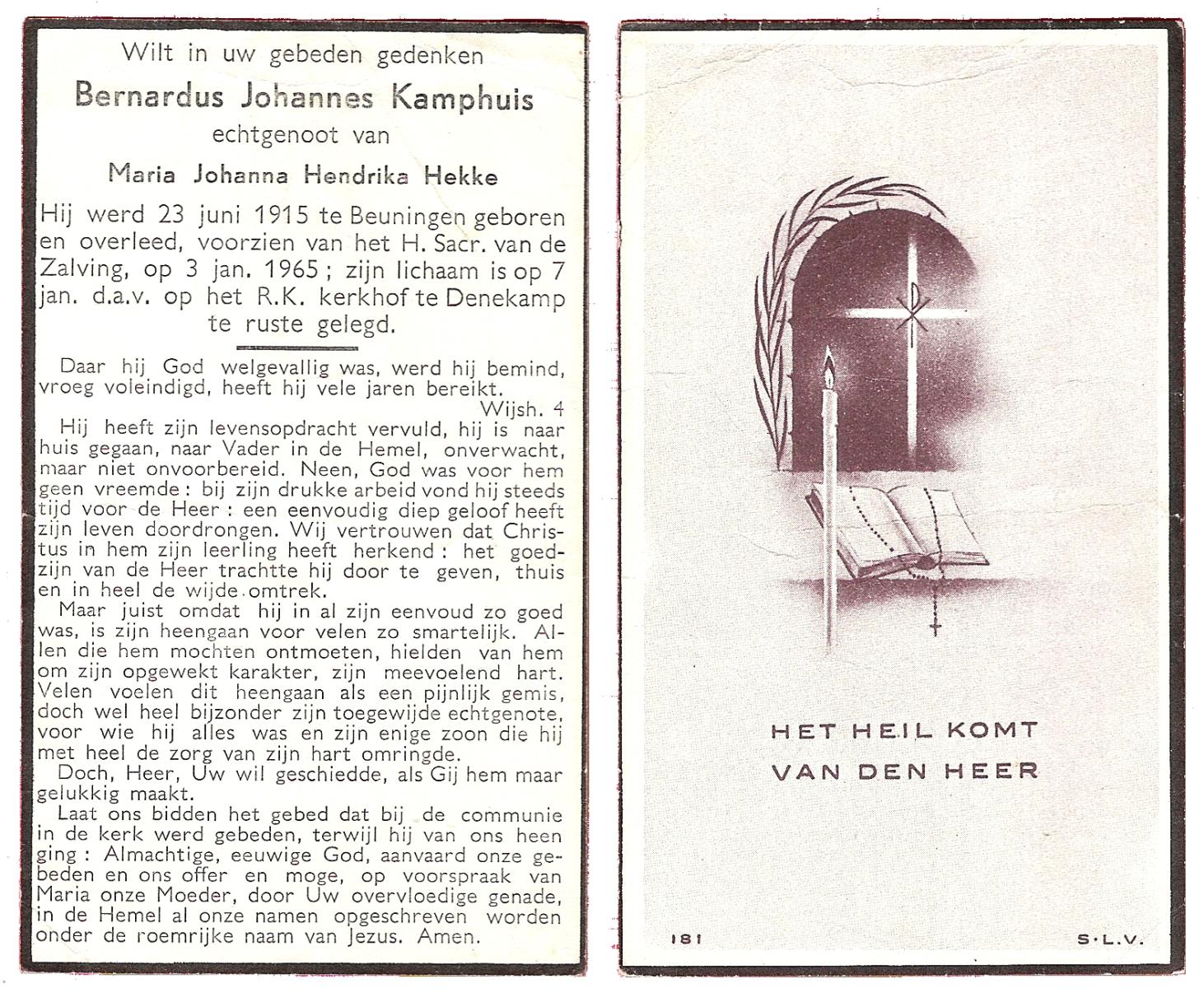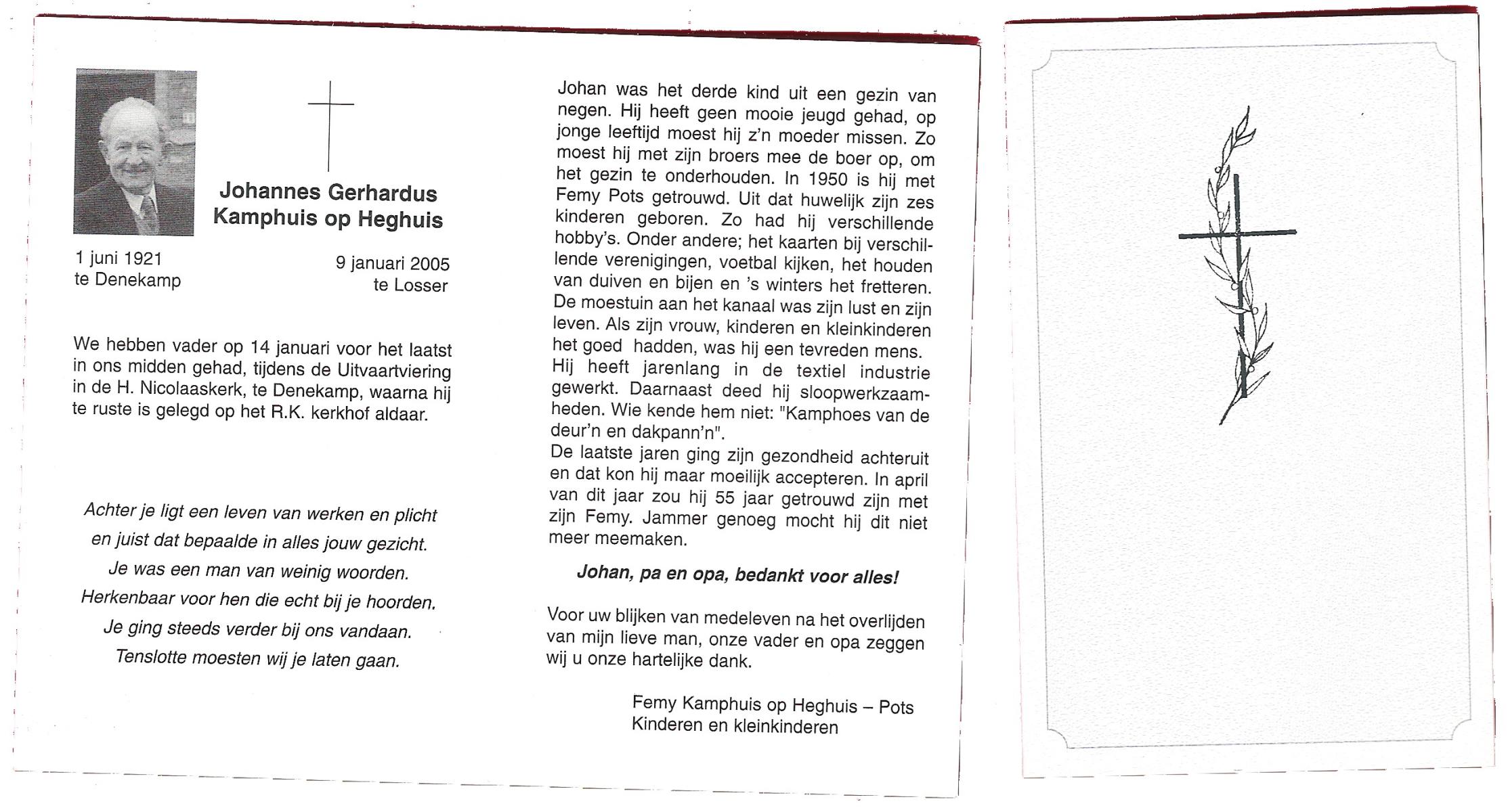 KAMPHUIS op HEGHUIS, Johannes Gerhardus, geboren op 1-6-1921 te Denekamp, overleden op 9-1-2005 te Losser op 83-jarige leeftijd, begraven op 14-1-2005 te Denekamp.