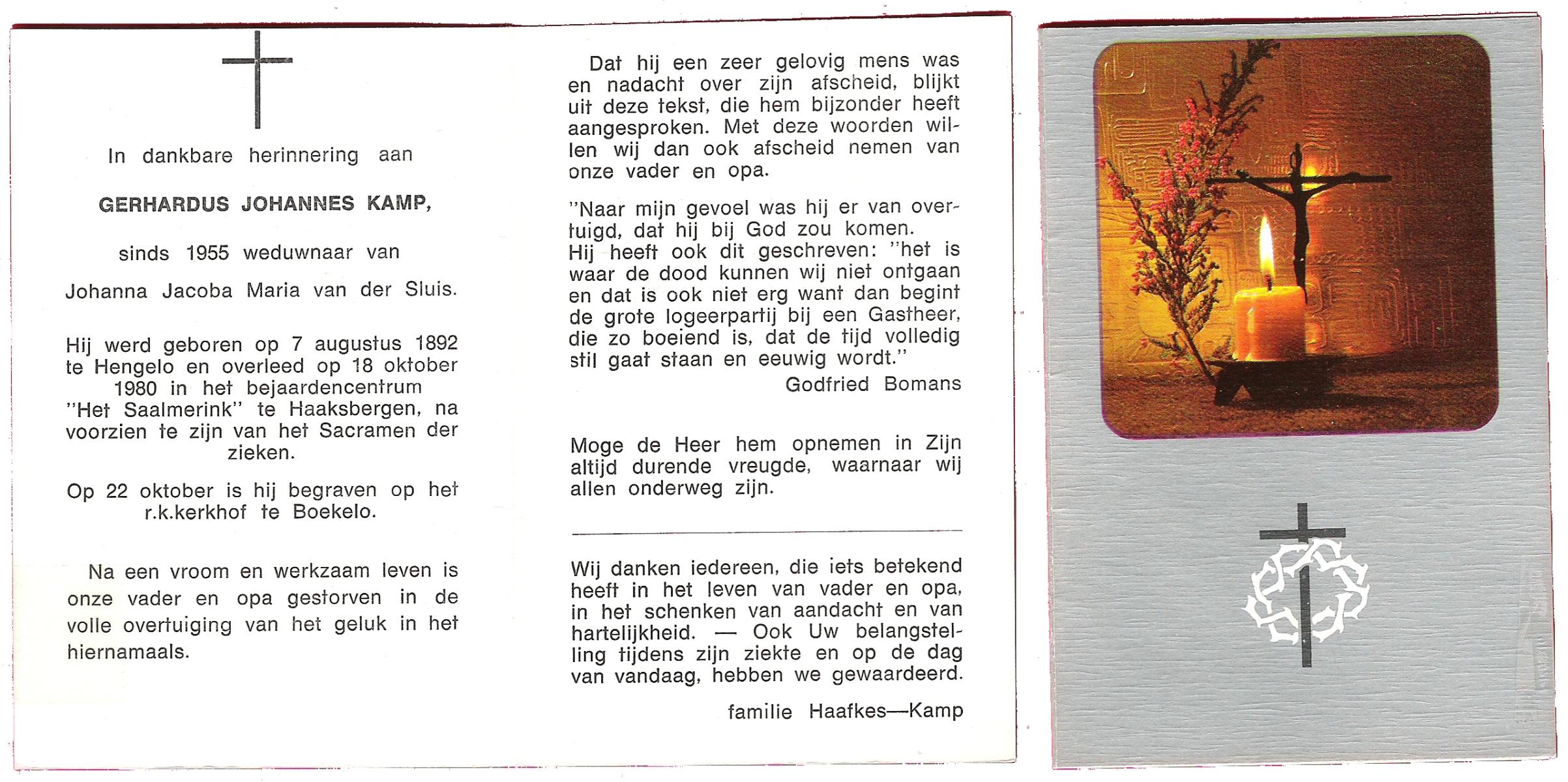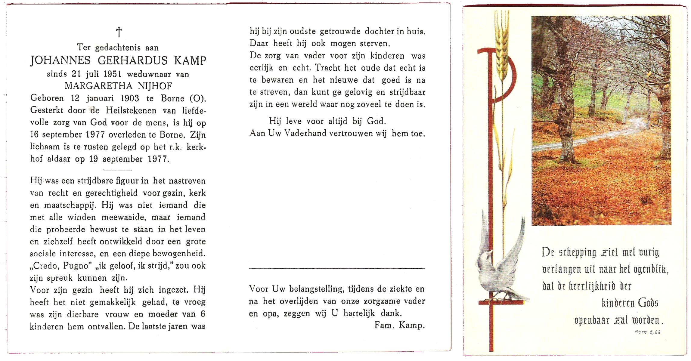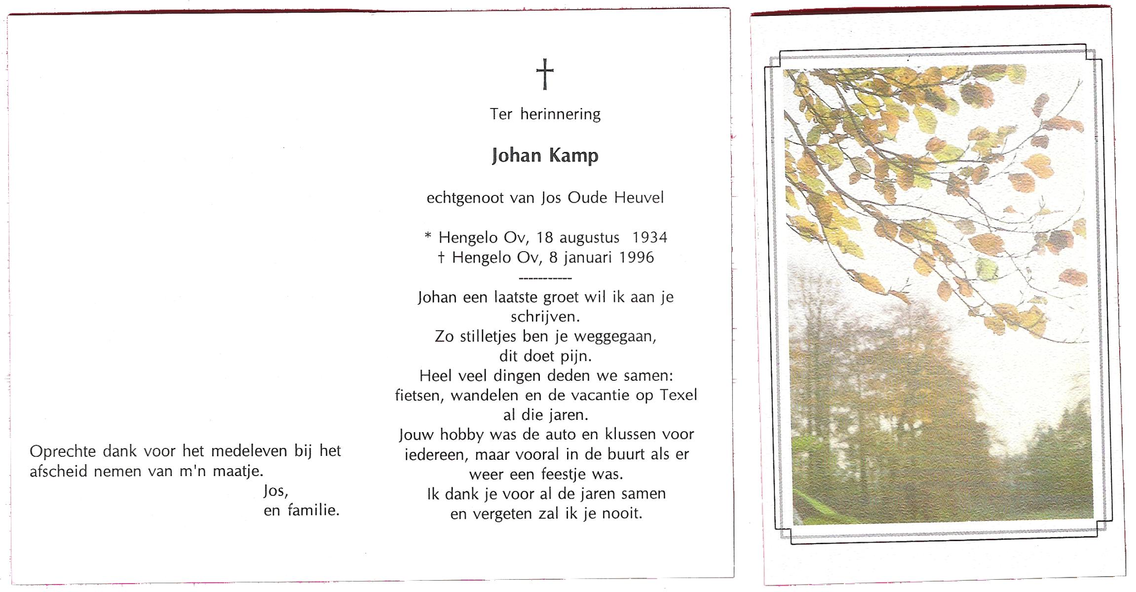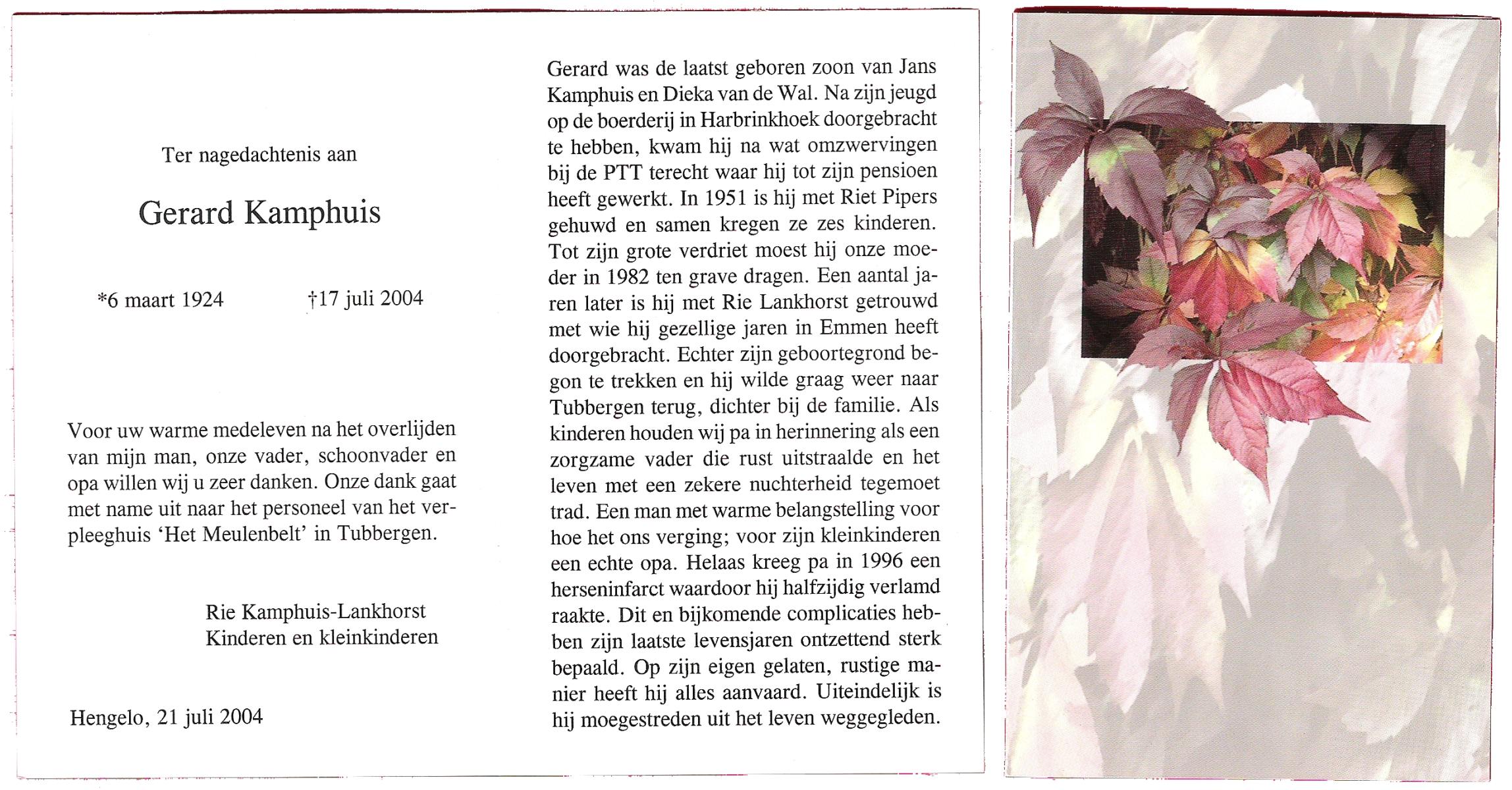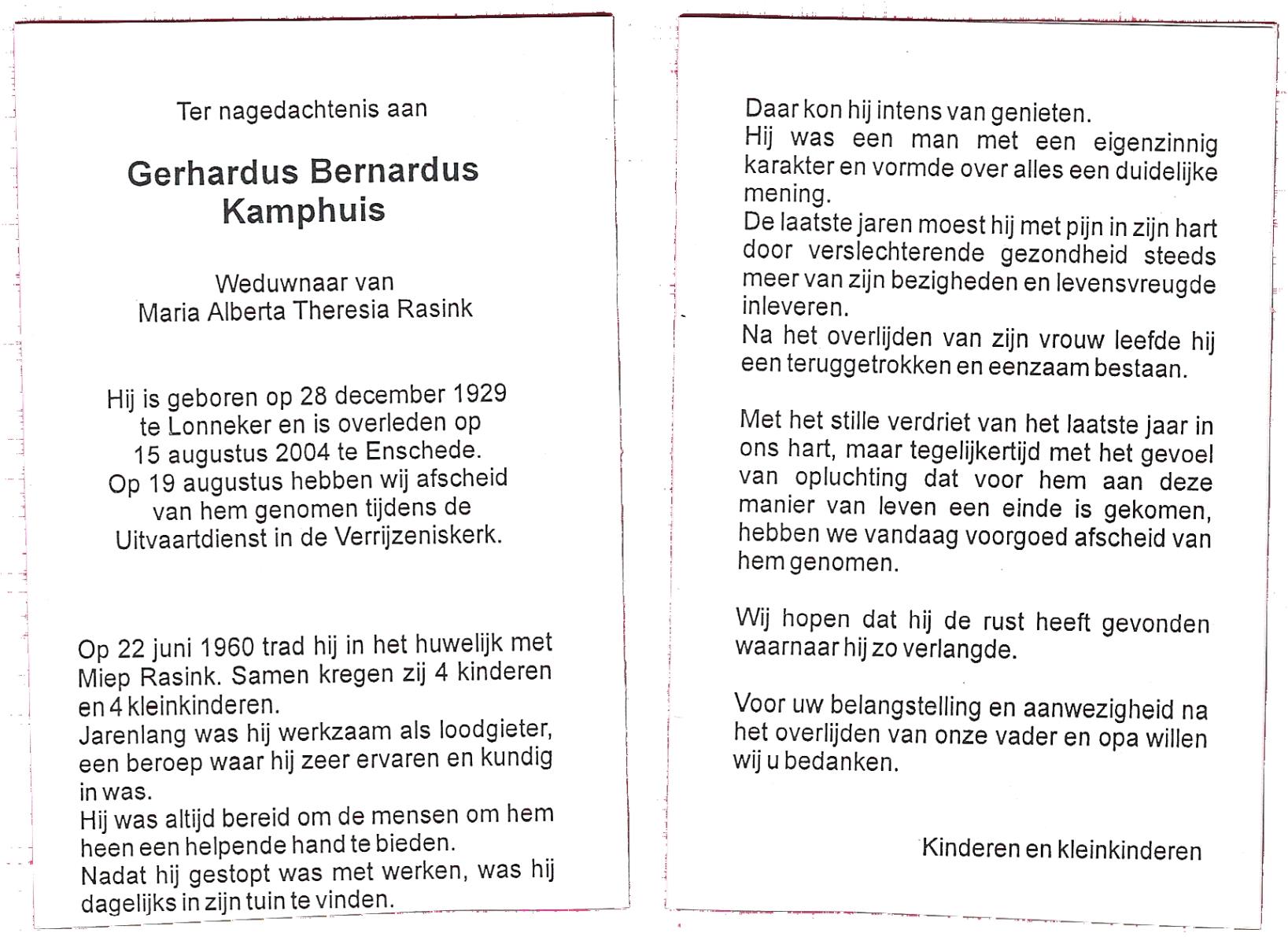 KAMPHUIS op HEGHUIS, Johannes Gerhardus, geboren op 1-6-1921 te Denekamp, overleden op 9-1-2005 te Losser op 83-jarige leeftijd, begraven op 14-1-2005 te Denekamp.