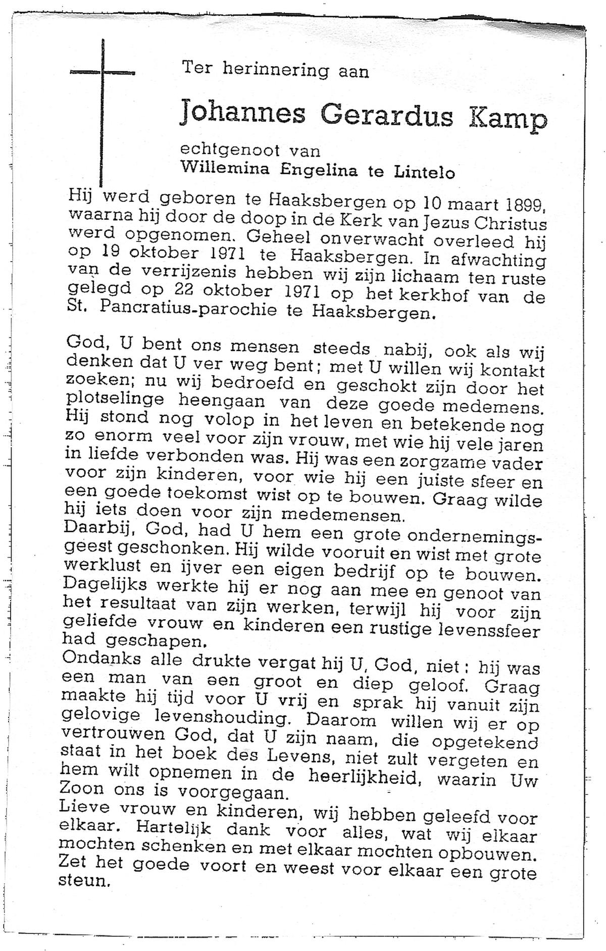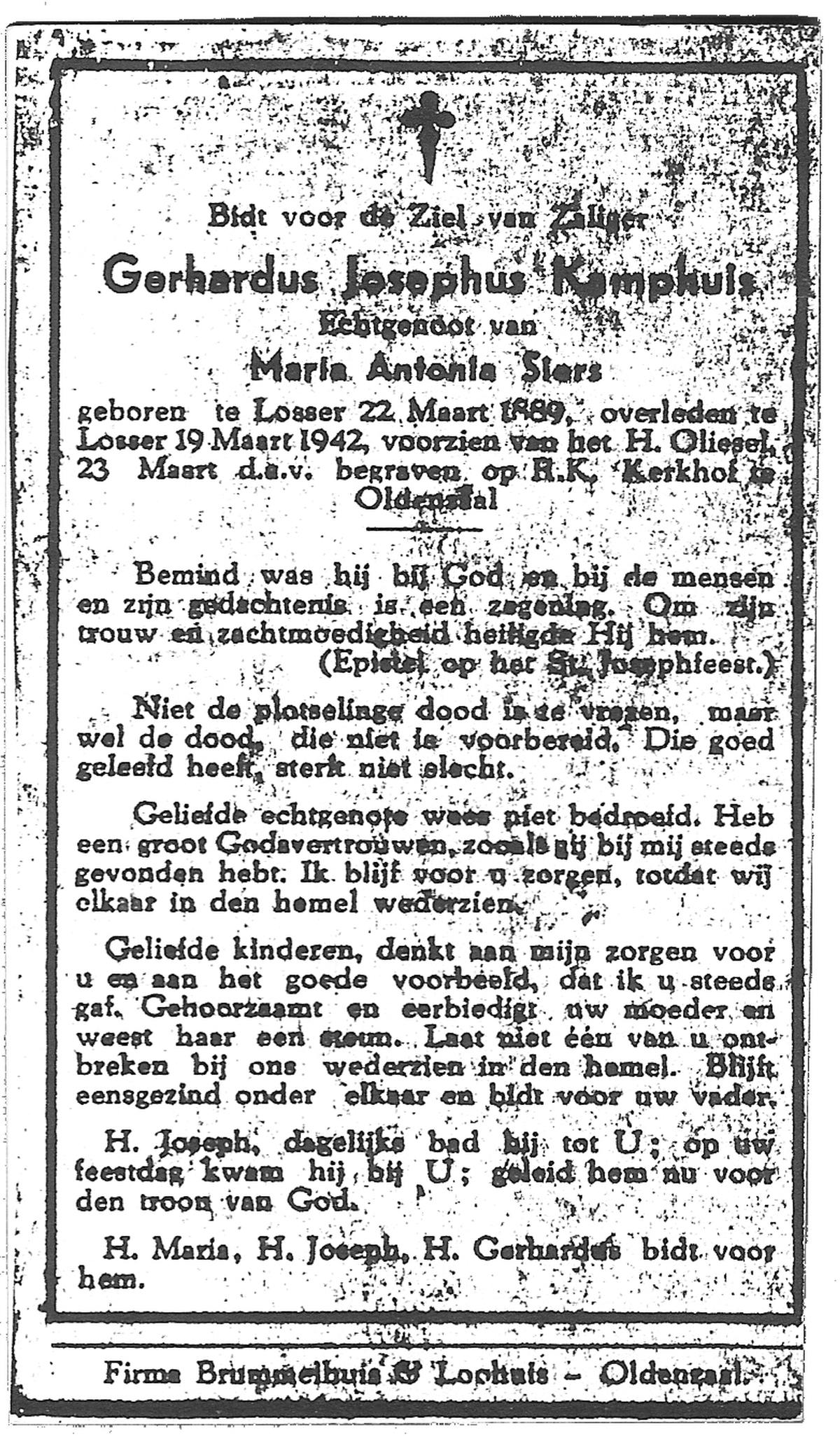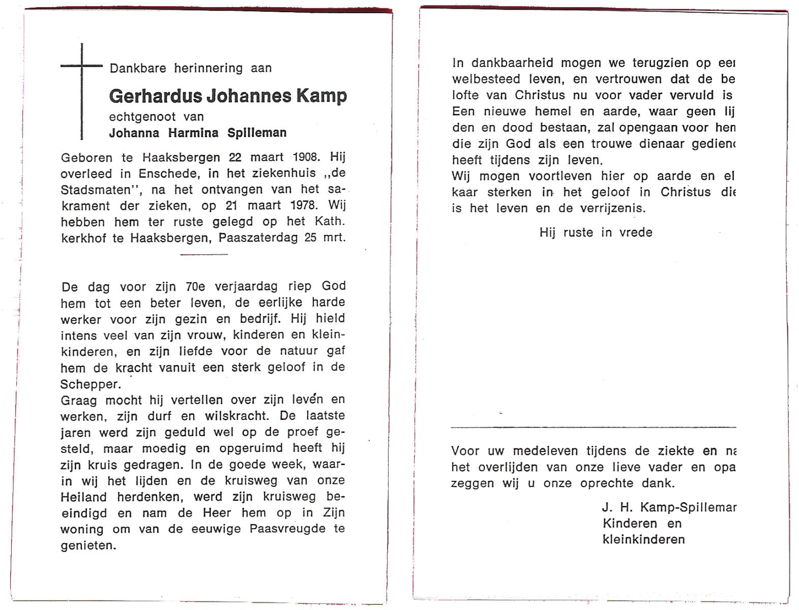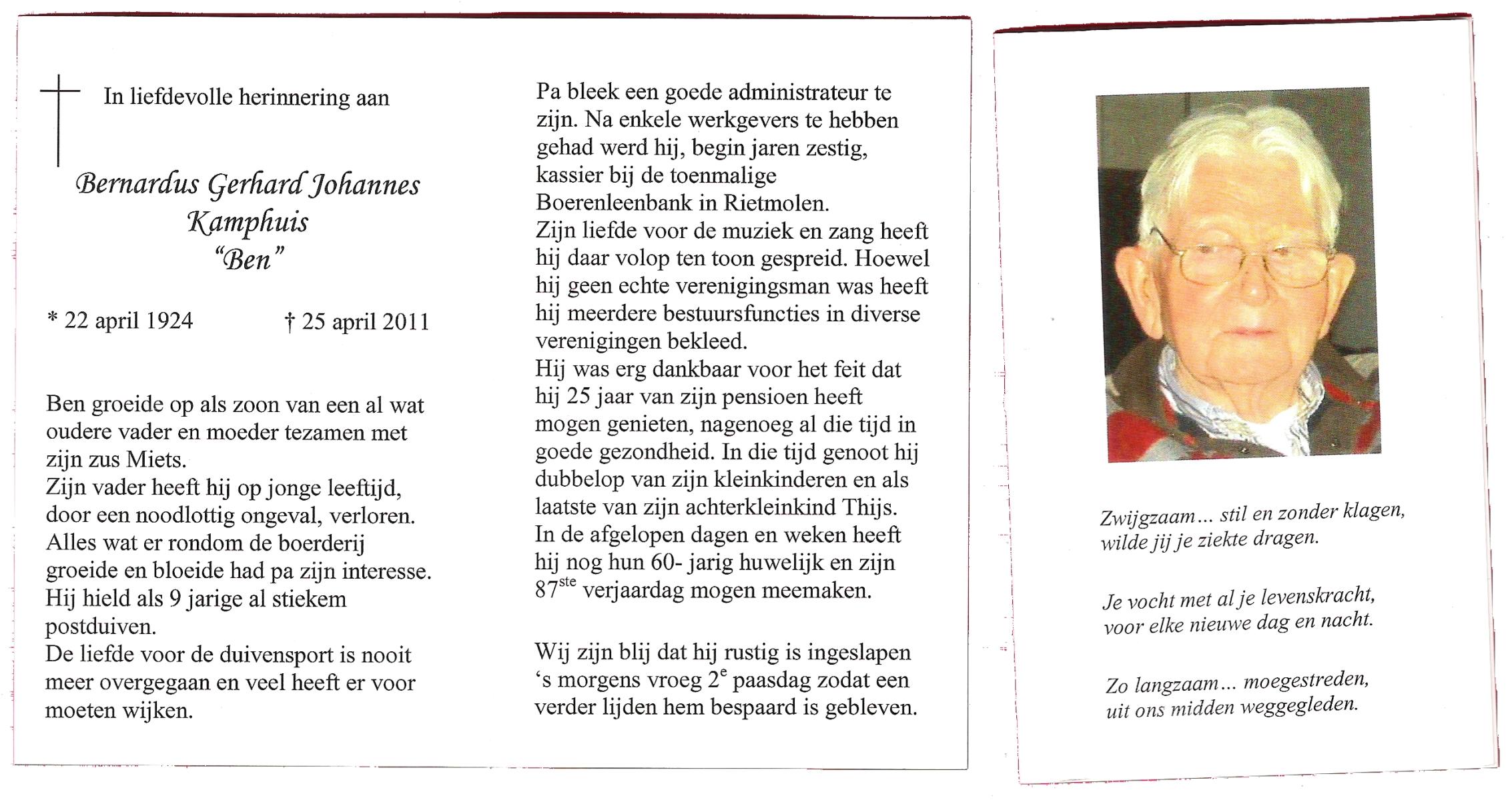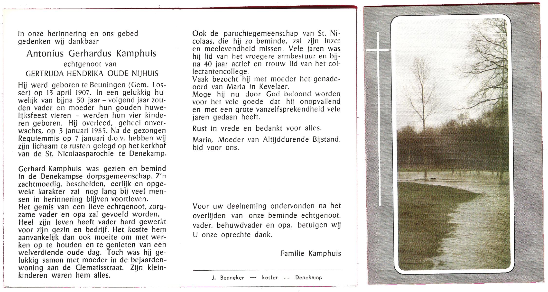 KAMPHUIS op HEGHUIS, Johannes Gerhardus, geboren op 1-6-1921 te Denekamp, overleden op 9-1-2005 te Losser op 83-jarige leeftijd, begraven op 14-1-2005 te Denekamp.