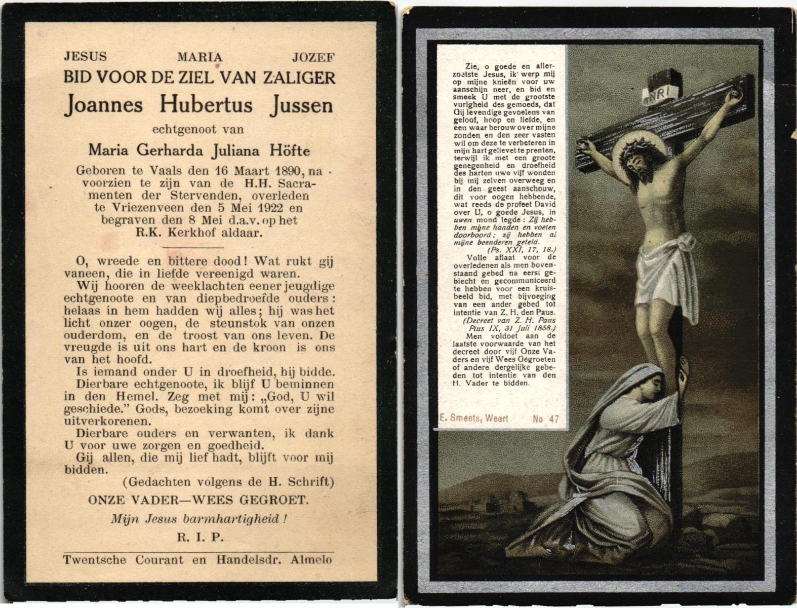 JANSSEN, Jan Joseph, geboren op 3-12-1918 te Rijssen, overleden op 17-10-1990 te Rijssen op 71-jarige leeftijd, begraven op 22-10-1990 te Rijssen.