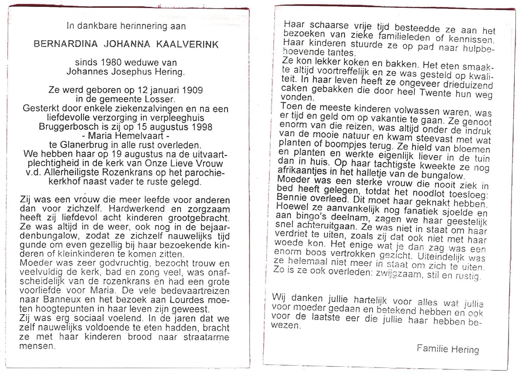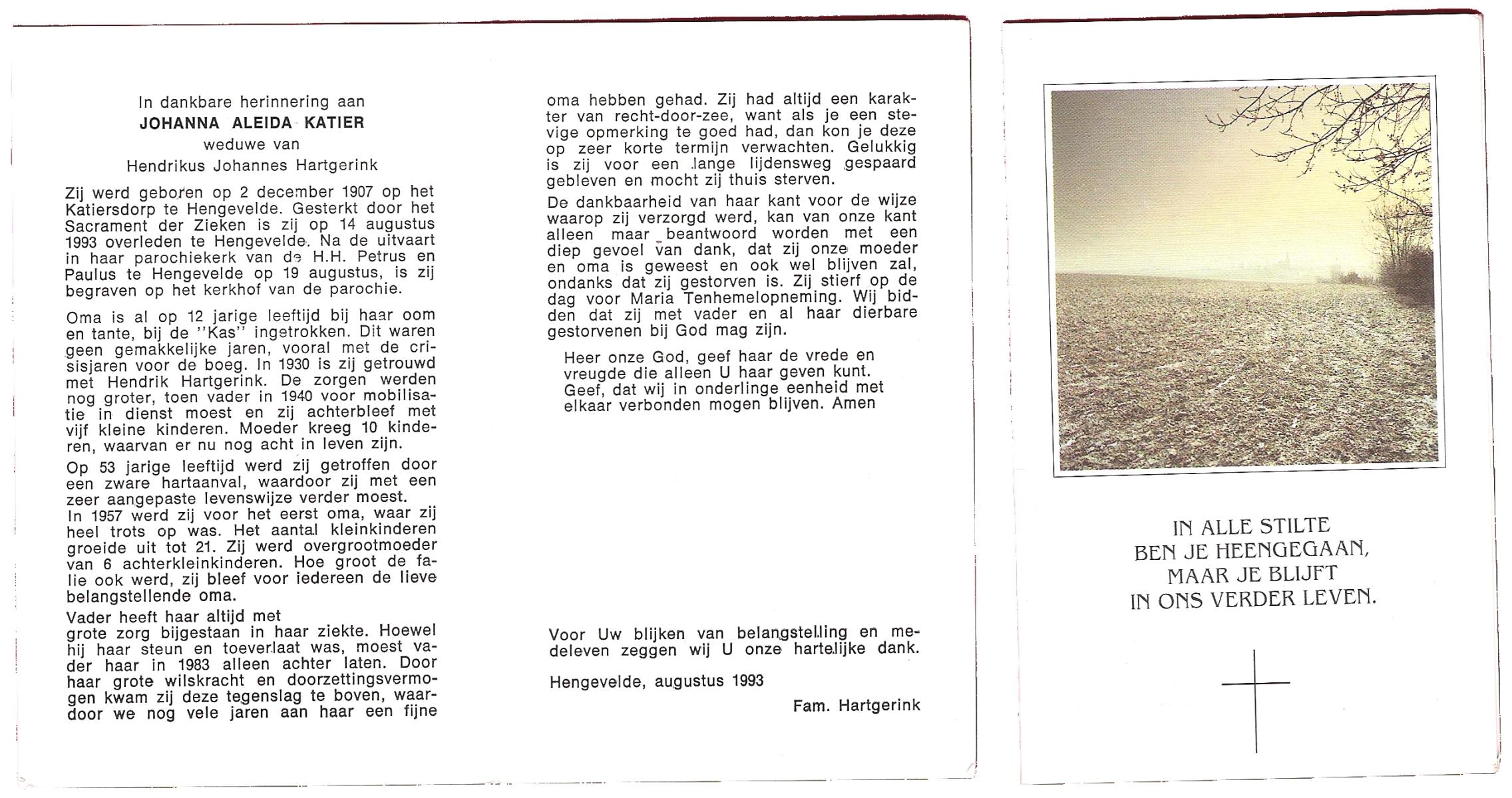 KATIER, Johanna Aleida, geboren op 2-12-1907 te Hengevelde, overleden op 14-8-1993 te Hengevelde op 85-jarige leeftijd, begraven op 19-8-1993 te Hengevelde.