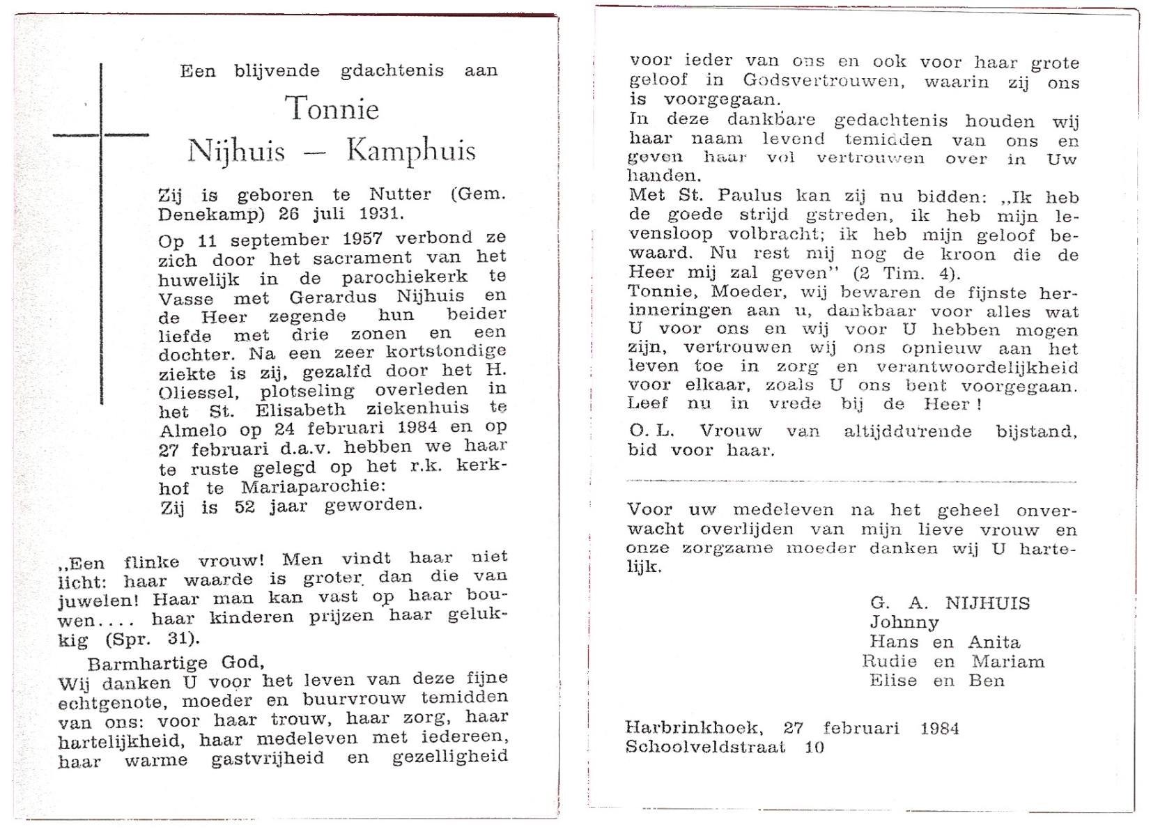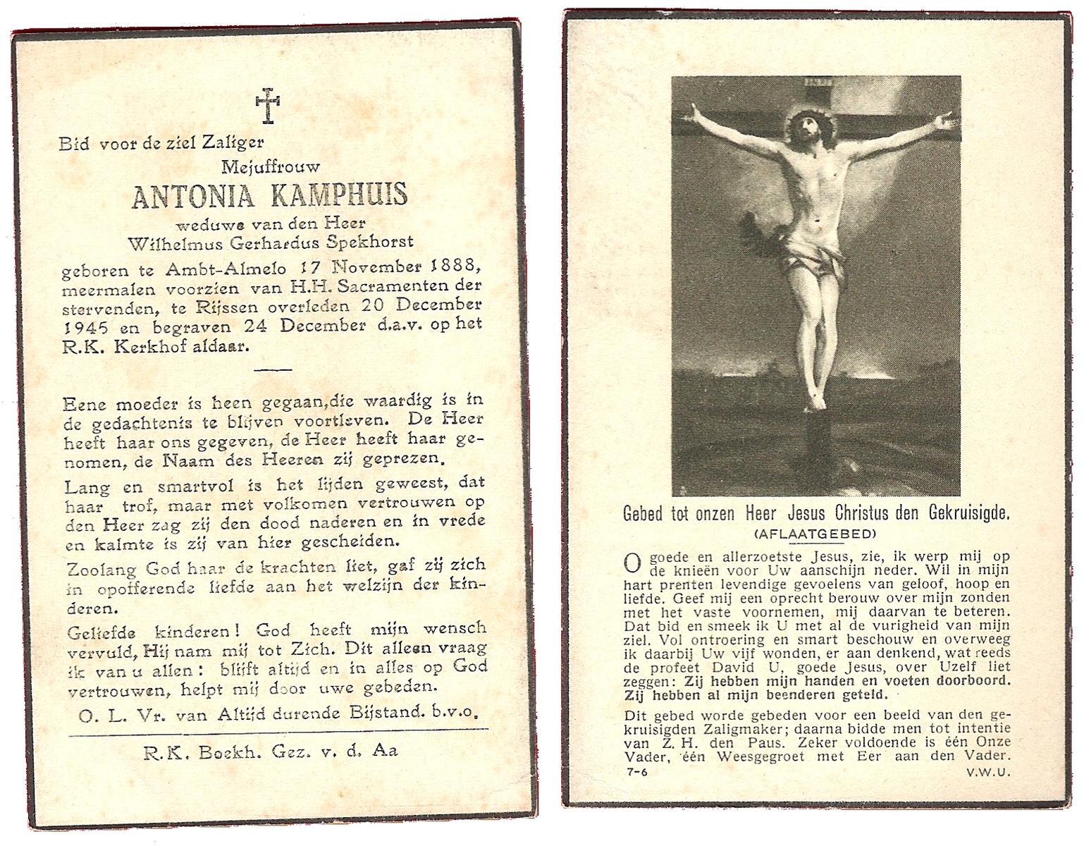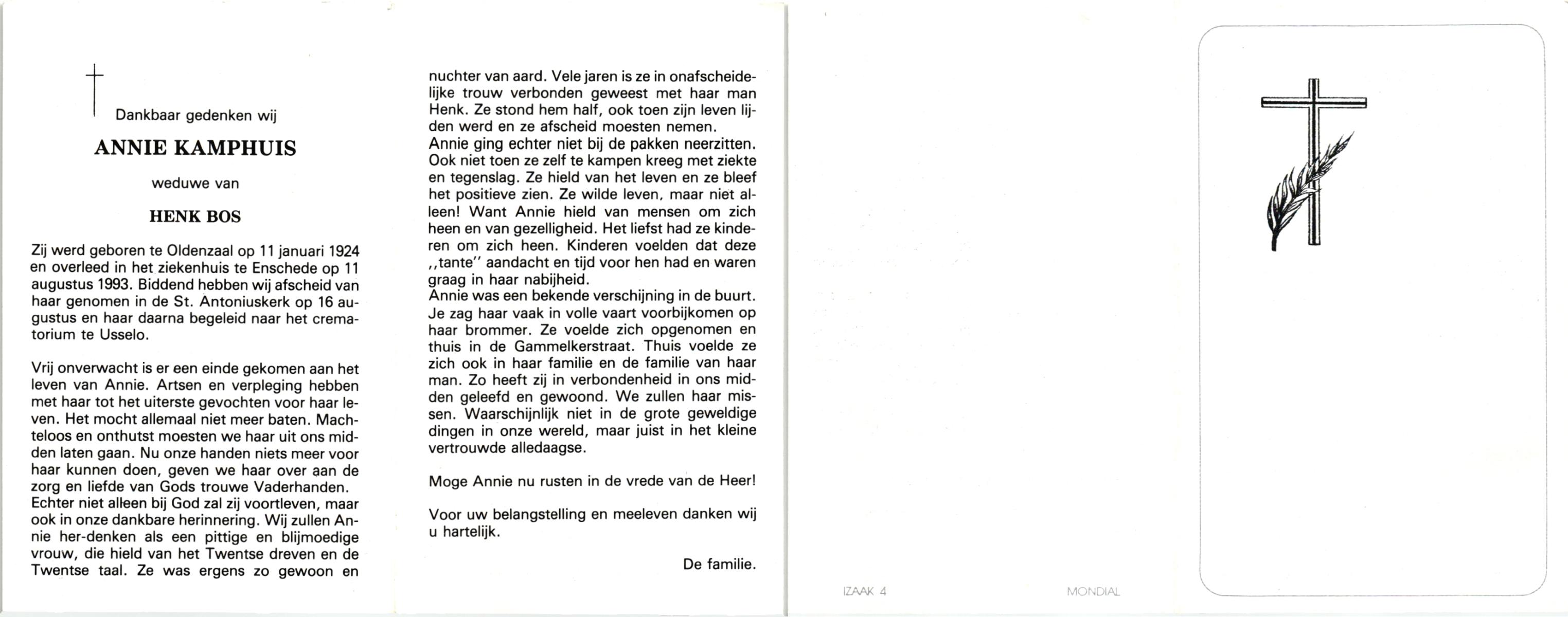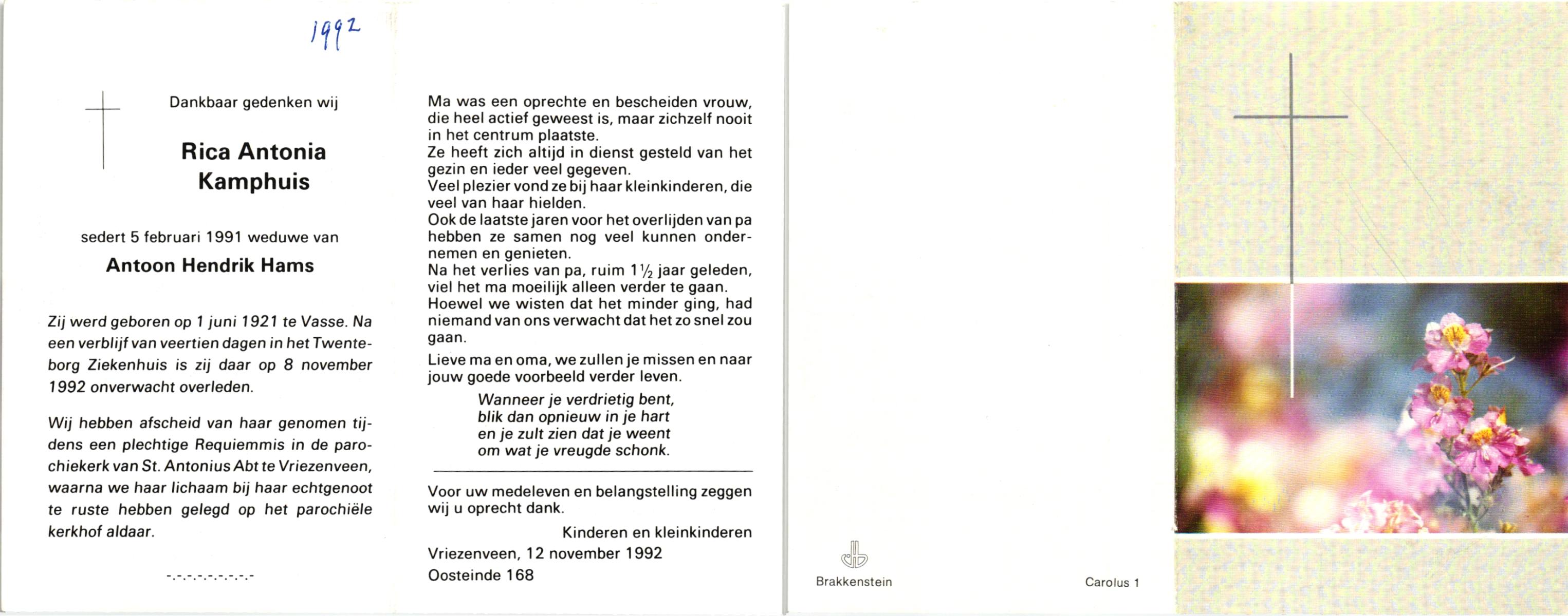 KAMPHUIS, , Rica Antonia, geboren op 1-6-1921 te Vasse, overleden op 8-11-1992 te Almelo op 71-jarige leeftijd.