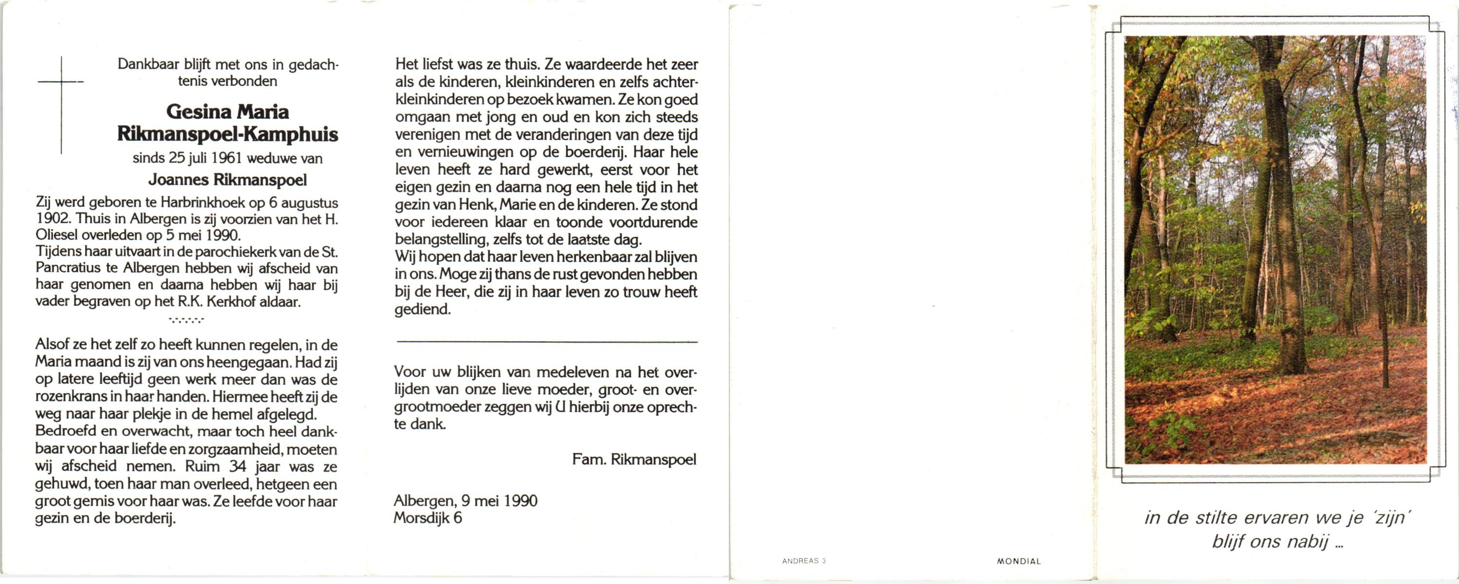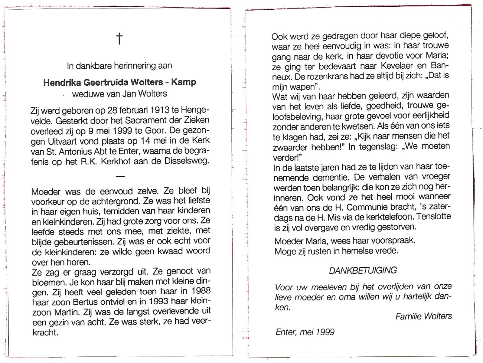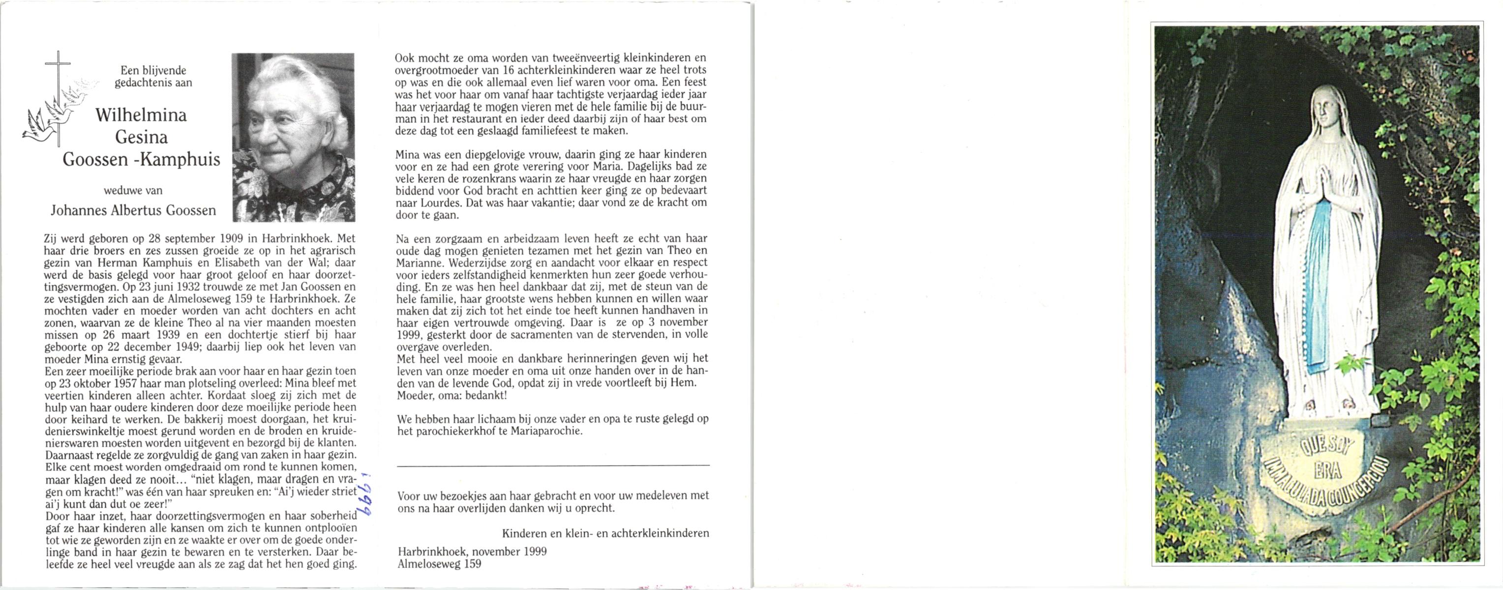 KAMPHUIS, , Wilhelmina Gesina, geboren op 28-9-1909 te Harbrinkhoek, overleden op 3-11-1999 te Harbrinkhoek op 90-jarige leeftijd, begraven te Mariaparochie.