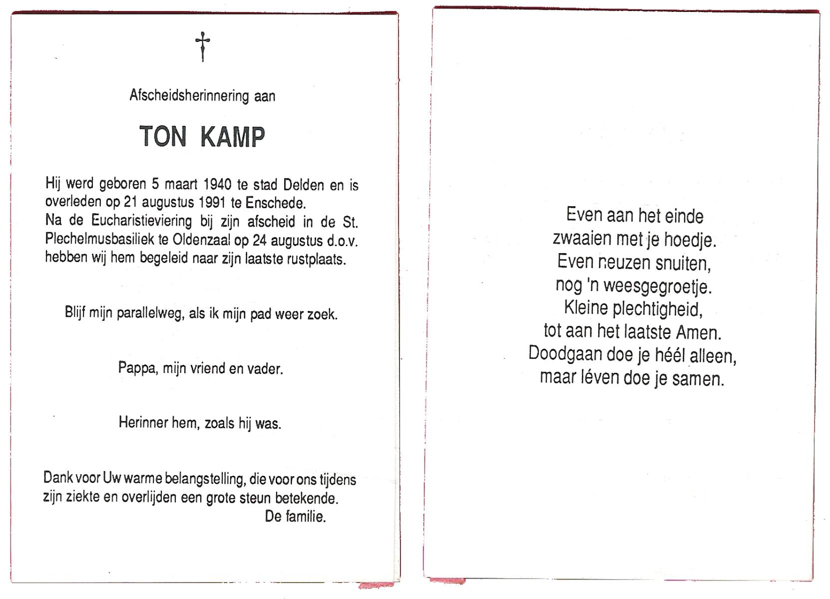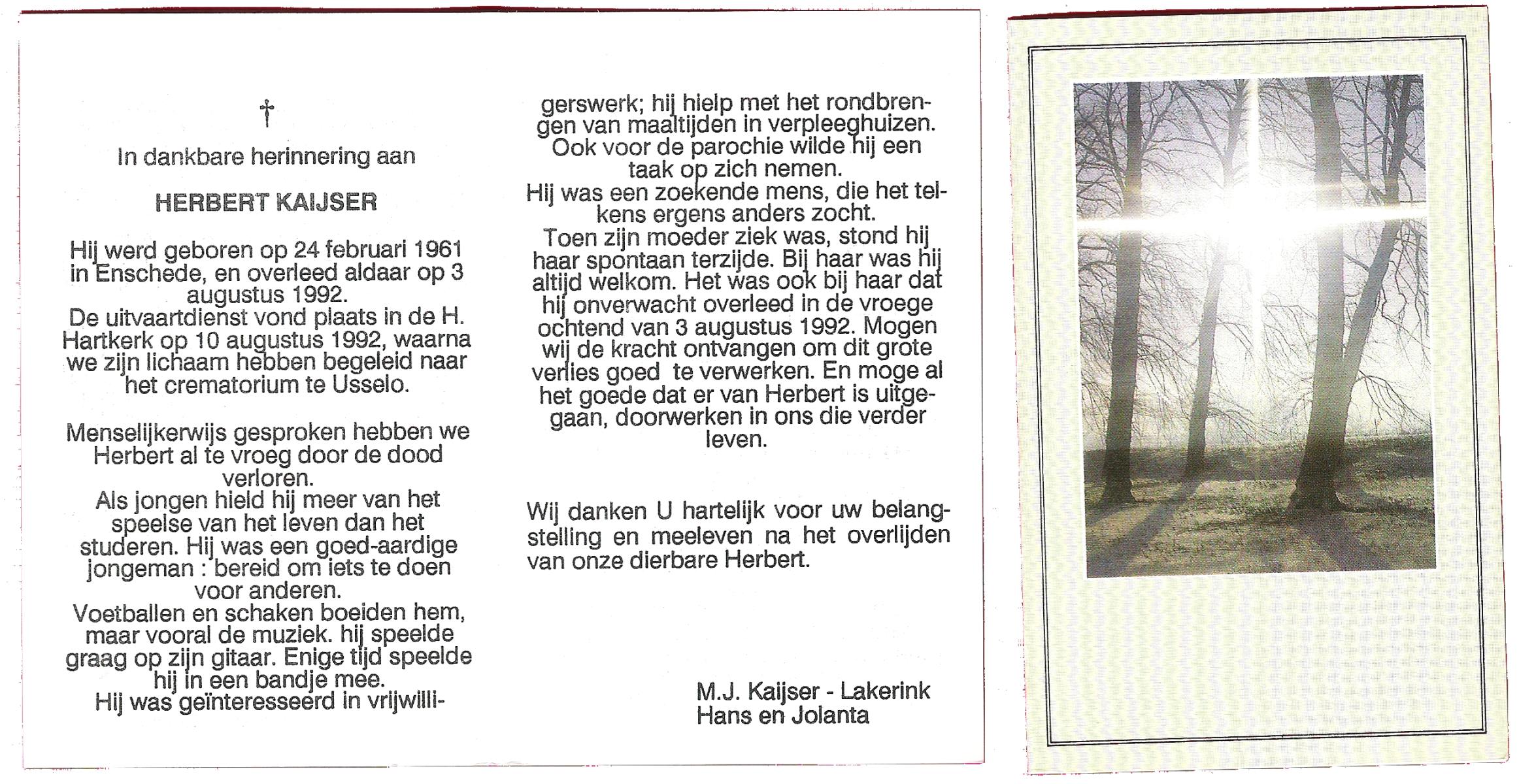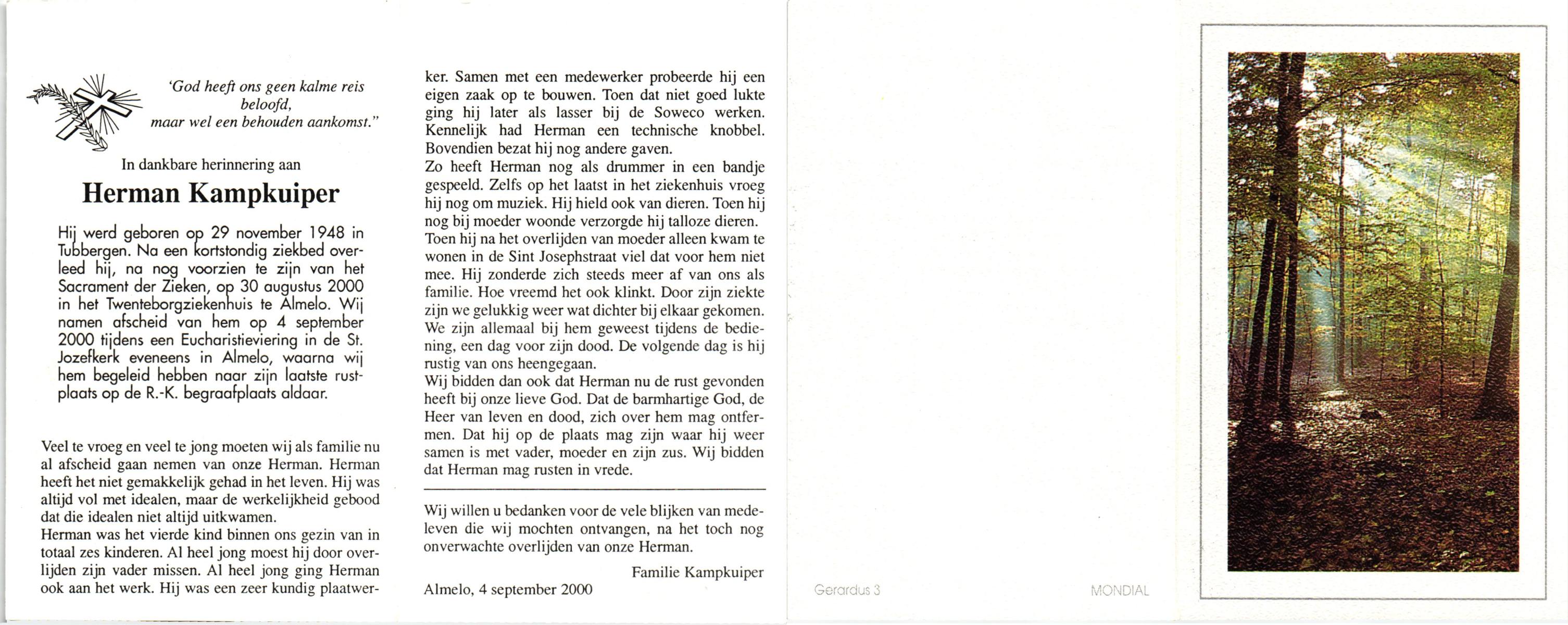 KAMPKUIPER, Herman, geboren op 29-11-1948 te Tubbergen, overleden op 30-8-2000 te Almelo, ziekenhuis op 51-jarige leeftijd, begraven op 4-9-2000 te Almelo, rk.
