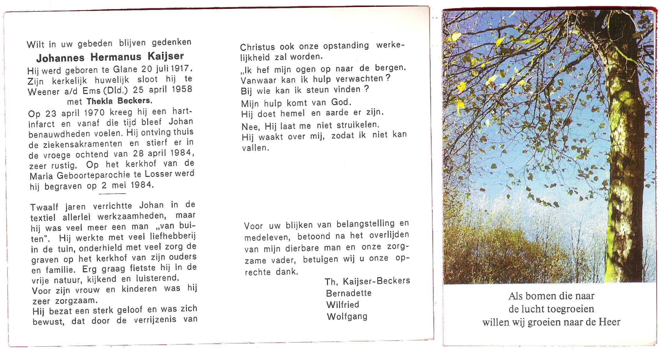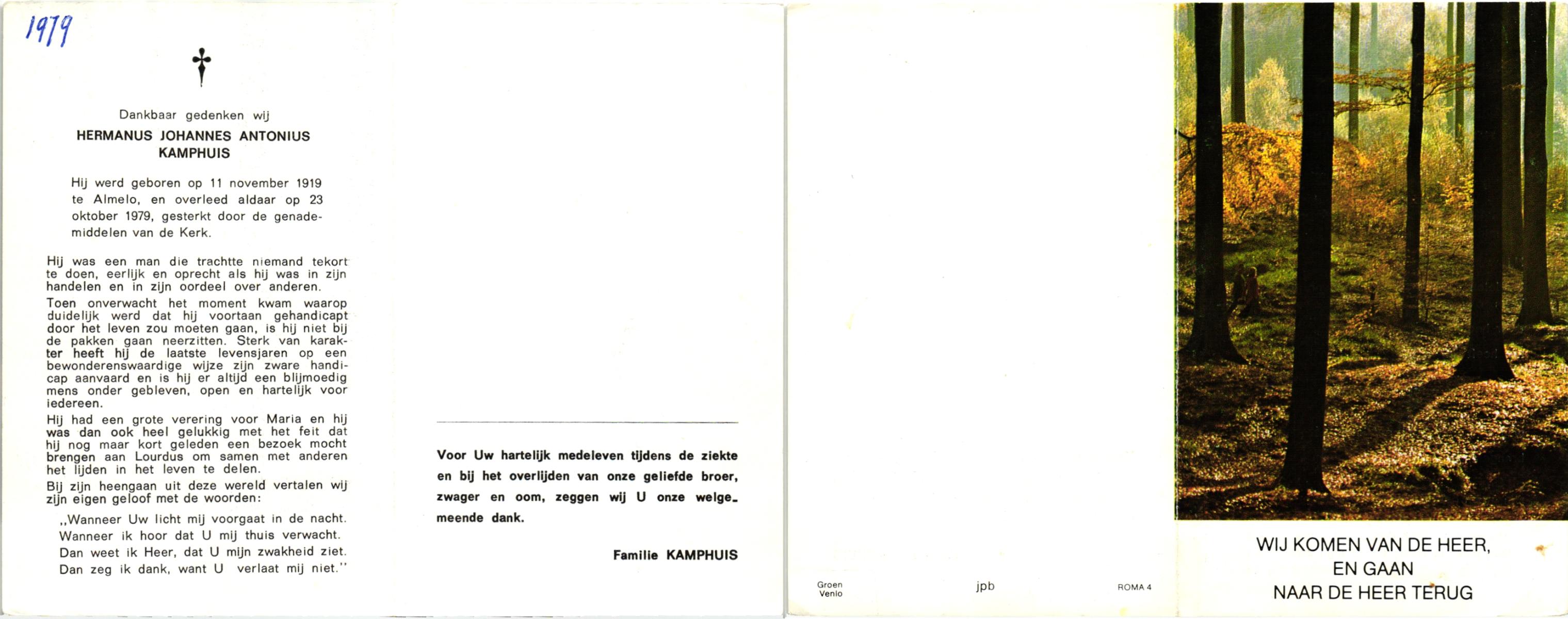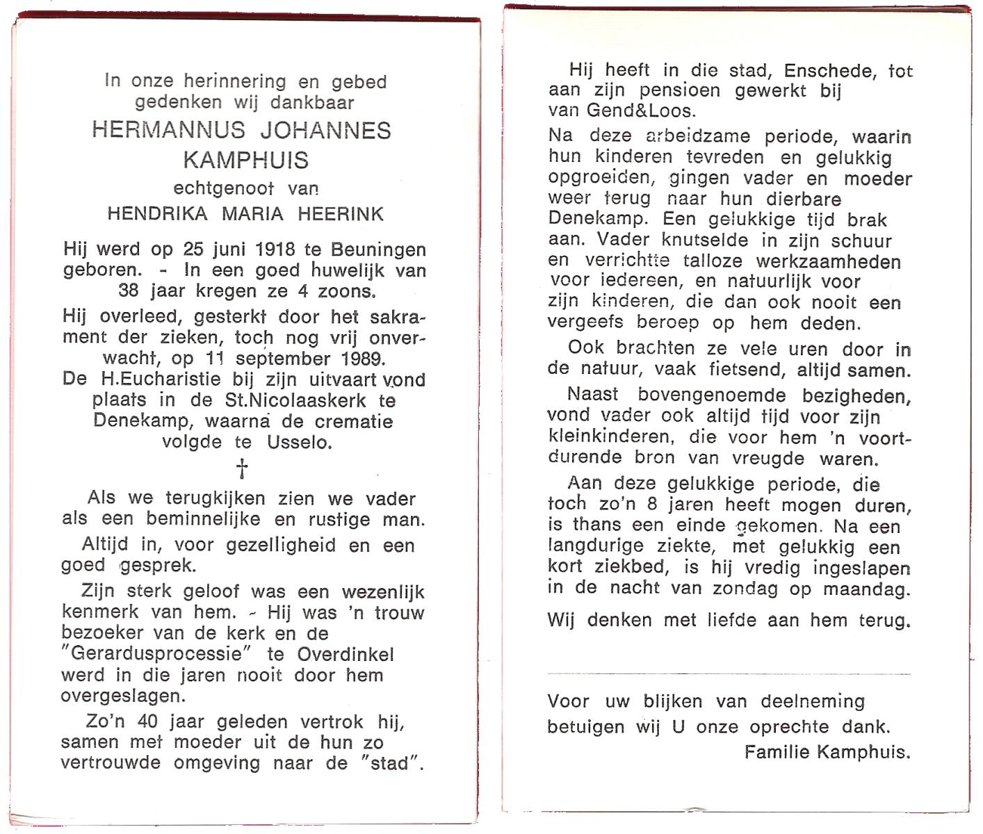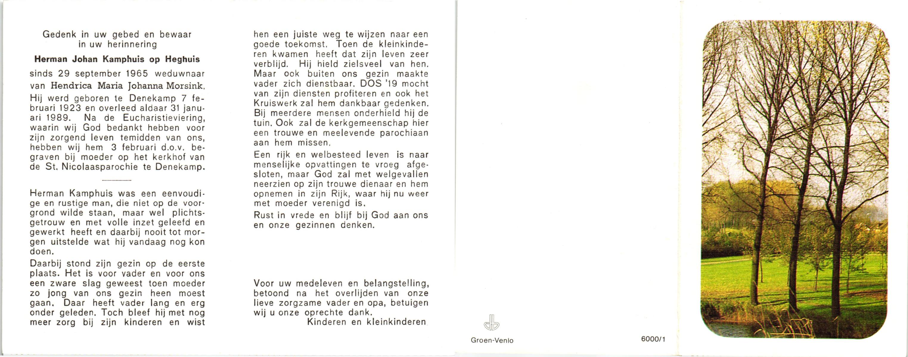 KAMPHUIS op HEGHUIS, Herman Johan, geboren op 7-2-1923 te Denekamp, overleden op 31-1-1989 te Denekamp op 65-jarige leeftijd, begraven op 3-2-1989 te Denekamp.