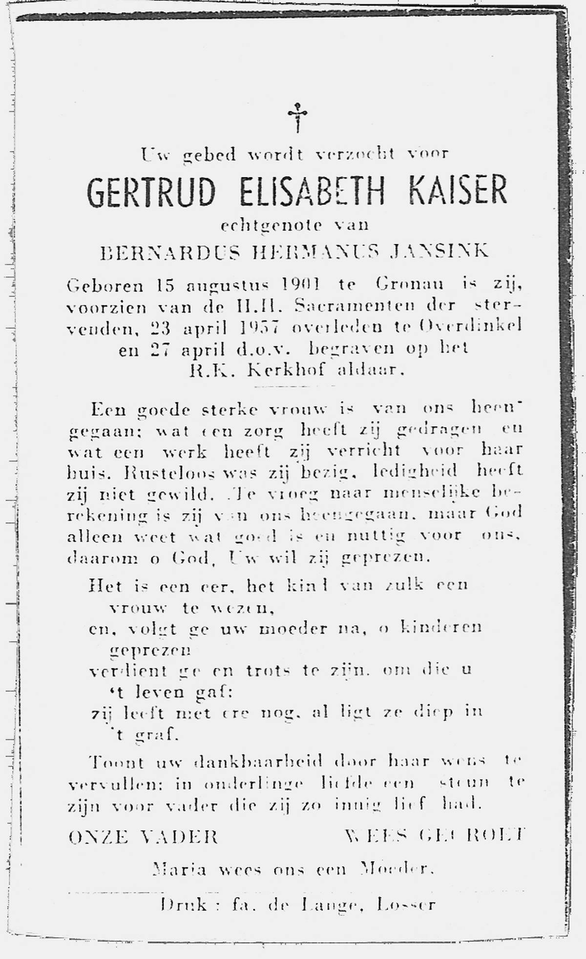 JANSSEN, Geertruida Maria, geboren op 24-12-1896 te Zevenaar, overleden op 21-8-1954 te Almelo op 57-jarige leeftijd, begraven op 24-8-1954 te Almelo.