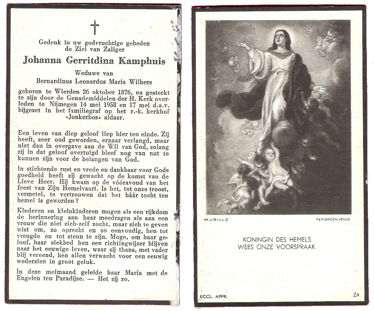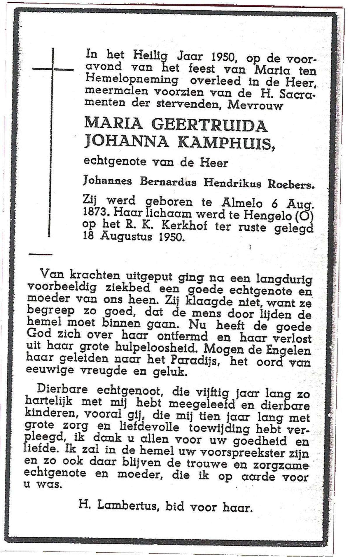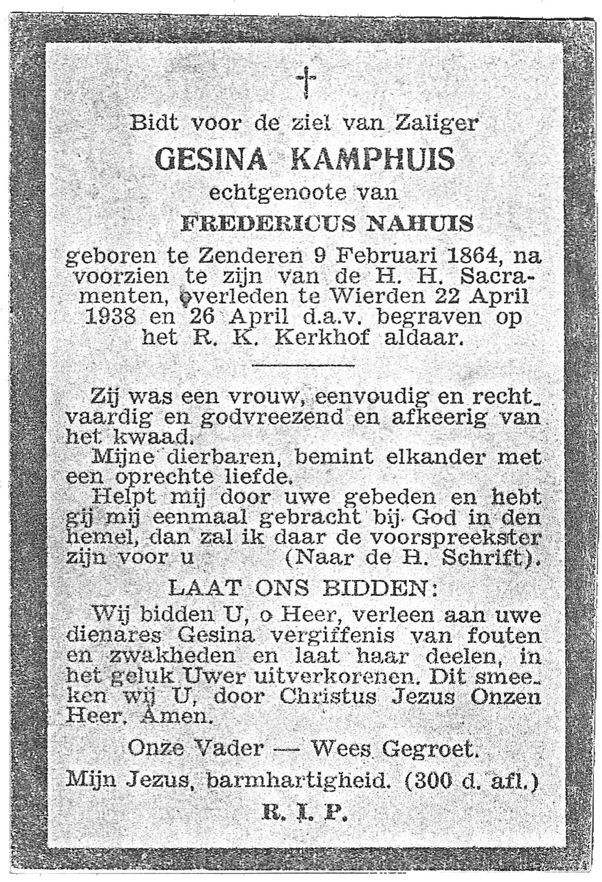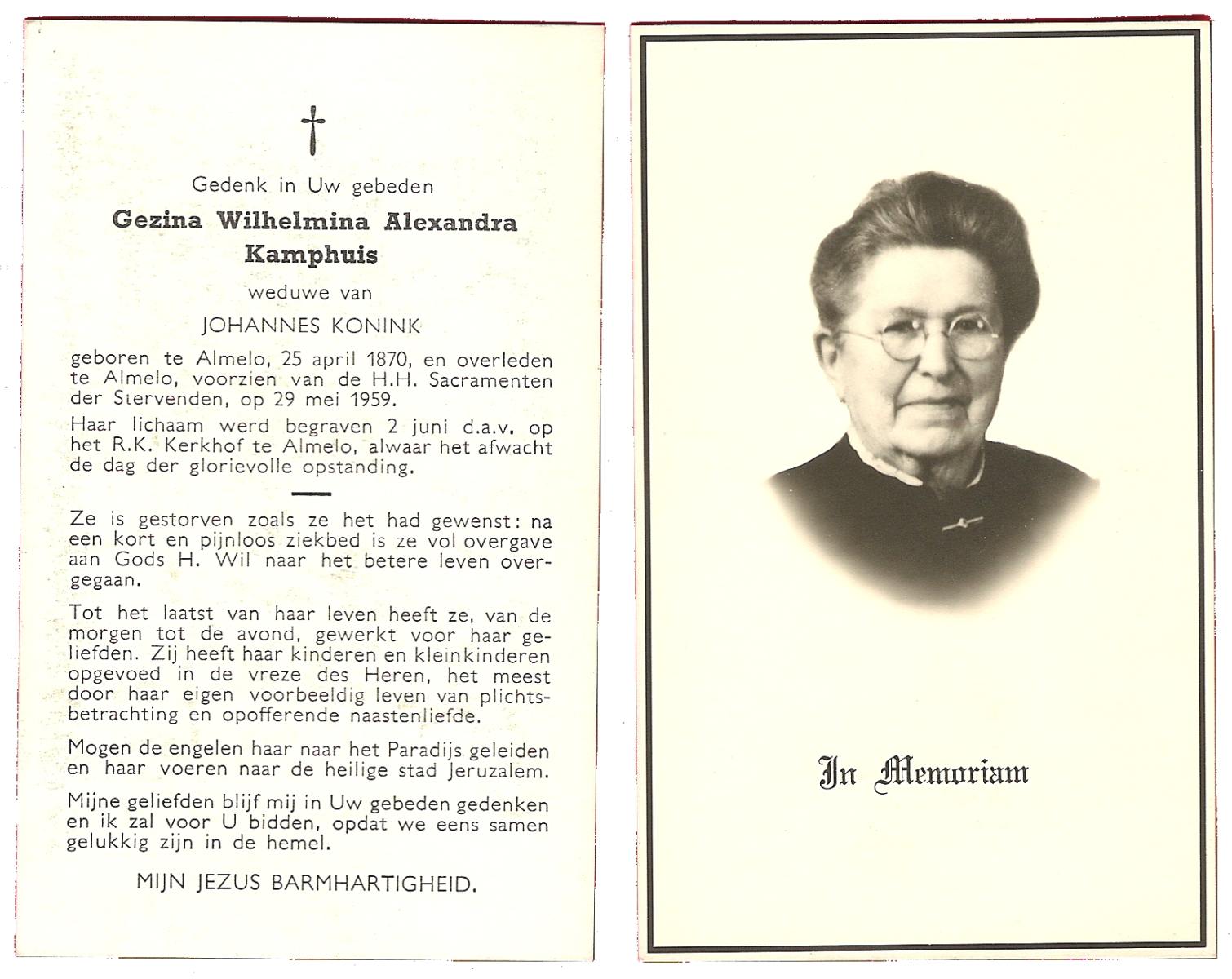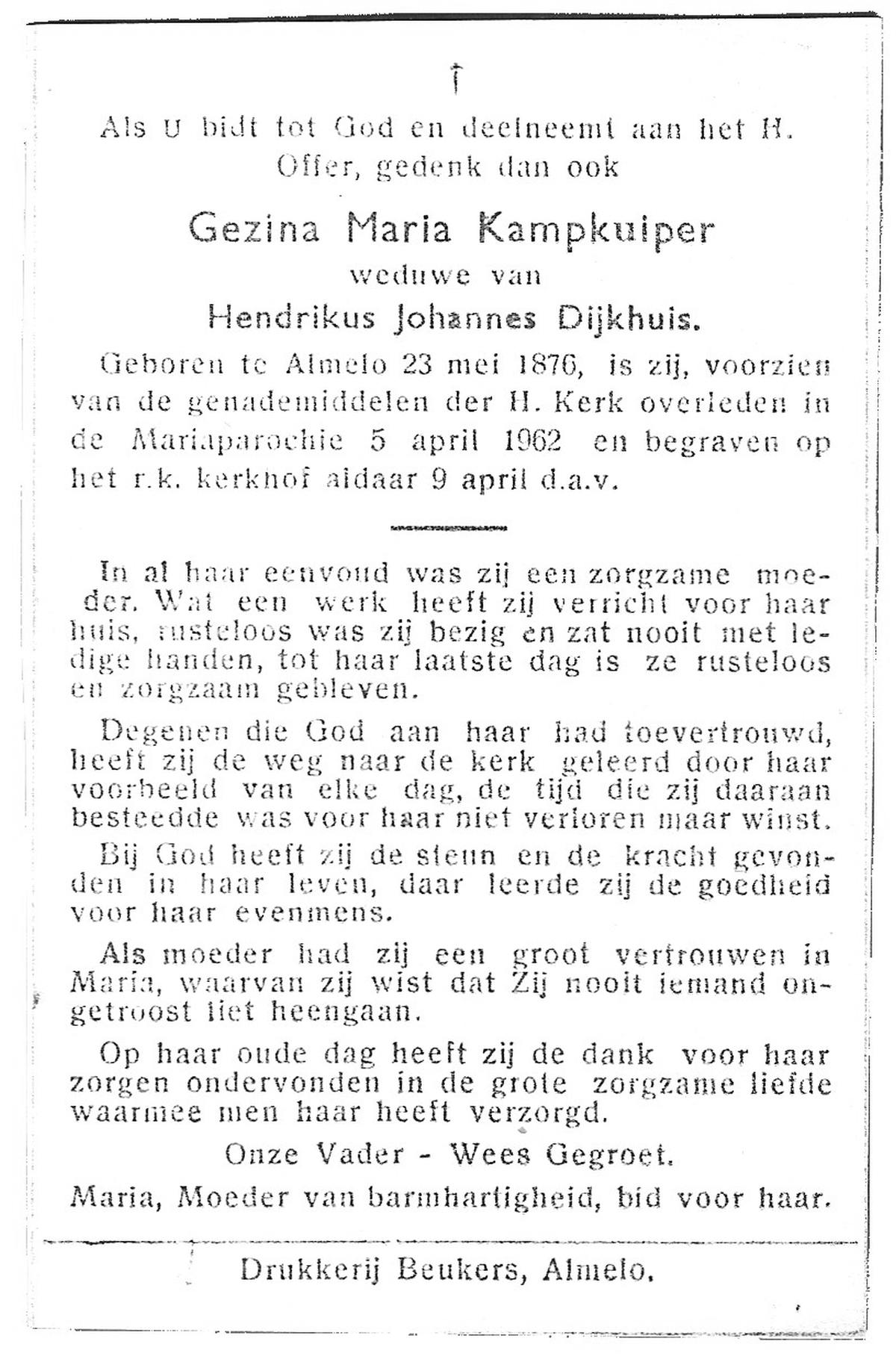 KAMPKUIPER, Gezina Maria, geboren op 23-05-1876 te Almelo, overleden op 5-4-1962 te Mariaparochie op 85-jarige leeftijd, begraven op 9-4-1962 te Mariaparochie.